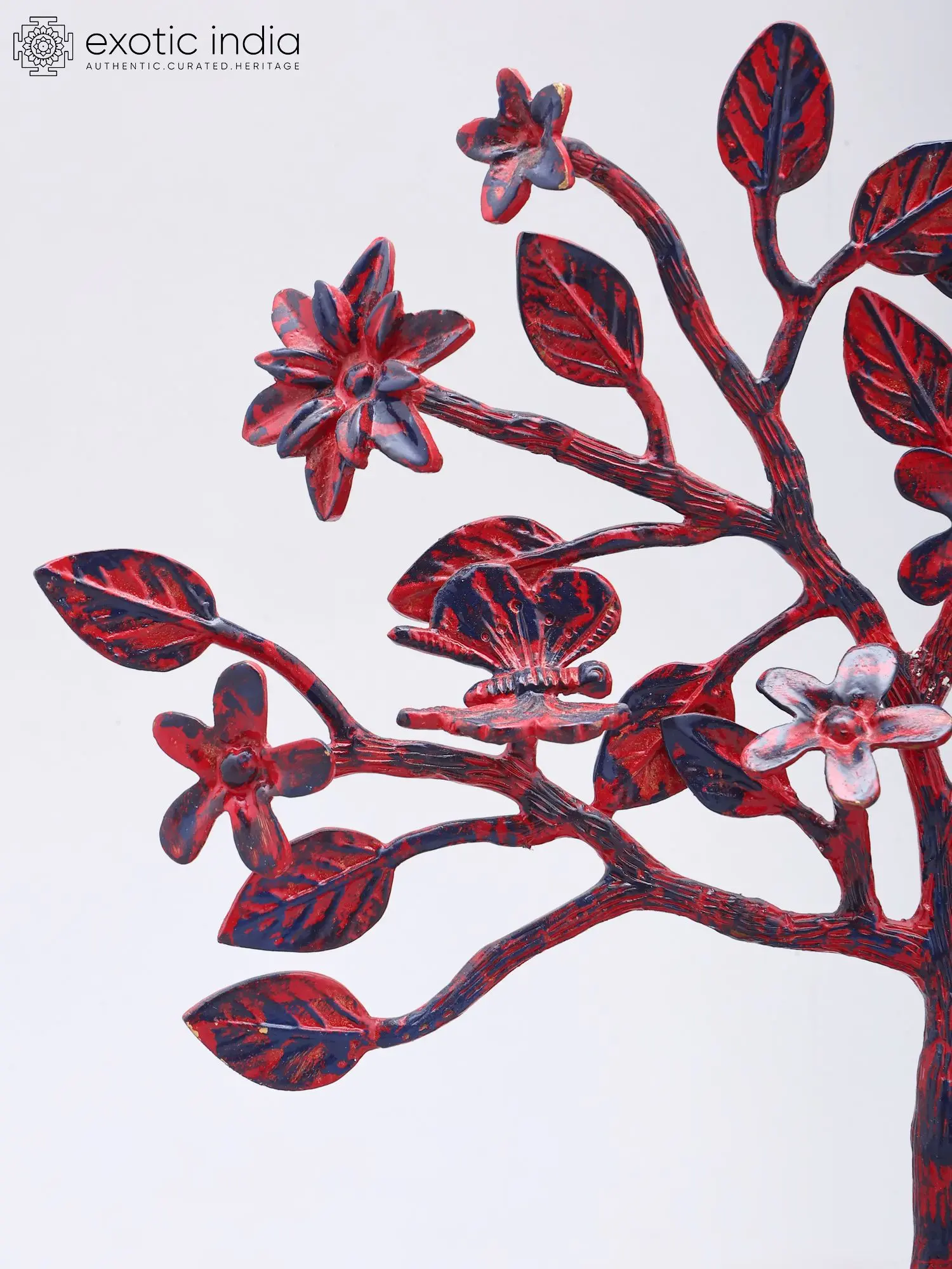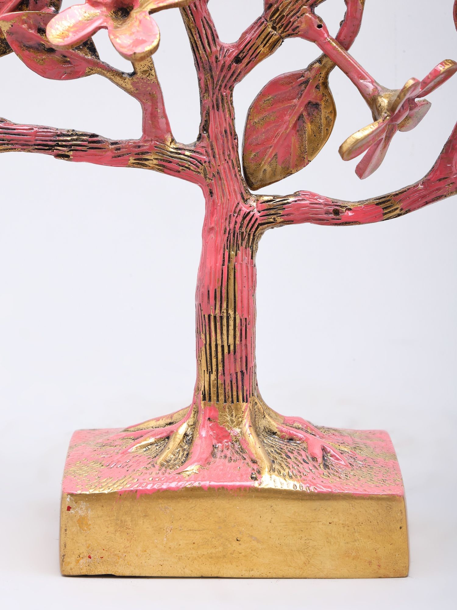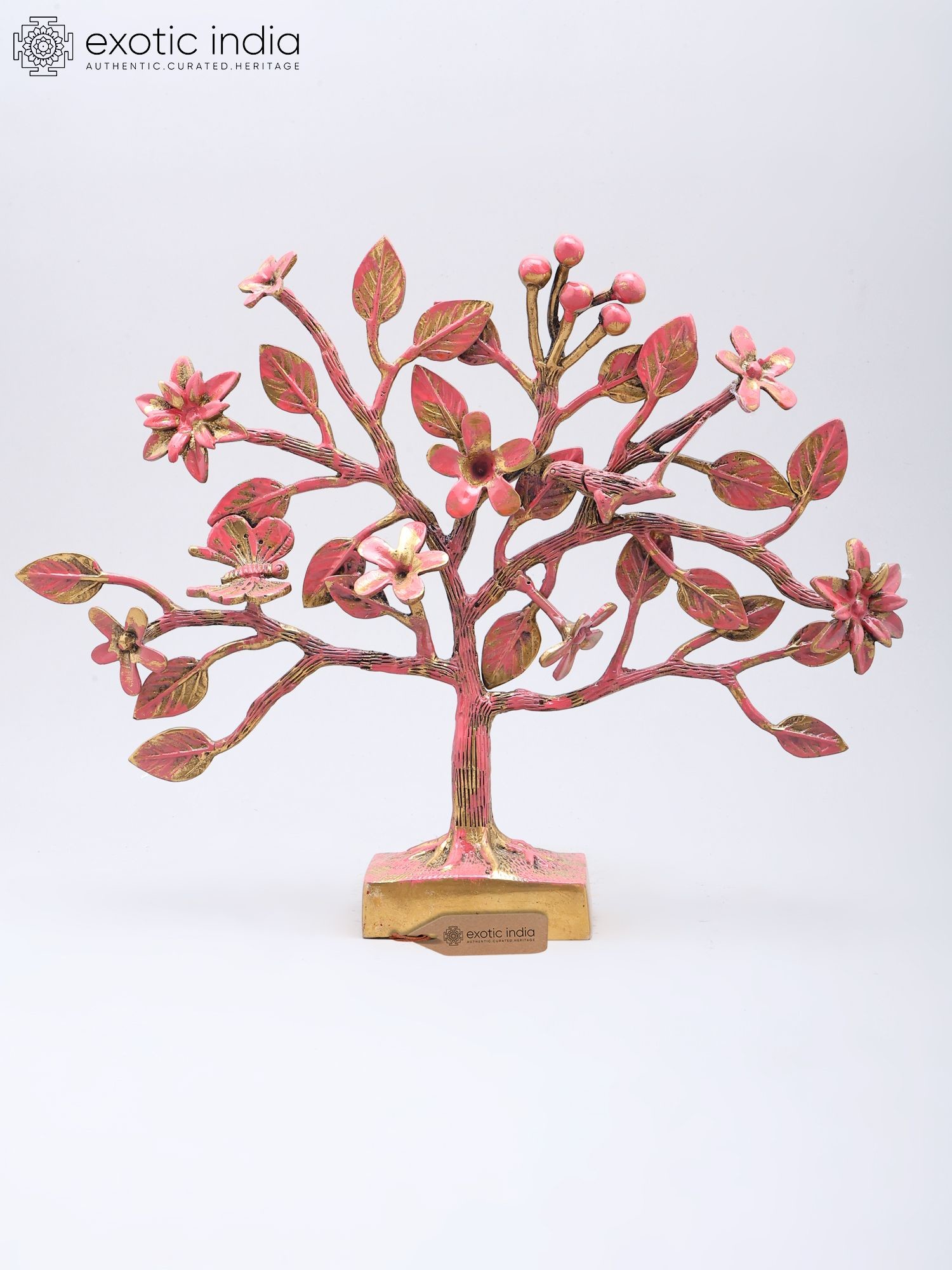 Standing at ten inches tall with a graceful spread of thirteen inches and a depth of three inches, its dimensions create a captivating presence without overpowering your decor. The textured brass, finished with a harmonious blend of soft pink and antique gold, imparts a vibrant yet sophisticated aura. Delicate flowers and intricate leaves, some adorned with tiny, life-like butterflies, draw the eye and invite closer inspection.