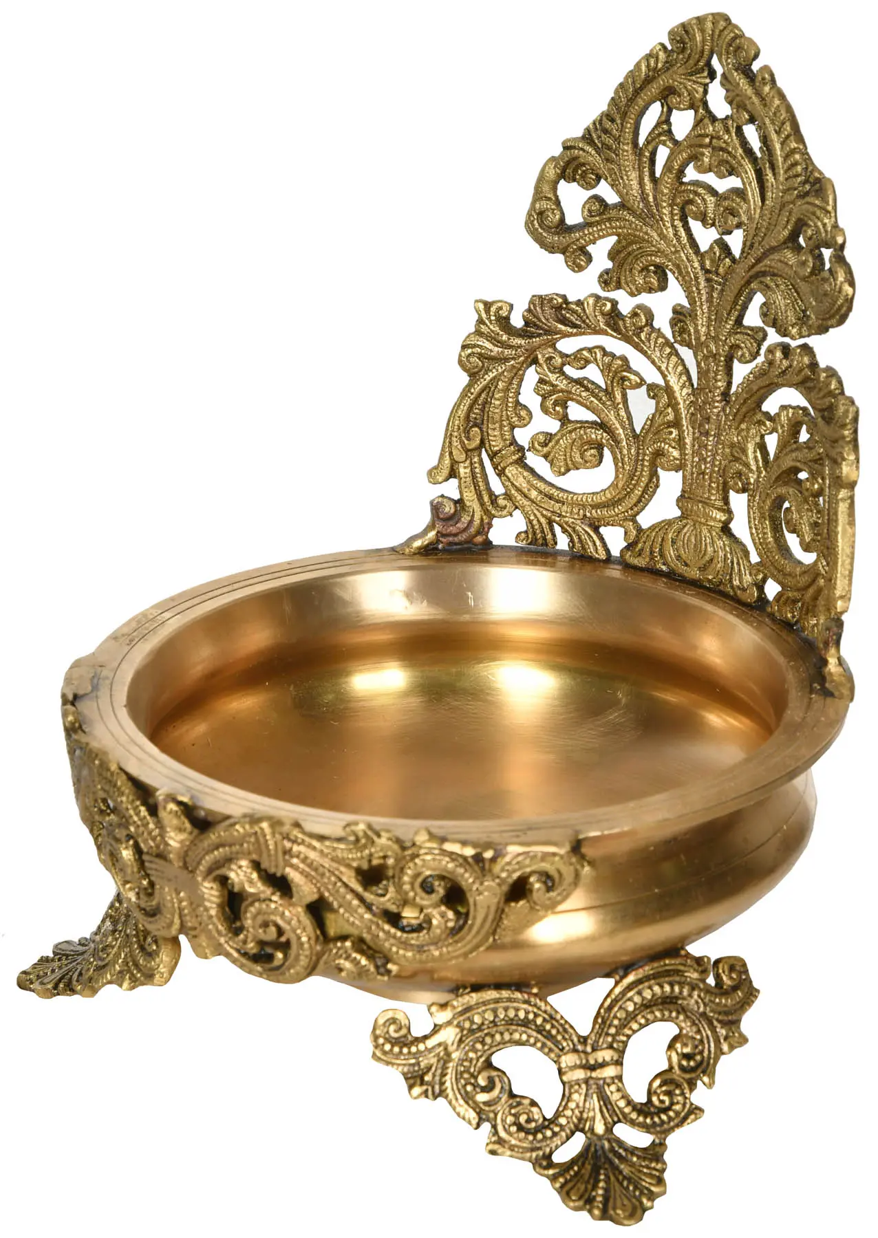 The artists of this brass urli have tried to introduce the beholder to the enigmatic feeling of witnessing the magnificent style of the Hoysala art that is prominent on the walls and sculptures of the temples of Helibidu and Belur. This Urli with a simple body carries a crown of coiled vines and a batch of the same pattern on its chest. The main structure is typical with a shallow container and a wide mouth. The stands are ornate and make the decoration complete. The brass used for the construction of this piece is of high quality and makes this piece an object of generational pride.