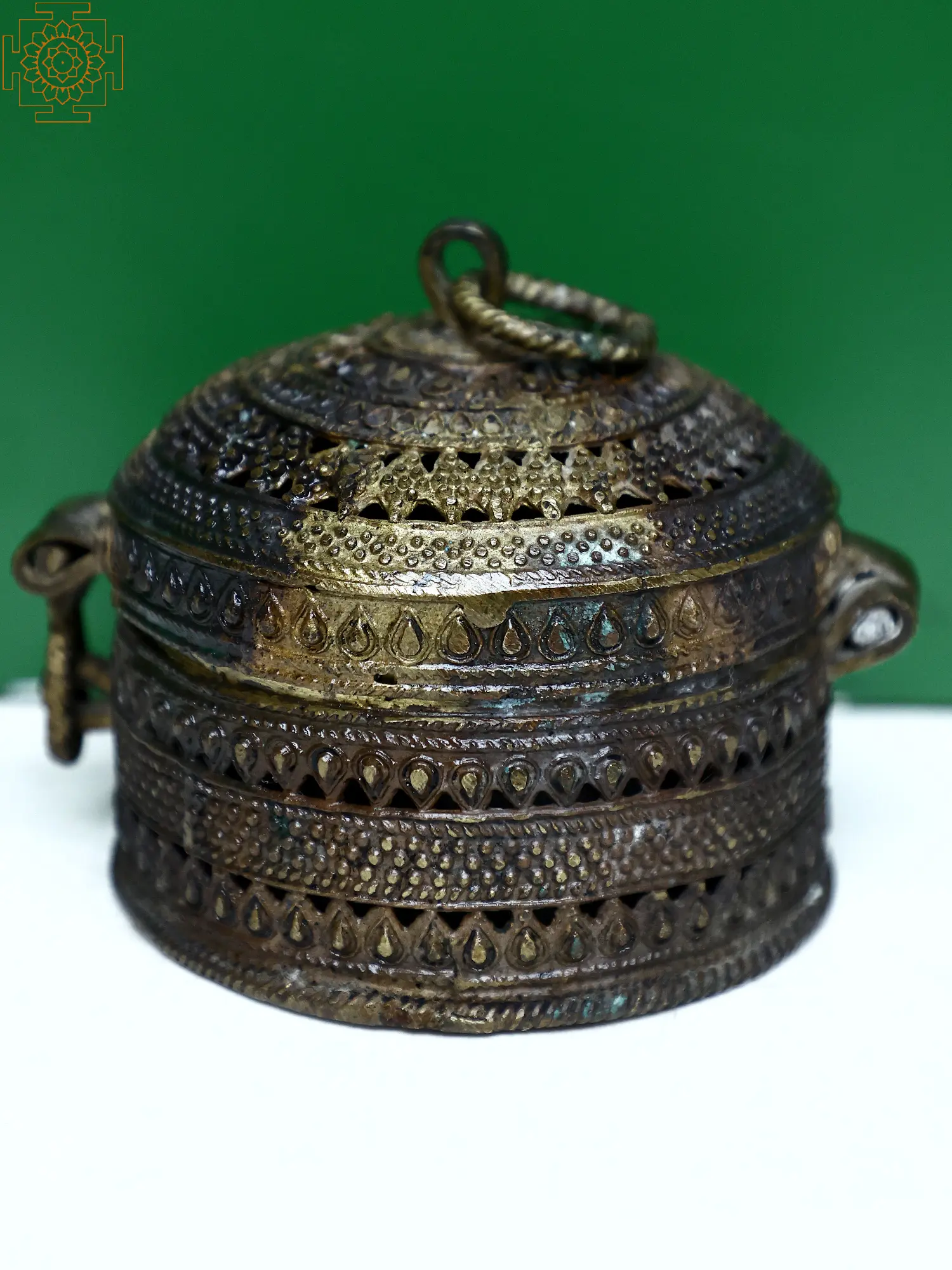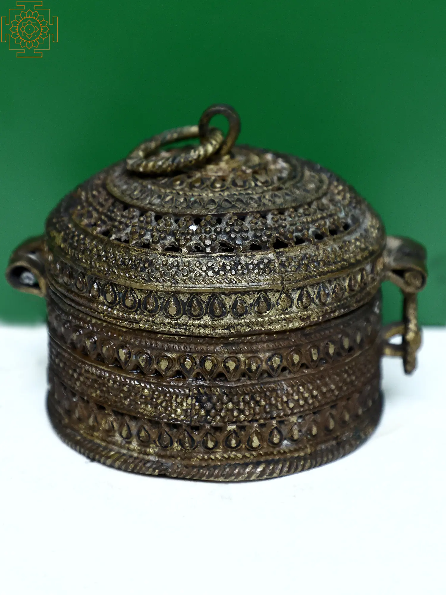 “Shringaar Daan” (shringaar- jewelry, Daan- box) or Vanity box in Indian culture is not just a place to keep your jewels; it is also a treasure trove of stories, romances, and beautiful anecdotes. The anklet gifted by a Premi (lover), the bangles given by a Sakhi (friend), or the Haar (necklace) passed on by the mother, a jewelry box holds deep in its heart not just ornaments, but also emotions. Exotic India Art brings to you this brass vintage jewelry box to store your favorite gems and the stories around them.