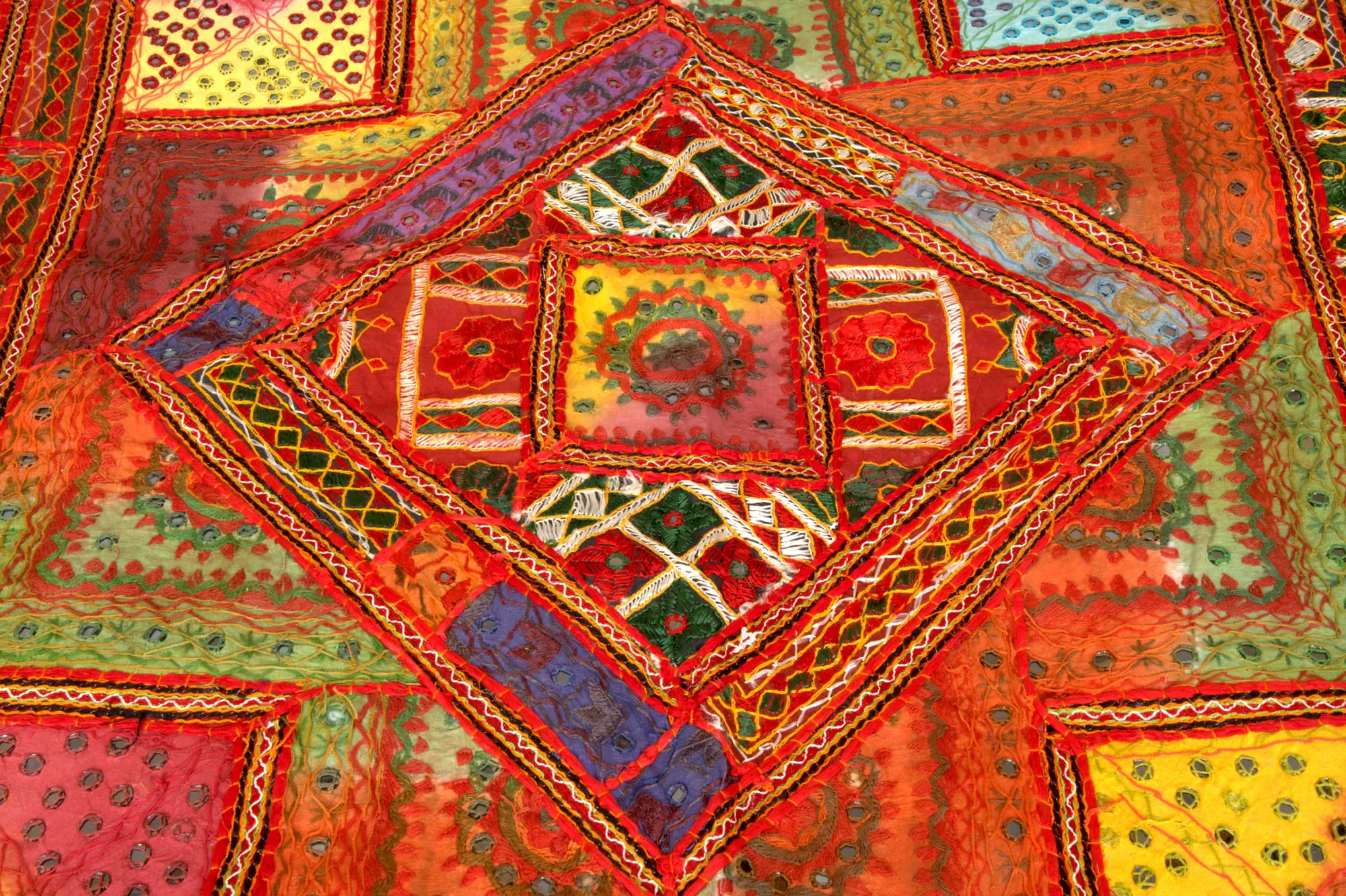 Transform your bedroom into a haven of vibrant color and intricate detail with this bedspread. Evoking the rich textile traditions of Gujarat, India, it's more than just bedding; it's a work of art that tells a story. Each thread, each tiny mirror, reflects the skill and dedication of the artisans who painstakingly crafted this piece. The bedspread showcases a captivating patchwork design. A beautiful medley of patterns and colors is created by stitching together different pieces of pure cotton fabric. You'll find a captivating interplay of geometric shapes – squares, triangles, diamonds – all arranged in a mesmerizing mosaic.
