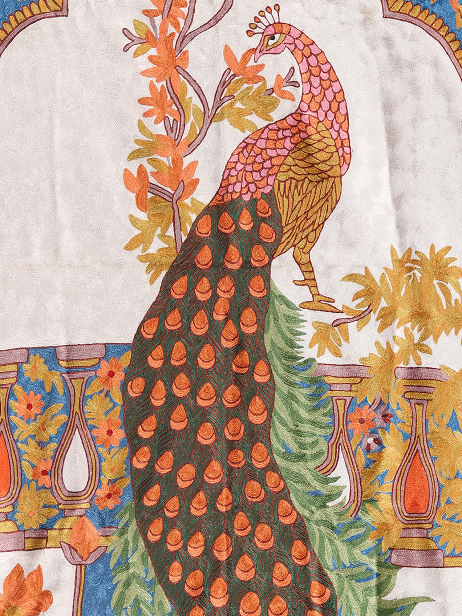 Meticulously crafted from canvas, this wall hanging showcases the stunning artistry of chainstitch embroidery using fine silk threads. Every stitch is carefully placed, bringing the magnificent peacock design to life with remarkable depth and texture. The bright-white canvas provides a perfect backdrop for the vibrant hues of the silk, creating a visually striking contrast. The peacock, a symbol of beauty, grace, and immortality, is depicted with impressive detail, its plumage resplendent in a palette of rich colors. The surrounding floral and architectural motifs add layers of complexity and visual interest, making this piece a true work of art.