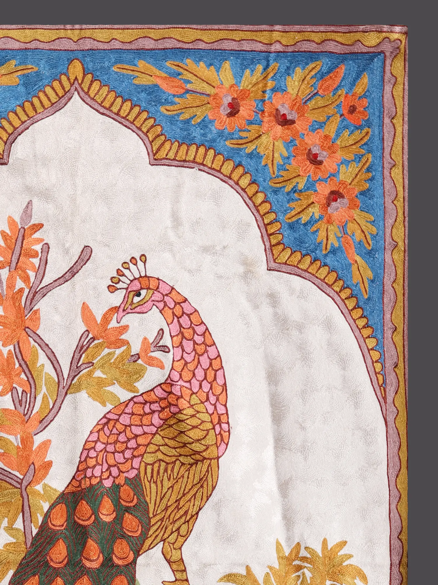 Bright-White Chainstitched Peacock Wall Hanging from Kashmir