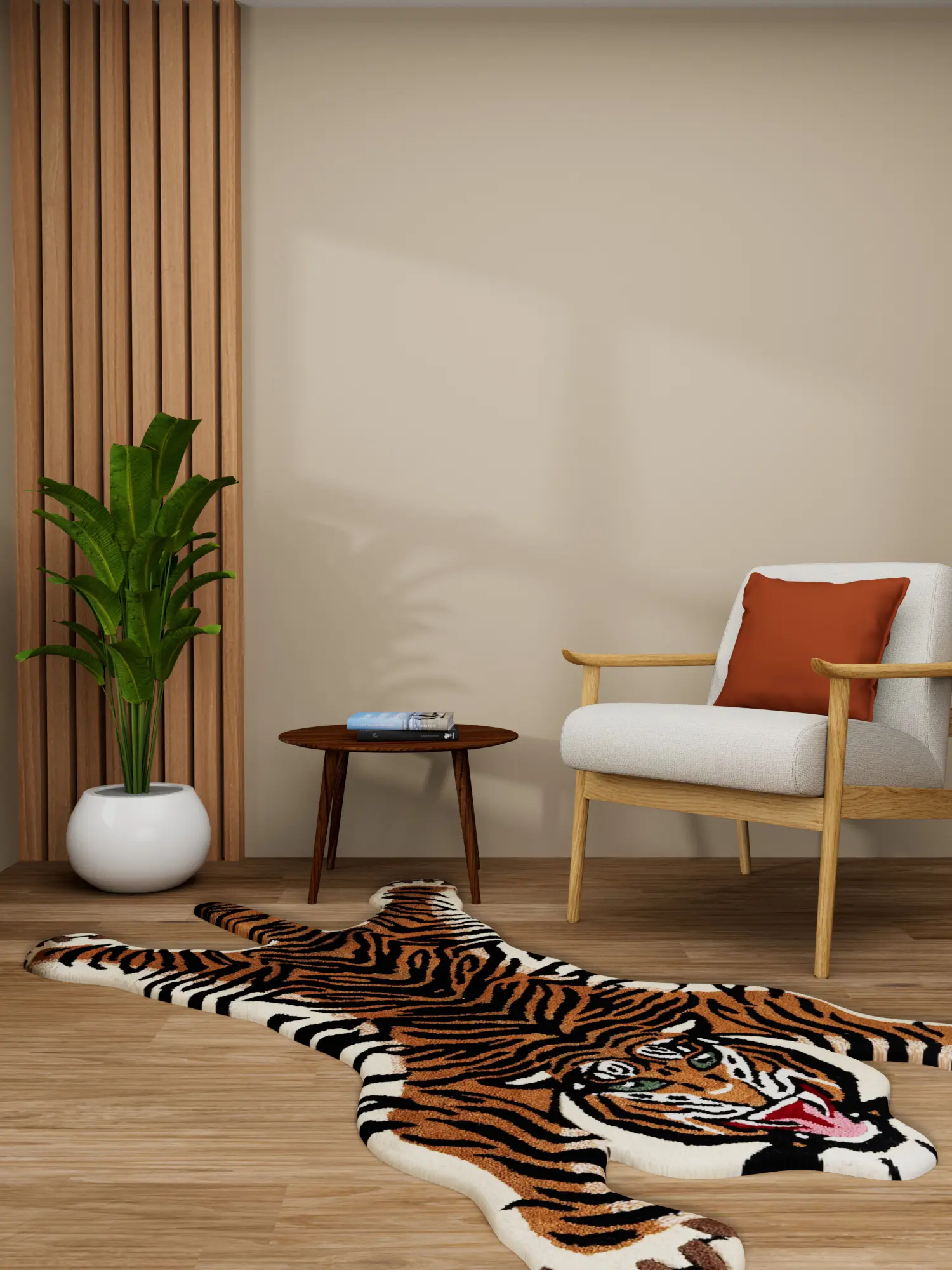 Transform your space into a palace interior with this Brown-Sugar Tibetan Tiger Shaped Handmade Tufted Mat from Mirzapur. Recreating the powerful jump of a tiger, the mat carries an energetic aesthetic, making it much more than a simple decor. Crafted from luxurious cotton and wool, it offers unparalleled warmth and comfort.