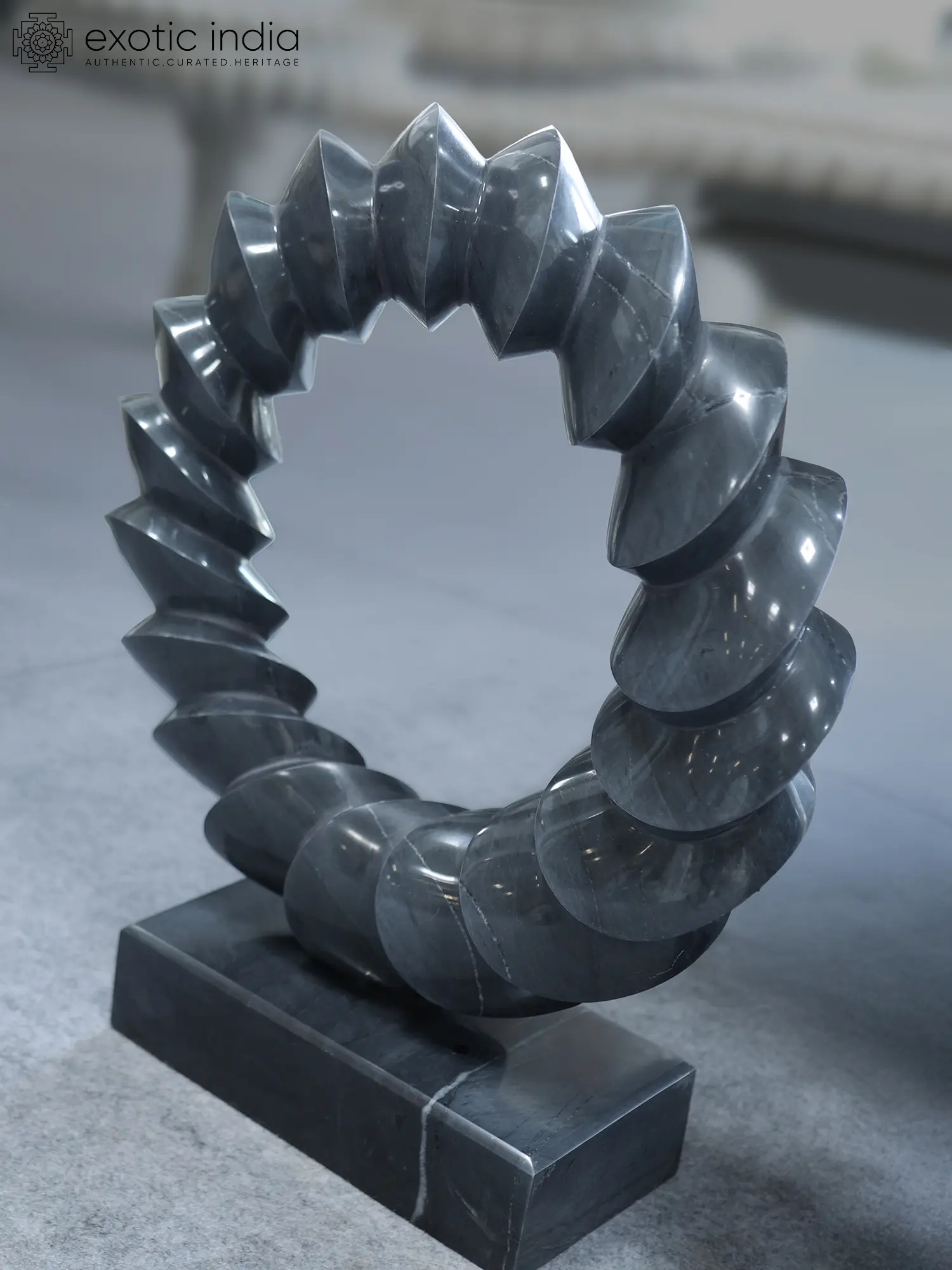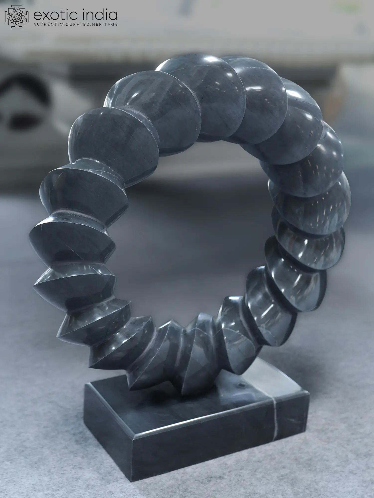 This marble form rests in a continuous rhythm, shaped as if motion itself has been paused and polished. The ring is built from a sequence of rounded segments, each swelling and receding like a breath held gently in stone.