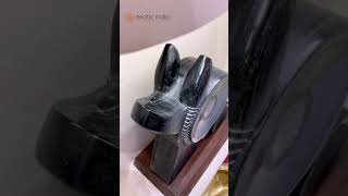 This granite sculpture standing on a wood pedestal is part of the bull series and is an excellent example of creative arts. Chiselling has provided the statue's distinguishing features, which are a mix of white and black. The image of a bull's head represents the nature of aggression as well as determination to attaining one's goals. The bull's huge eyes represent focus, and the slanting face provides the impression of charging the target with full intensity. This amazing sculpture draws people's attention and pushes them to keep moving forward in order to achieve their mark.