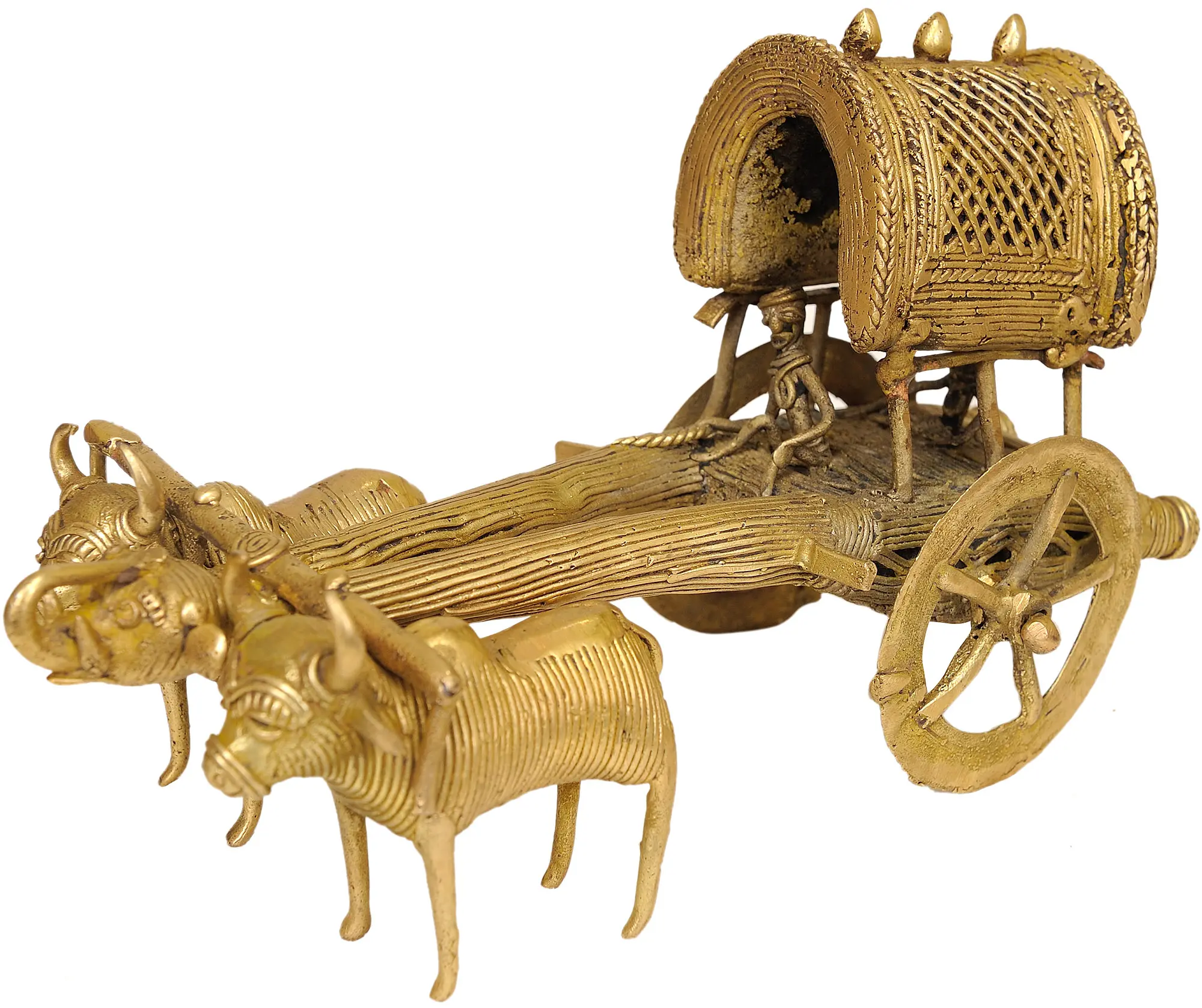 Notice the lifelike rendering of the bullocks, each with distinct features that evoke their strength and gentle nature. The wheels of the cart are meticulously designed, adding to the authenticity of the piece. The driver is carefully placed on the cart, ready to make his journey. The handcrafted texture of the canopy offers a tactile experience. This piece speaks to a simpler way of life. The statue has been rendered using lost wax casting, also known as cire-perdue, one of the oldest known metal-forming techniques.