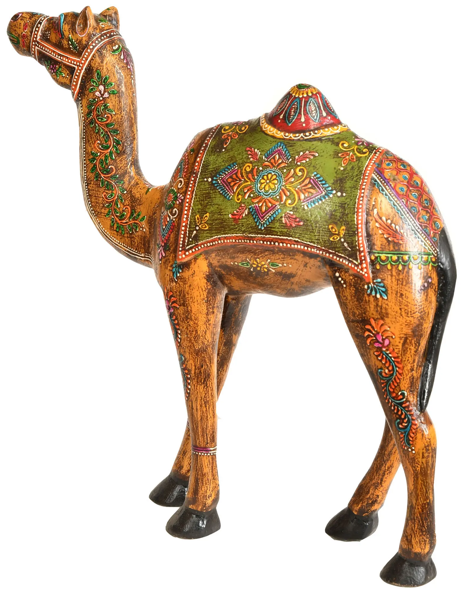 Bring the vibrant spirit of Rajasthan into your home with this intricately crafted wooden sculpture. More than just a decorative piece, this is a celebration of Indian artistry and a testament to the rich cultural heritage of the region. The warm hues of the wood, combined with the dazzling hand-painted details, evoke the sun-drenched landscapes and bustling marketplaces of Rajasthan. Each brushstroke tells a story, capturing the essence of this enchanting land. The striking details are carefully rendered, from the gentle curve of the neck to the delicate patterns adorning its body. The use of vibrant colors like greens, reds, pinks, and blues adds an element of joy and festivity. The sculpture's presence will liven up any room, infusing it with a touch of exotic charm. This sculpture is sure to be a conversation starter and a cherished addition to your home decor.