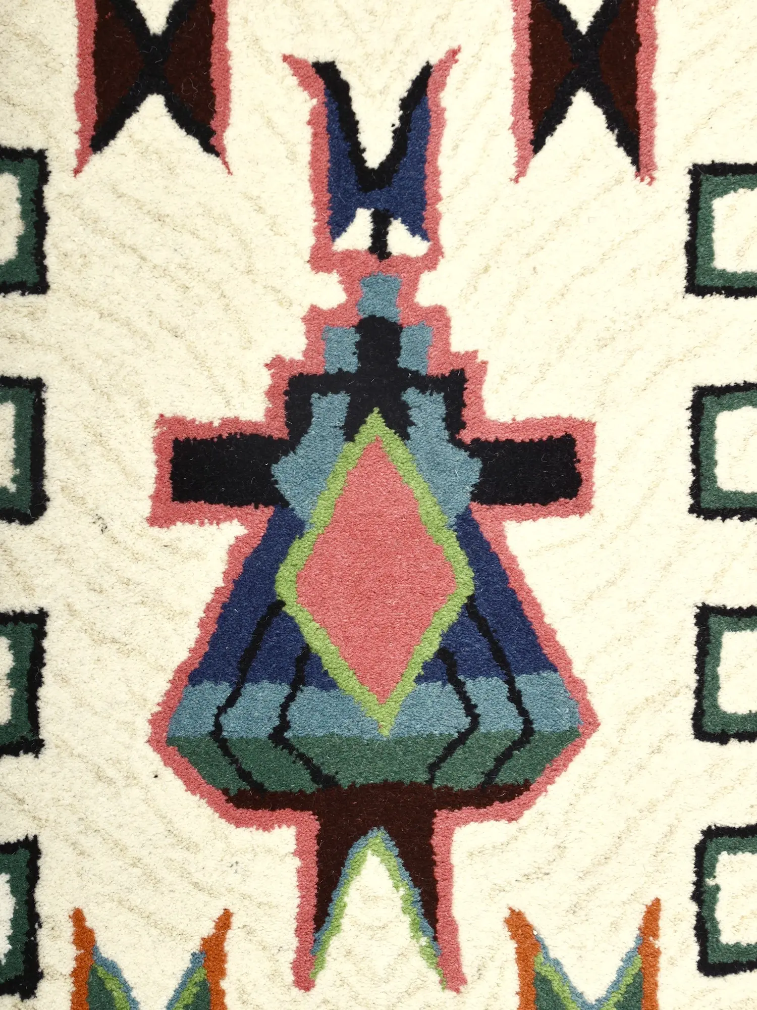The design of this mat is a captivating blend of traditional motifs and contemporary whimsy. The central panel features a vibrant, geometric pattern in a palette of rich blues, greens, and reds, set against the creamy white of the wool. This stylized design is framed by a distinctive zigzag border, adding a subtle yet striking visual element. The charming polar bear at the base, complete with its friendly face and paw details, adds an unexpected and delightful character. This mat is more than just a floor covering; it’s an invitation to embrace mindfulness, connect with nature, and infuse your personal space with personality and warmth. Its generous size provides ample room for movement and comfort during your yoga or meditation sessions, while also serving as a visually appealing rug for your entryway, living room, or child's bedroom. ––––––––––––––––––––