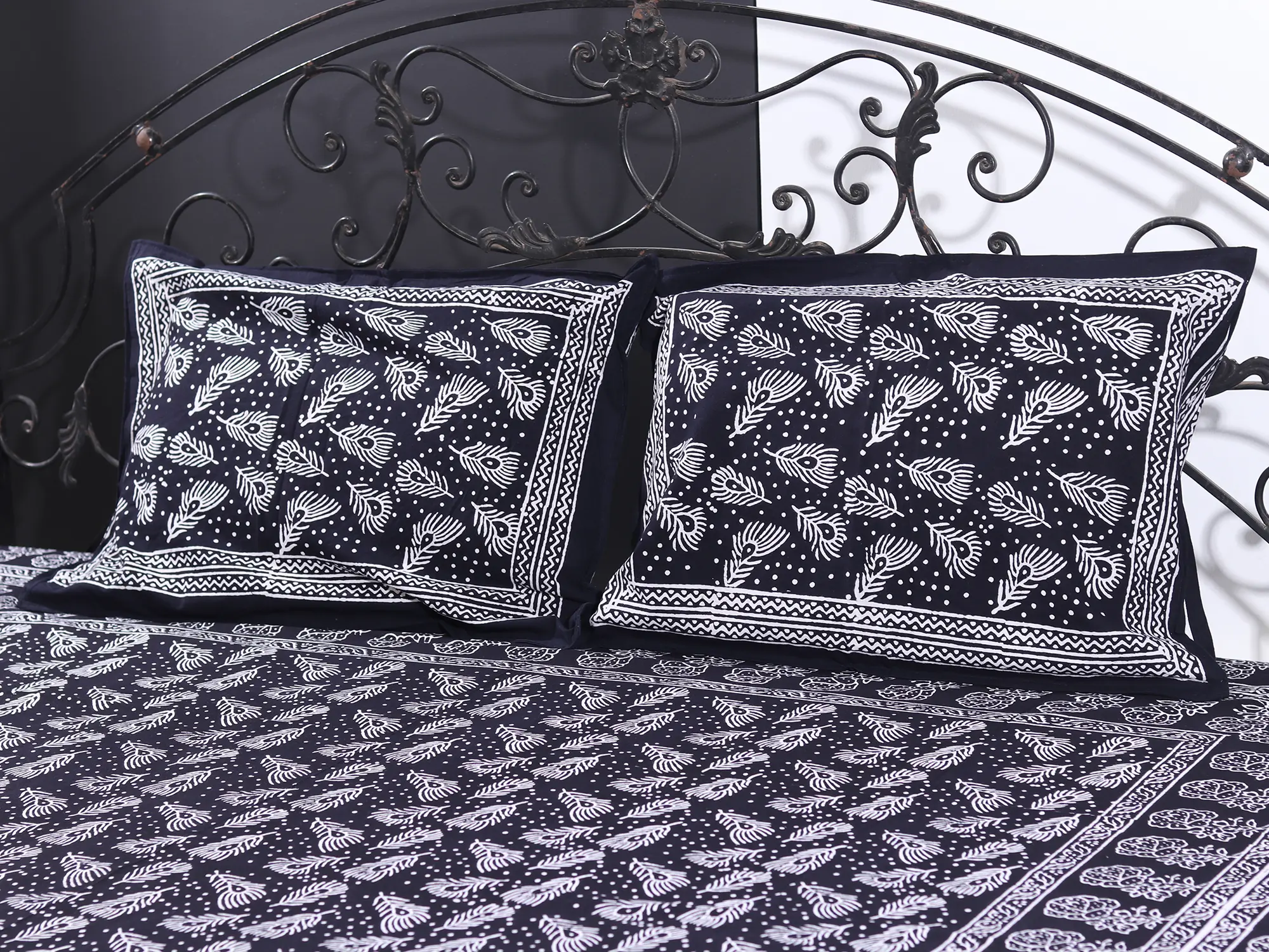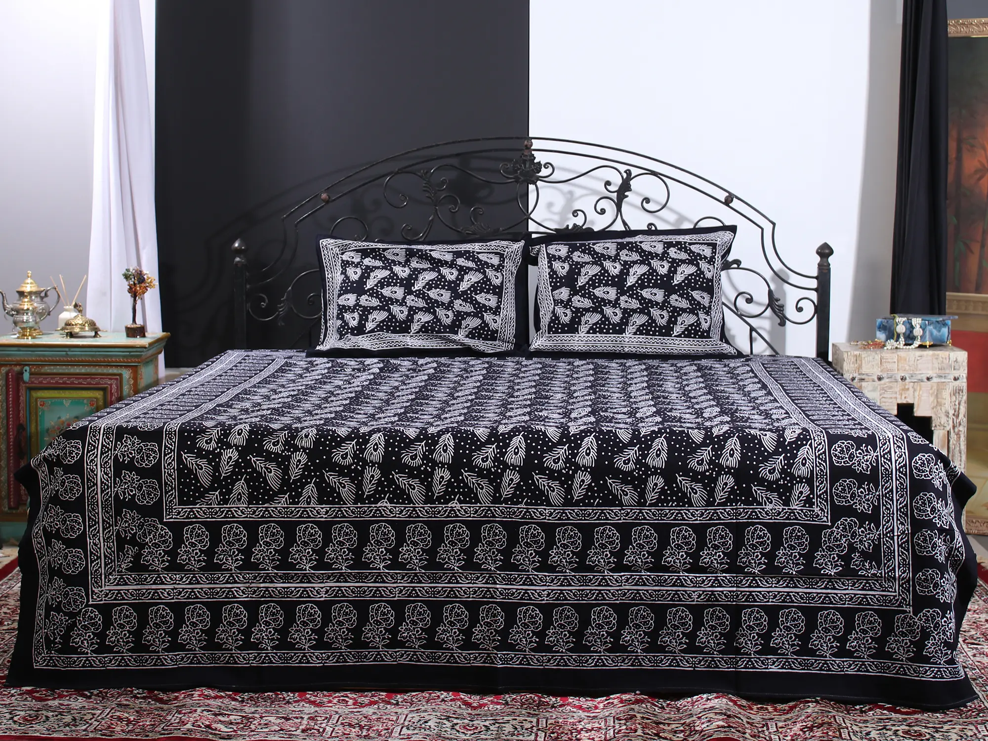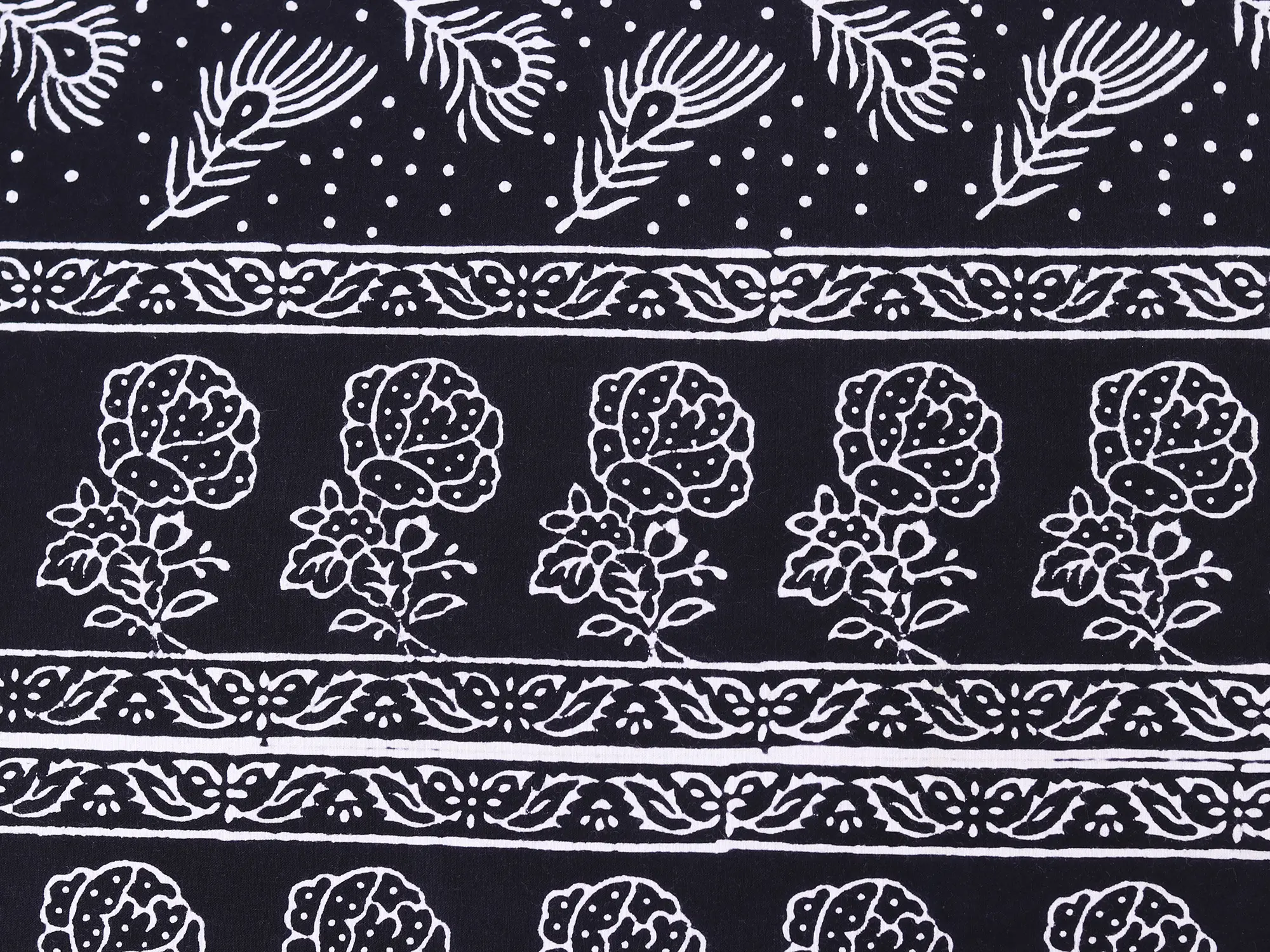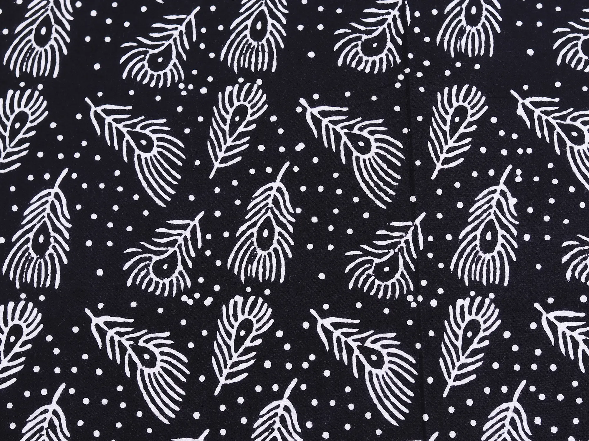The Caviar-Black Peacock Feather-Rose Batik Printed Cotton Queen Size Bedsheet with Two Pillow Covers cleverly utilizes this symbolism to create a visually striking and spiritually uplifting bed cover. The intricate batik prints feature delicate peacock feathers in vibrant colors, against a caviar-black background.