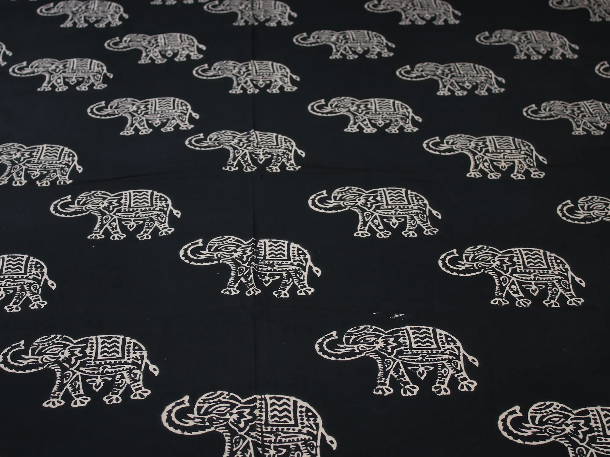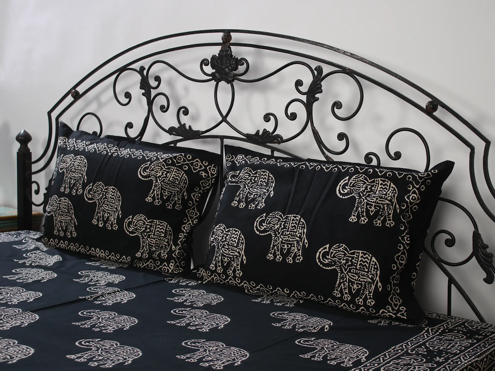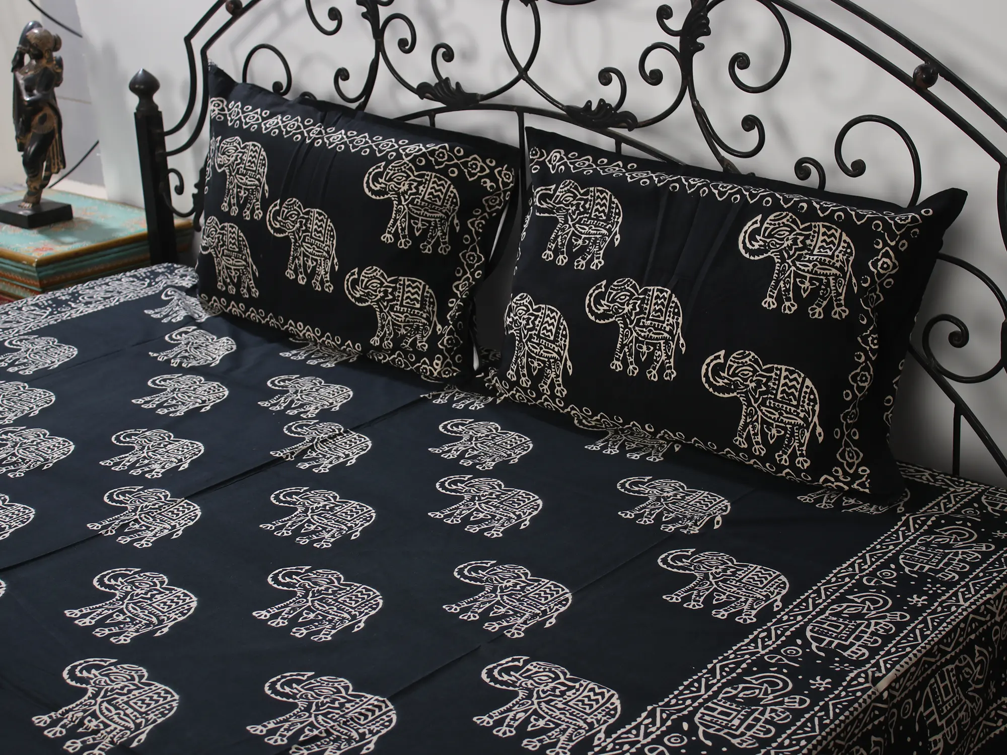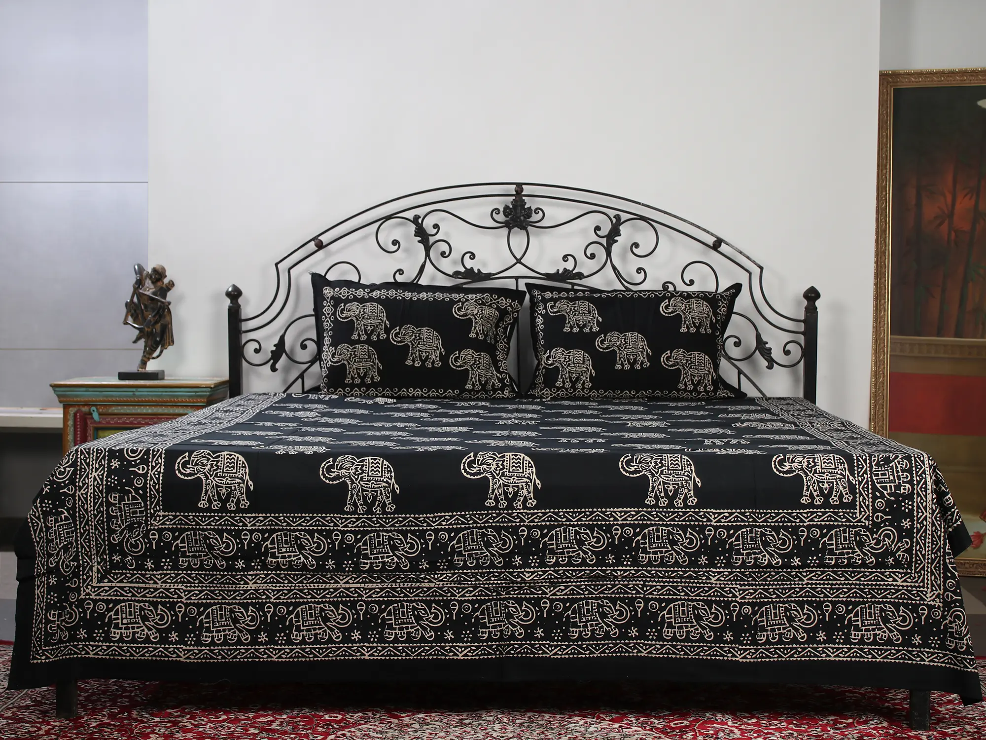 Black bedcovers may not be the first choice for home decor, but their charm and allure are undeniable. This Caviar-Black Queen Size Pure Cotton Jaipuri Bedsheet with Handblock-Pilkhuwa Printed Elephant and Two Pillow Covers is a stunning addition to any bedroom.