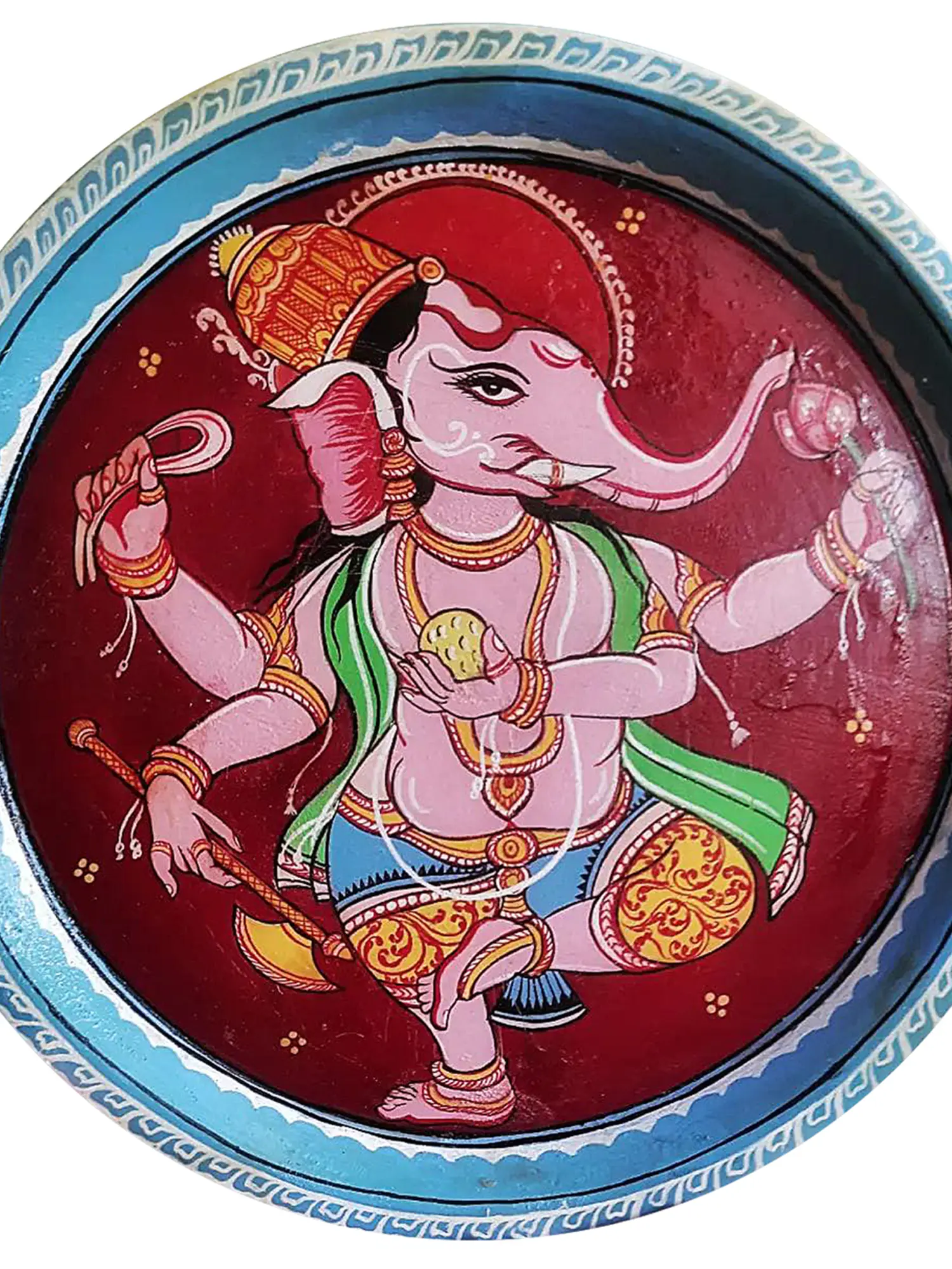 Sajan Dhal's Chaturbhuja Dancing Ganesha is a unique experiment that challenges the stereotypical medium of capturing art. It explores the more solid medium of wood that can survive time. It is an Acrylic on Wood Plate. The artwork brings Lord Ganesha to life in a dynamic dance, exuding joy and divine energy. The artist's skilled use of acrylic paints on wooden plate adds a unique texture and depth to the composition.