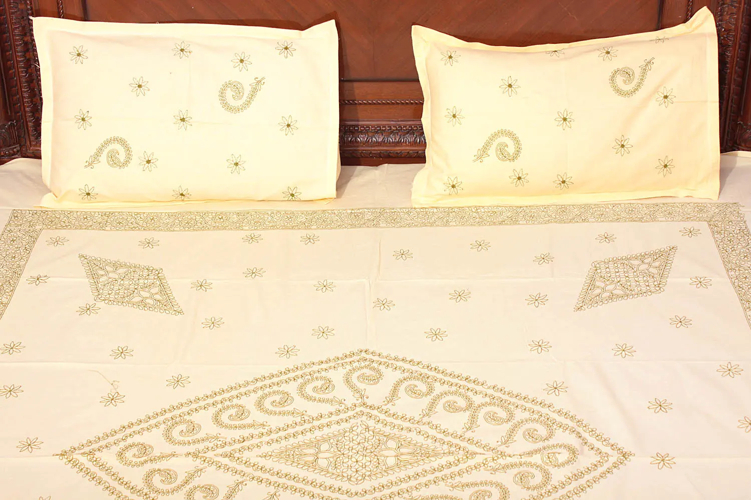 The bedspread features a soothing pale-yellow hue that evokes a sense of tranquility and serenity. The delicate color provides a perfect backdrop for the intricate Chikan embroidery, which is executed in subtle and elegant tones. The embroidery features a central, ornate geometric design, surrounded by a beautifully detailed border. Scattered across the field of the bedspread are smaller, repeating motifs, creating a harmonious and visually appealing pattern. This refined design will instantly elevate the aesthetic of any bedroom, adding a touch of sophistication and understated luxury.