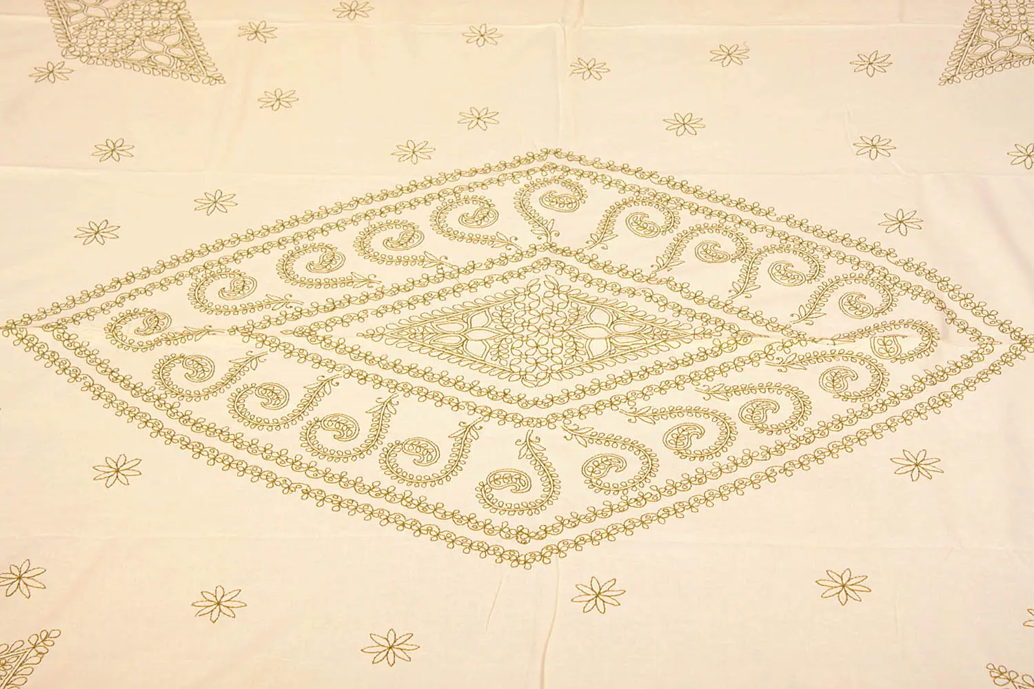 Indulge in the timeless elegance of this exquisite bedspread, meticulously handcrafted in the heart of Lucknow, India. Known for its intricate Chikan embroidery, Lucknow has been a center for fine needlework for centuries. This bedspread embodies that rich heritage, showcasing the delicate artistry passed down through generations. Each stitch is a testament to the skill and dedication of the artisans, transforming a simple piece of fabric into a work of art.