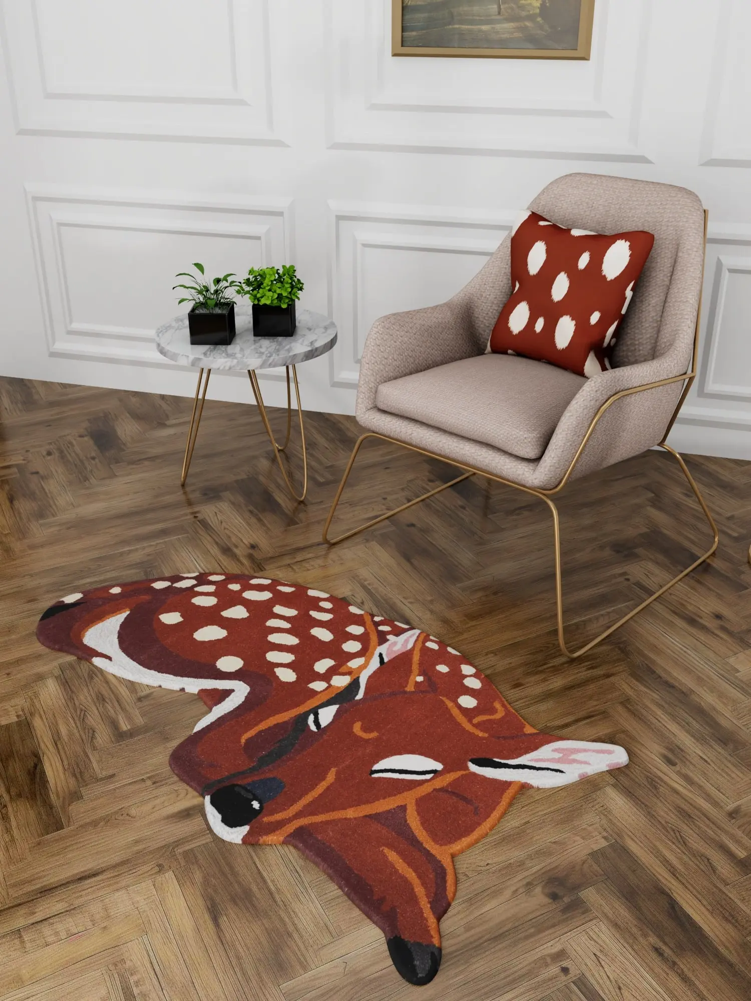 Invite a gentle woodland charm into your home with this exquisitely crafted mat. Depicting a serene fawn curled up in peaceful repose, this piece brings a sense of natural beauty and quietude to any space. The rich, earthy tones of the fawn, from its warm cinnamon-stick fur to its delicate white spots, are rendered with striking detail, capturing the innocent allure of a young deer. The intricate artistry, inspired by traditional rug-making techniques, ensures that each mat is a unique work of art, a testament to the skill of its creators. ––––––––––––––––––
