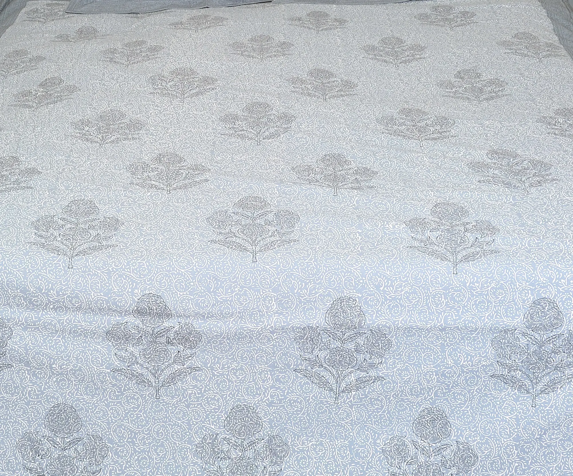 Snow-White Floral Pattern Gold Handblock Printed Cotton Queen Size Bedsheet With Two Pillow Cover