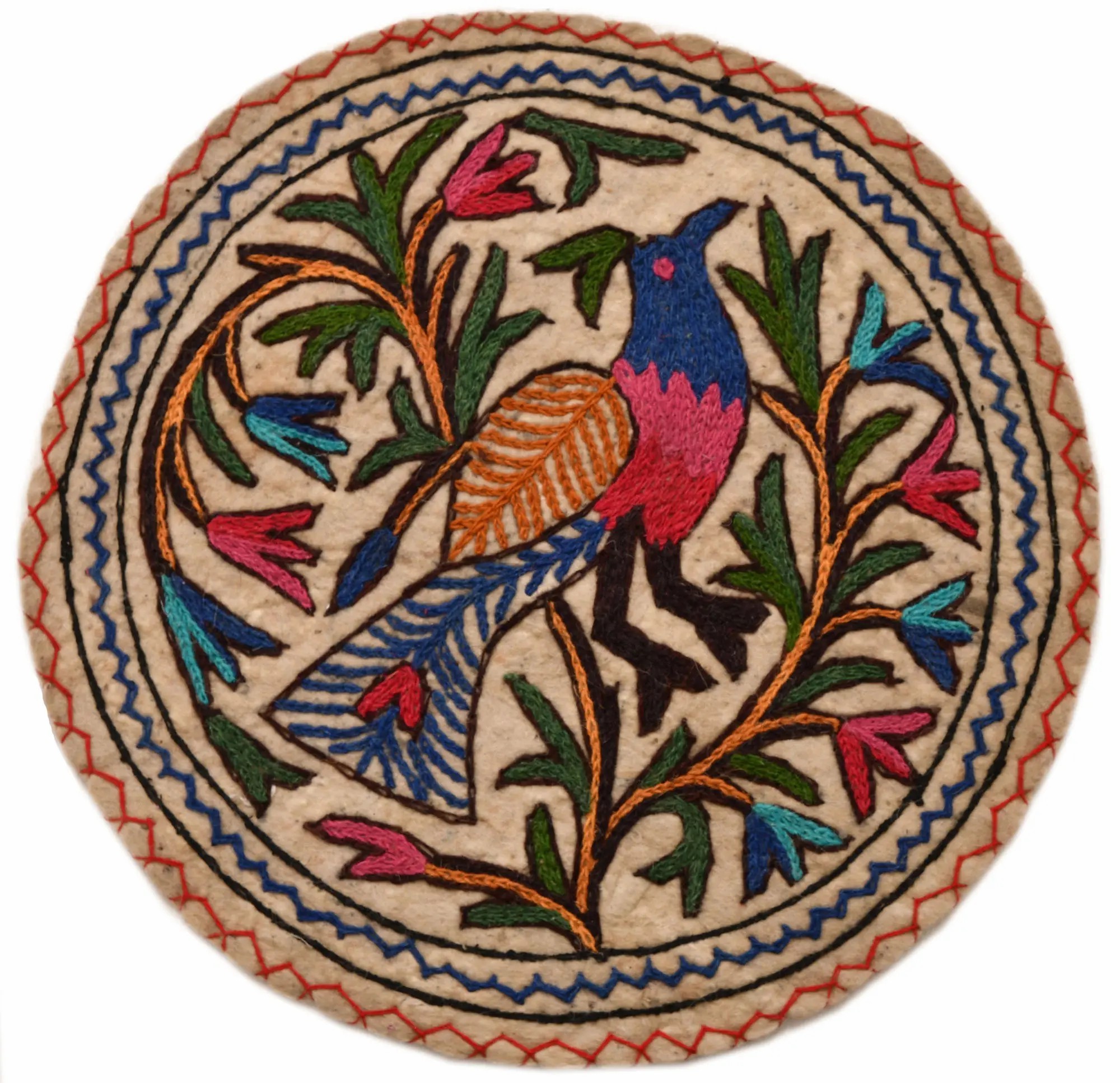Introduce a burst of handcrafted charm to your living space with this exquisite circular mat. Far from ordinary, this piece features a delightful hand-embroidered peacock design, bringing a touch of nature's splendor indoors. The neutral, cloud-cream backdrop provides a calming foundation, allowing the vibrant colors of the embroidered details to truly pop. Imagine this mat gracing your entryway, adding a warm welcome to guests, or nestled under a small coffee table, becoming a focal point in your living room. Its unique design and handcrafted nature make it more than just a floor covering – it's a conversation starter, a testament to artisanal skill, and a reflection of your unique style.