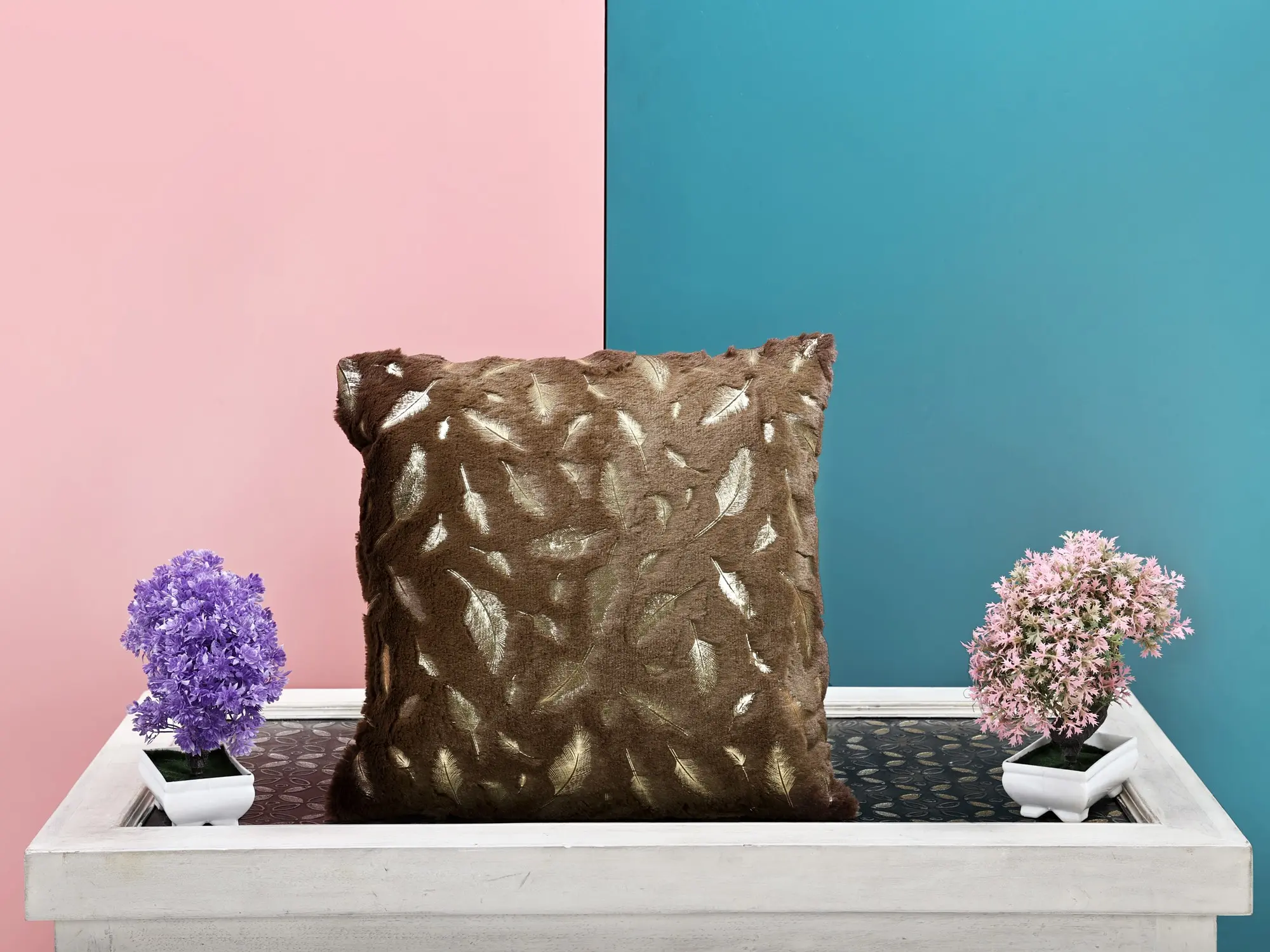 The Cushion Cover offers a touch of luxury and comfort. Printed with golden feathers and enveloped in faux fur, this cover transforms your cushions into plush clouds of opulence. It serves both as a visual delight and a tactile sensation, elevating your décor and enhancing your comfort. Use it to adorn your sofas or beds, and experience the lavish embrace of golden elegance. Sink into its inviting softness and add a touch of luxury to your living spaces.