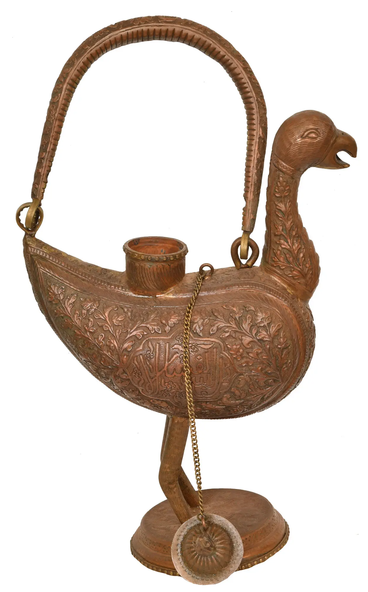 Every inch of this piece showcases the dedication and artistry of its creators. The meticulously etched patterns, reminiscent of delicate floral motifs and geometric designs, add depth and texture to the surface. The bird's form is gracefully captured, from its elegant neck and beak to the gentle curve of its body. A carefully crafted handle, adorned with complementary details, allows for easy handling and adds to its overall aesthetic appeal. The lid, secured by a delicate chain, adds a touch of practicality and enhances the piece's overall charm. The base provides stability and elevates the bird, allowing it to be admired from all angles.