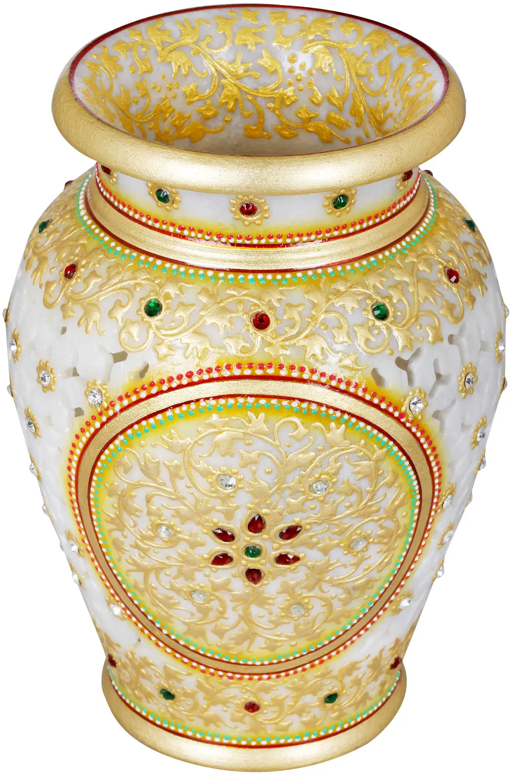 Imagine this vase gracing your living room mantle, adding a touch of royal flair to your dining table centerpiece, or becoming a cherished focal point in your entryway. More than just a vessel for blooms, it is designed to be a standalone work of art. The neutral white marble blends seamlessly with a variety of interior design styles, while the ornate gold and jewel detailing offer an opportunity to accent the space. The quality of this vase is apparent in every detail, from the smooth, polished marble to the precisely applied embellishments. It is an heirloom-quality piece that can be treasured for years to come. It is an invitation to bring a touch of Jaipur's majestic artistry into your daily life. Beyond its visual appeal, this piece makes an exceptional gift for those who appreciate the beauty of handmade crafts and unique designs. A beautiful gift for holidays, housewarmings, weddings, and anniversaries.