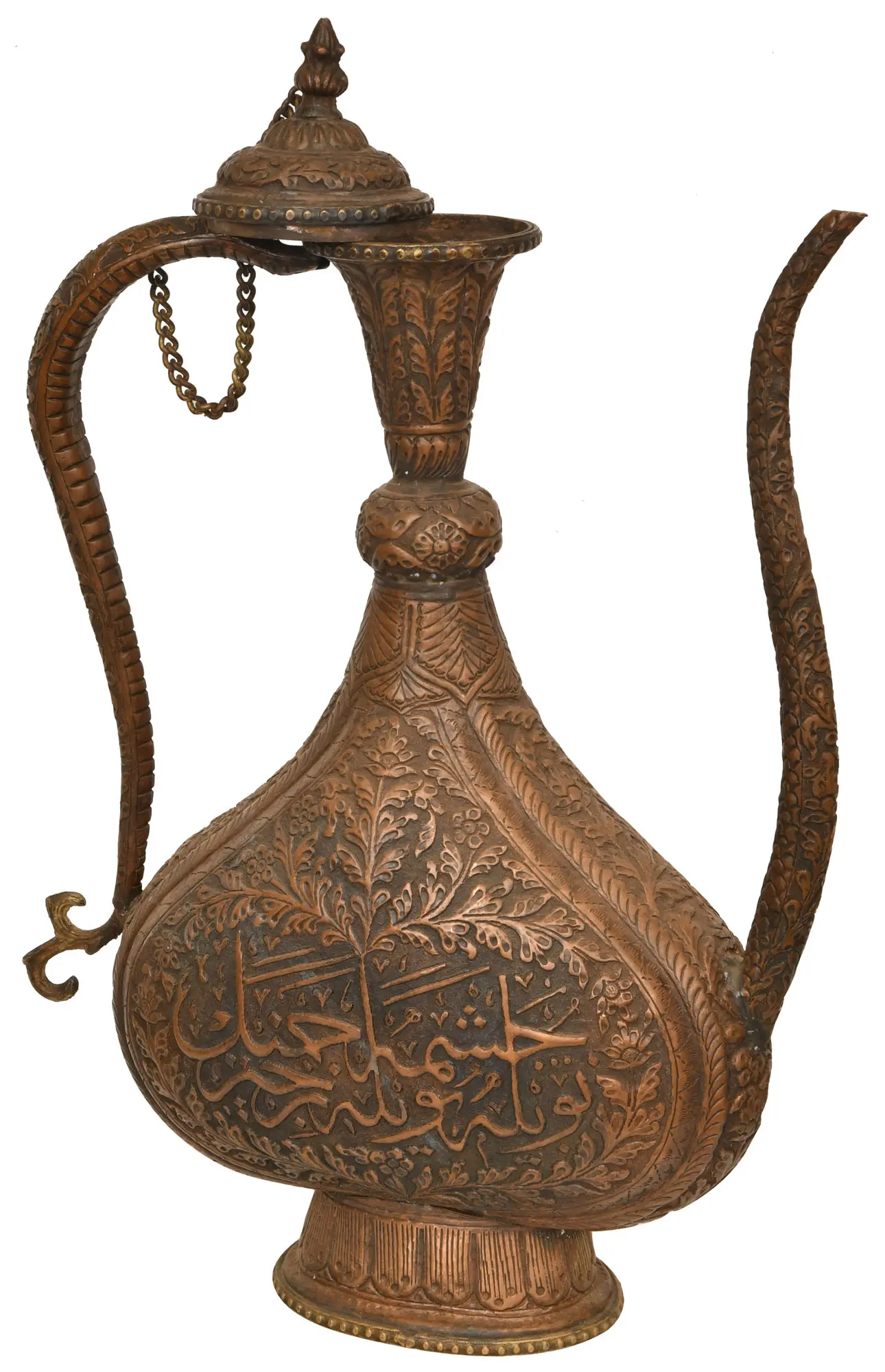 The first thing that strikes you is the sheer amount of detail. The body of the surahi features intricate floral patterns that wind around the vessel, creating a sense of movement and organic beauty. The floral engravings evoke the feeling of a lush, vibrant garden, reflecting the artisans’ profound connection to nature. Adding to the intrigue is the calligraphic inscription that adorns the central part of the body. These elegant Arabic characters, meticulously etched into the copper, lend a spiritual dimension to the surahi, reminding us of its cultural significance and the devotion that went into its creation. The flowing script complements the floral motifs, creating a harmonious visual experience. The surahi is also equipped with an elegantly curved spout and a gracefully arcing handle, demonstrating the perfect blend of form and function. These elements, while practical, are also meticulously decorated, adding to the overall aesthetic appeal of the piece. The hinged lid, secured by a delicate chain, completes the ensemble, ensuring that every aspect of the surahi is a testament to artistic excellence.