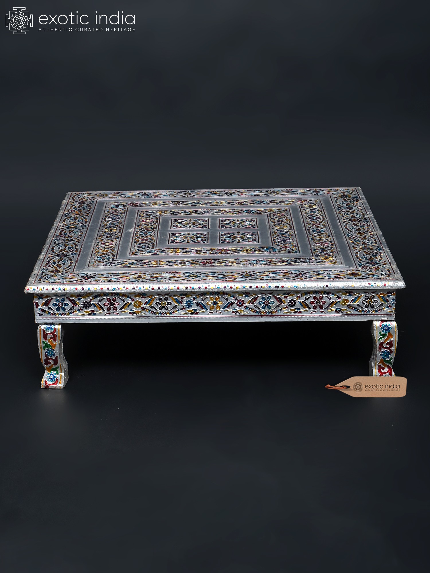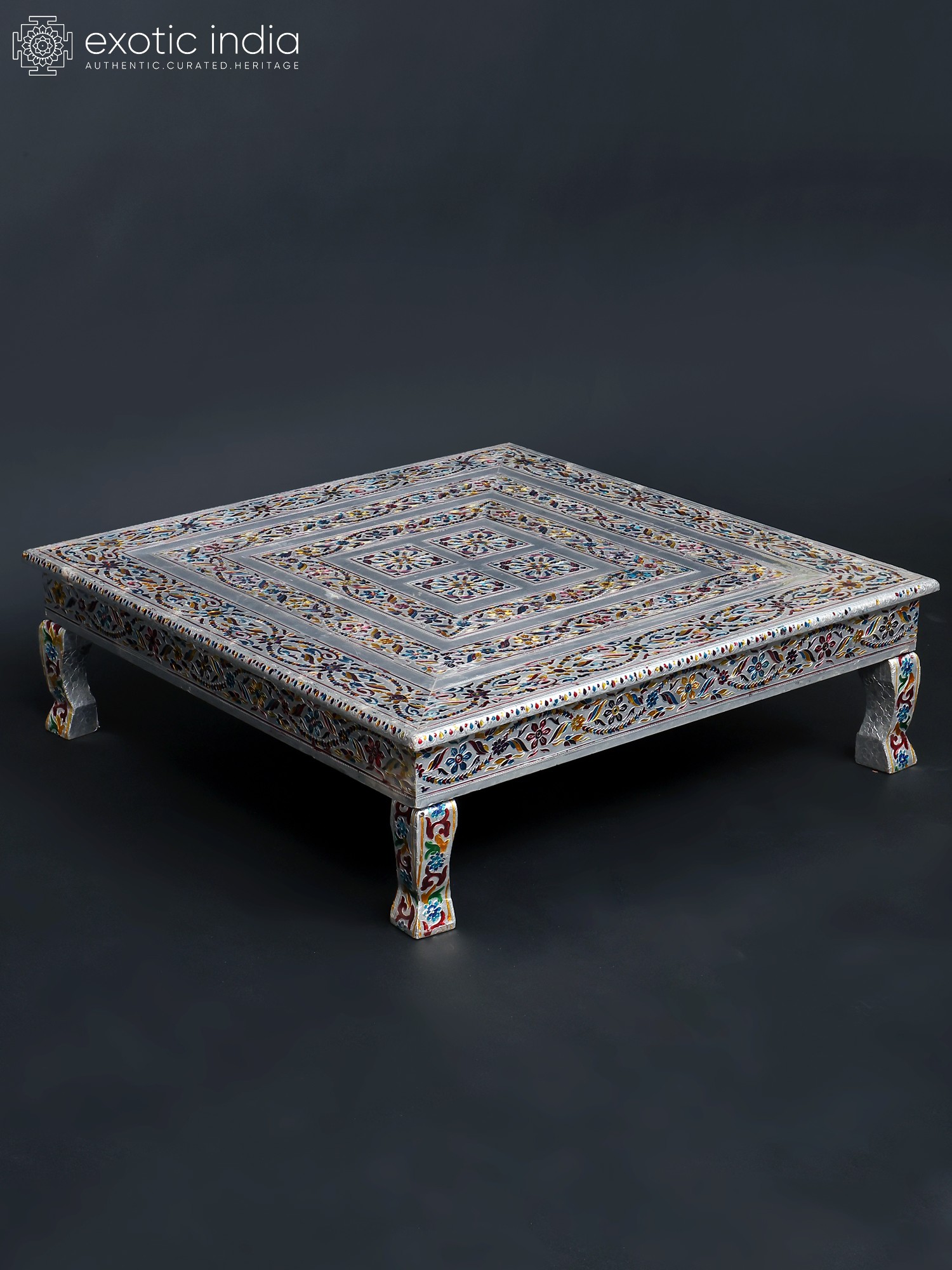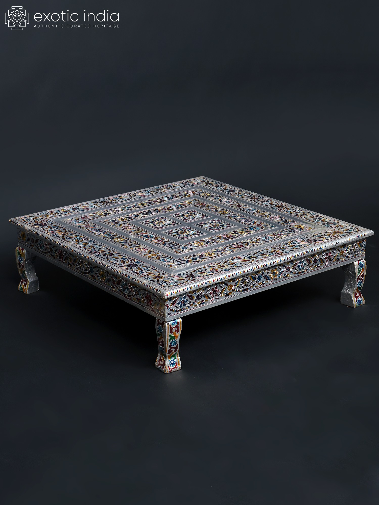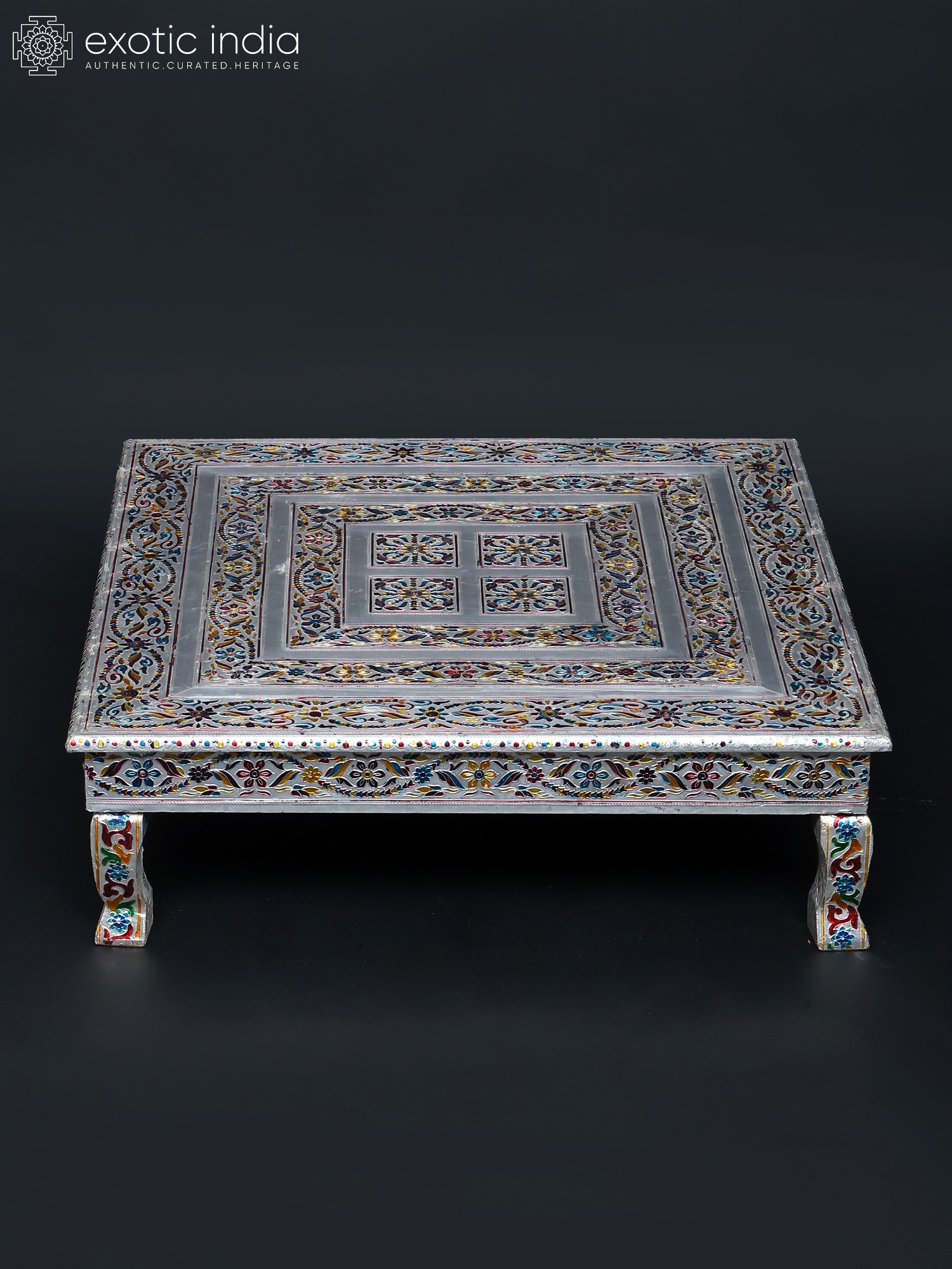 The chowki is a testament to the skill and dedication of artisans. The careful blending of wood and metal showcases an eye-catching contrast. The surface features intricate floral motifs, and a stylized avian design, that have been carefully etched and painted to produce the mesmerizing pattern. The legs of the chowki are equally adorned with exquisite designs that add to the overall aesthetic appeal. The use of different colors brings the art to life and makes the chowki visually pleasing. The metal elements add a touch of timeless elegance, ensuring that this chowki will be a cherished piece for years to come.