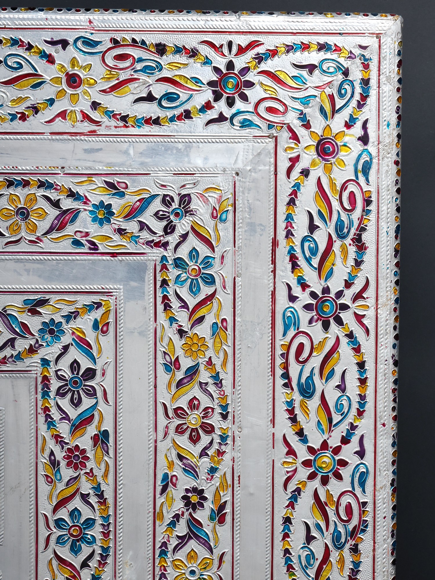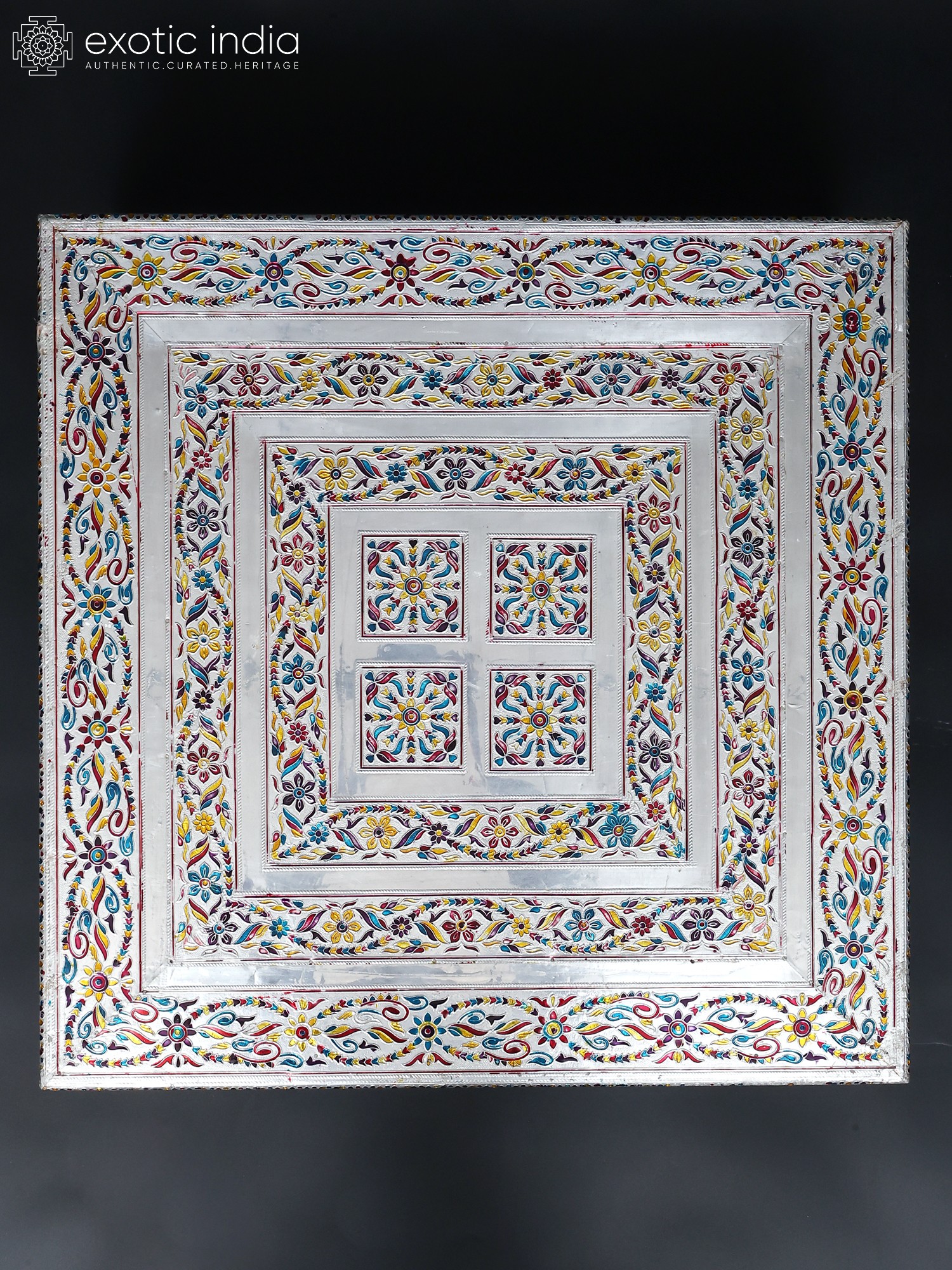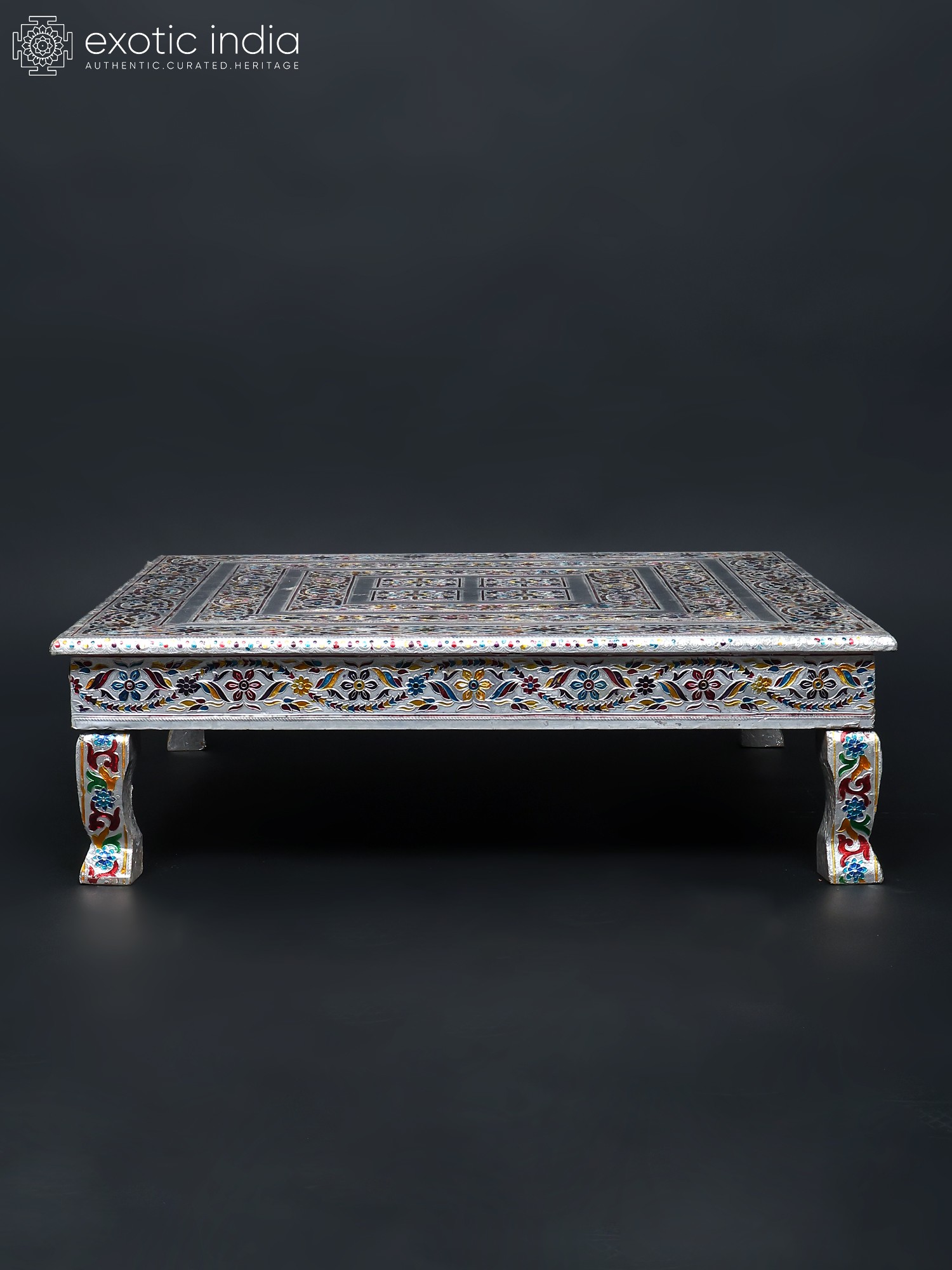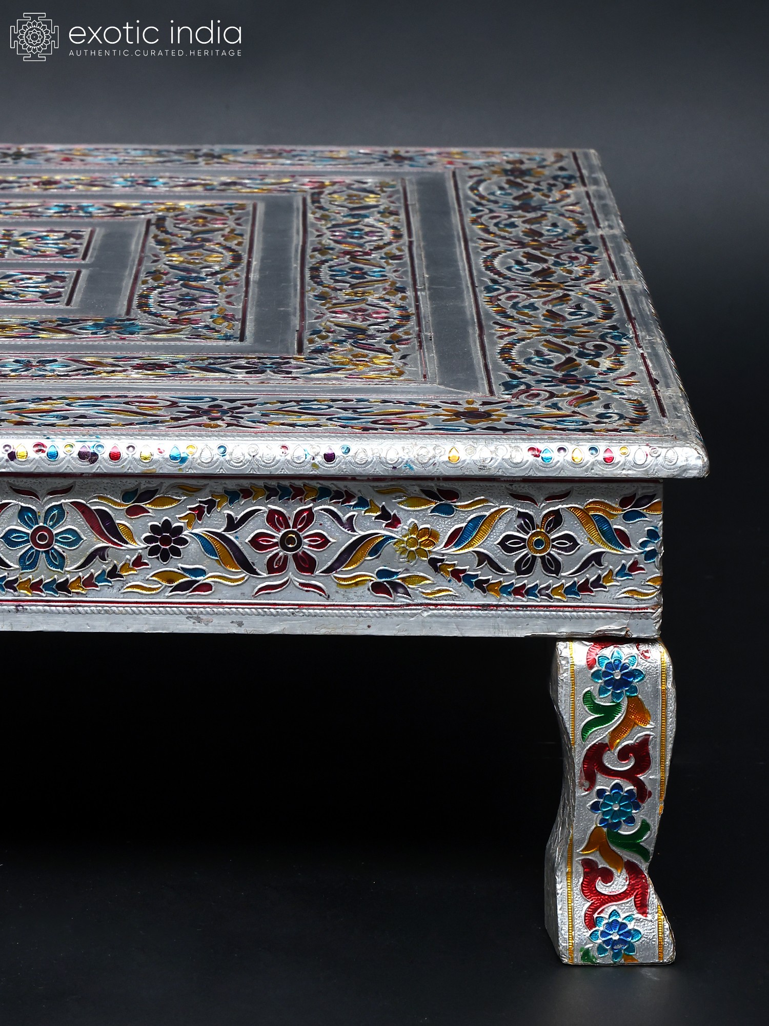 The chowki is a testament to the skill and dedication of artisans. The careful blending of wood and metal showcases an eye-catching contrast. The surface features intricate floral motifs, and a stylized avian design, that have been carefully etched and painted to produce the mesmerizing pattern. The legs of the chowki are equally adorned with exquisite designs that add to the overall aesthetic appeal. The use of different colors brings the art to life and makes the chowki visually pleasing. The metal elements add a touch of timeless elegance, ensuring that this chowki will be a cherished piece for years to come.