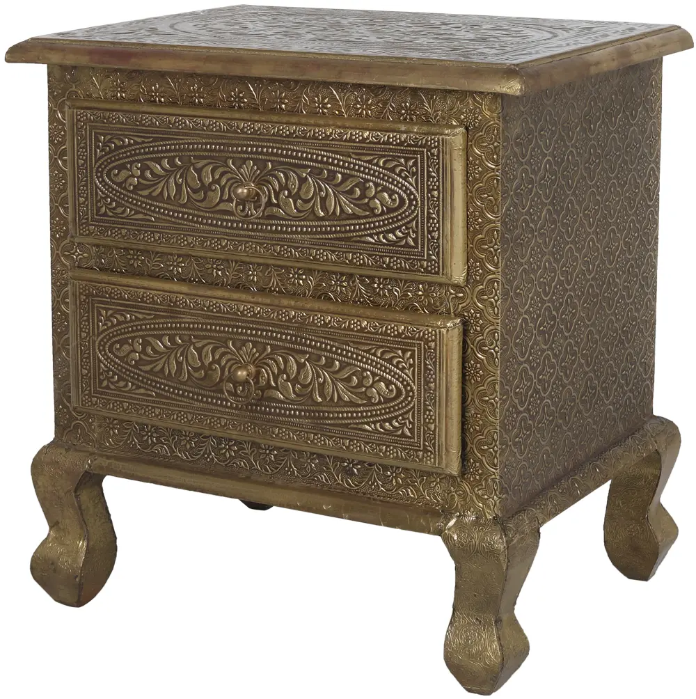 Notice the elaborate patterns that adorn every surface of this table. The delicate floral motifs and geometric designs have been carefully rendered, creating a visually stunning texture that begs to be touched. The detailing extends to the drawer pulls, which are themselves miniature works of art, perfectly complementing the overall aesthetic. Each time you open a drawer, you'll be reminded of the craftsmanship and attention to detail that went into creating this exceptional piece. Beyond its beauty, this table offers practicality. The drawers glide smoothly, providing easy access to your belongings. The top surface offers ample space for displaying cherished items, such as photographs, vases, or decorative objects. Use it as a nightstand, a side table, or even a small console table – its versatility makes it a welcome addition to any room. It's a piece that seamlessly blends form and function, enhancing both the style and organization of your home. The beautiful detailing is consistent from the top of the table down to its subtly curved legs. Envision it complementing your current décor, and becoming a fast favorite in your home.