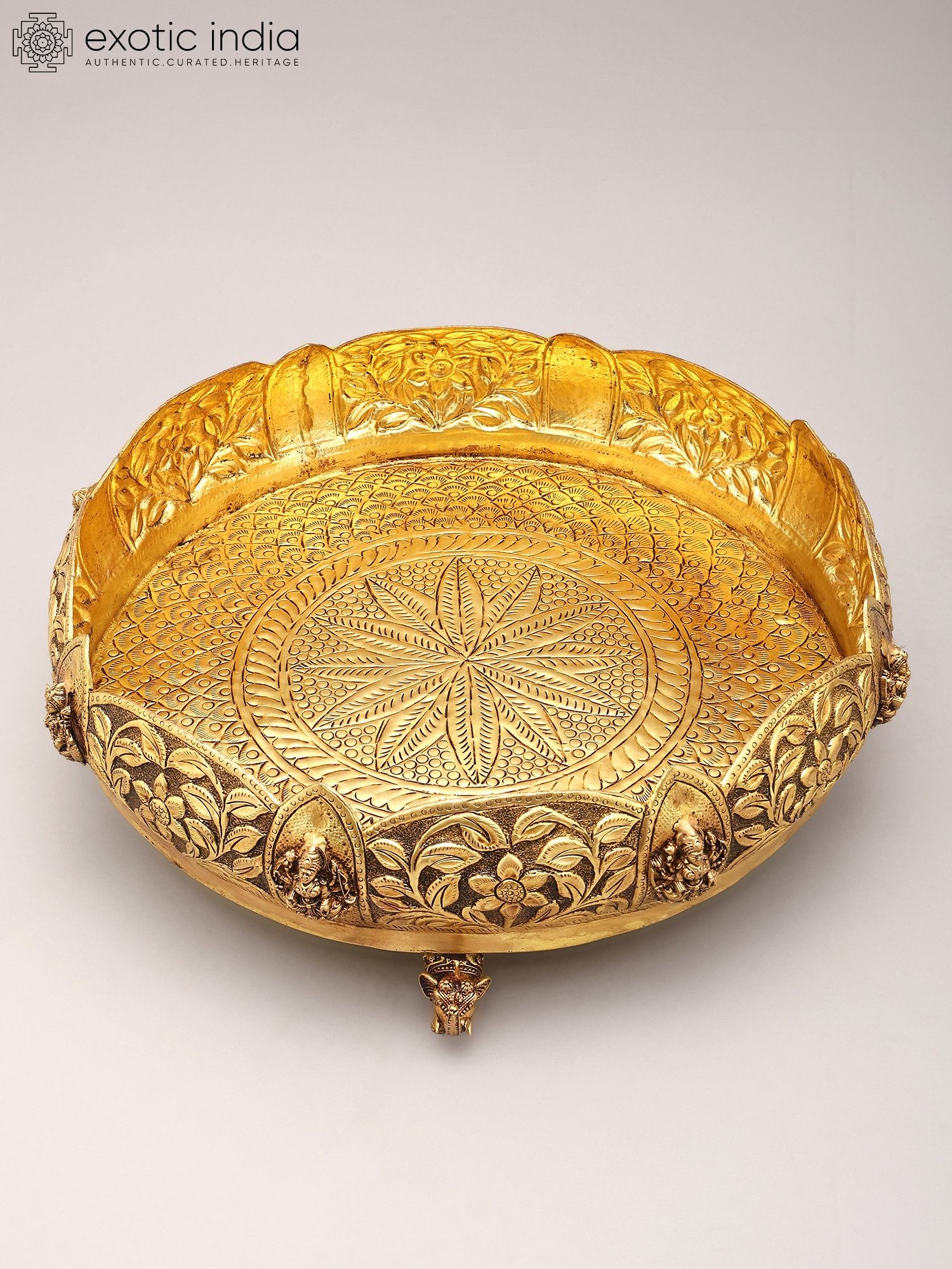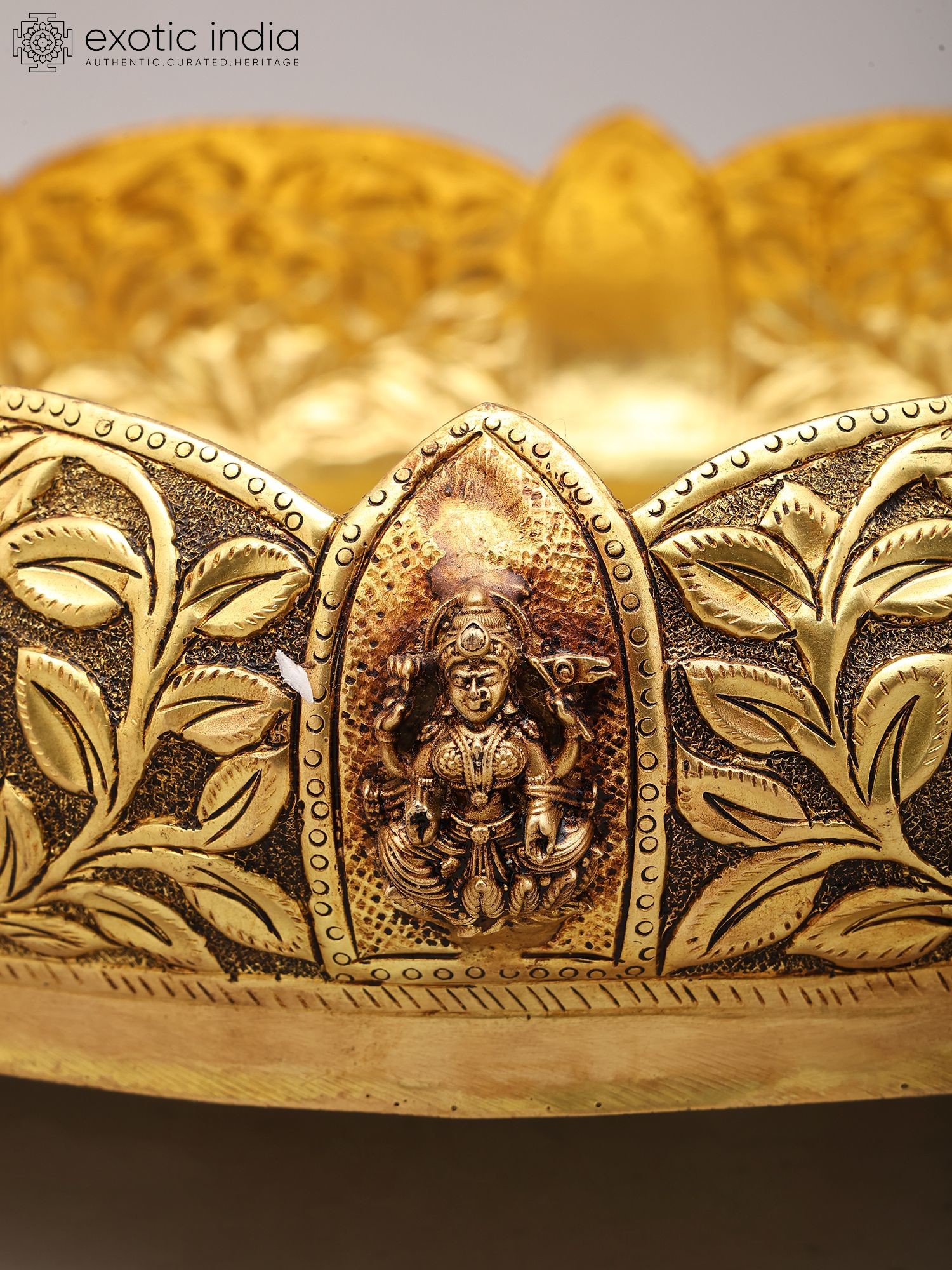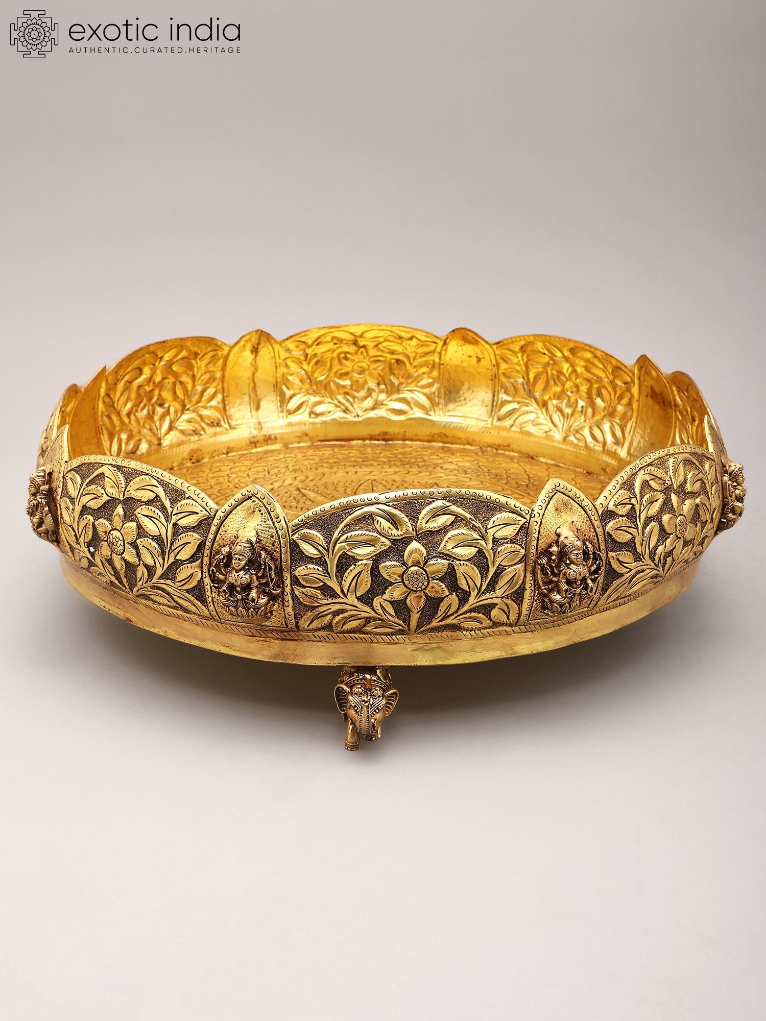 Adorned with intricate floral carvings and auspicious motifs around the rim.