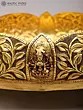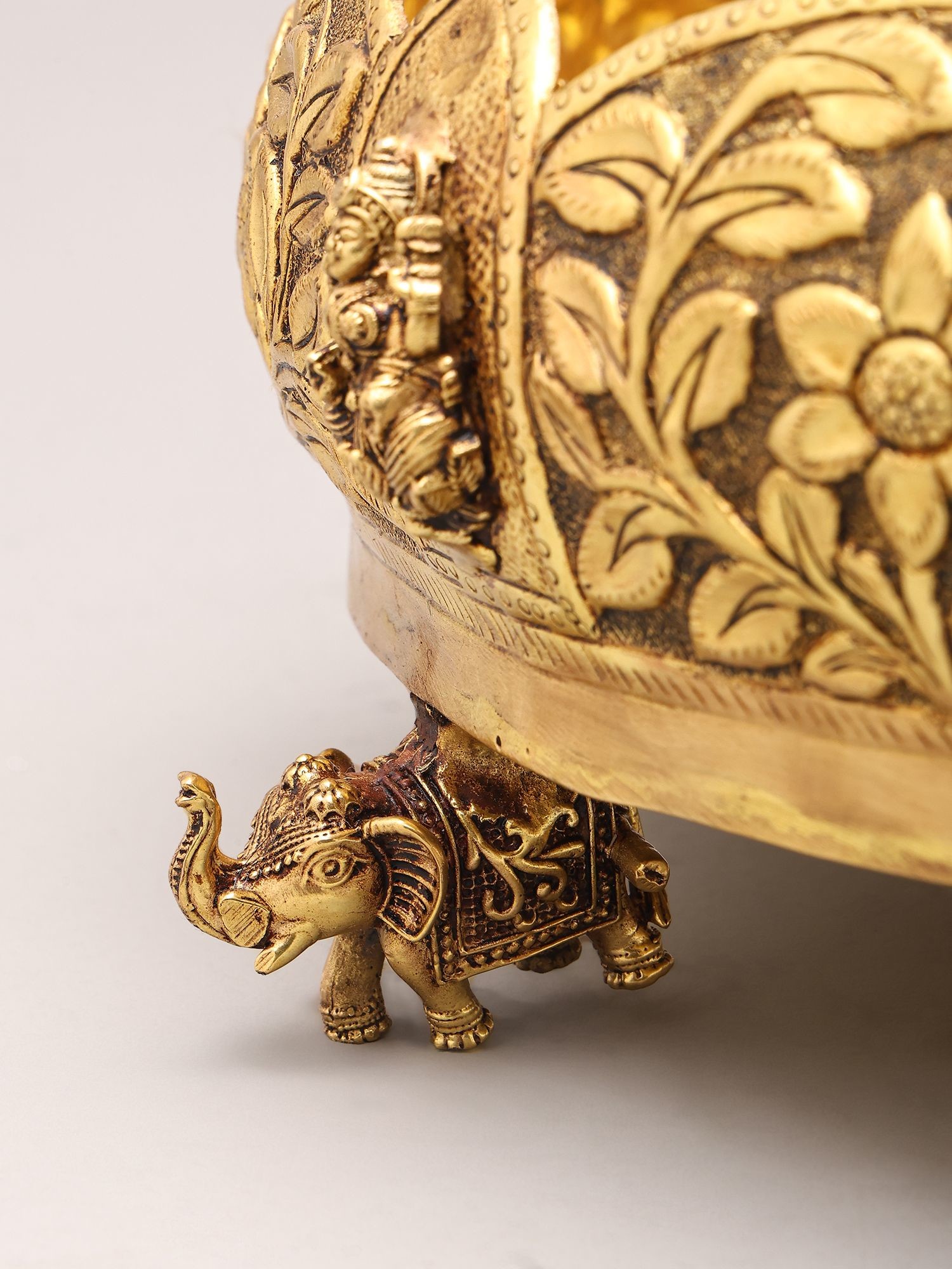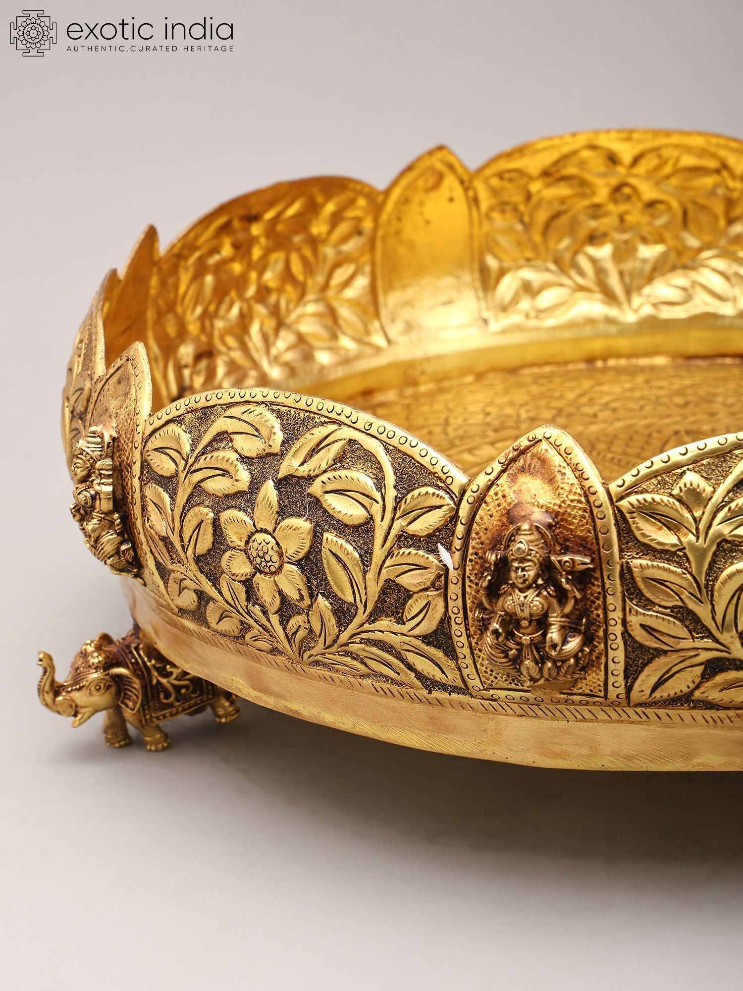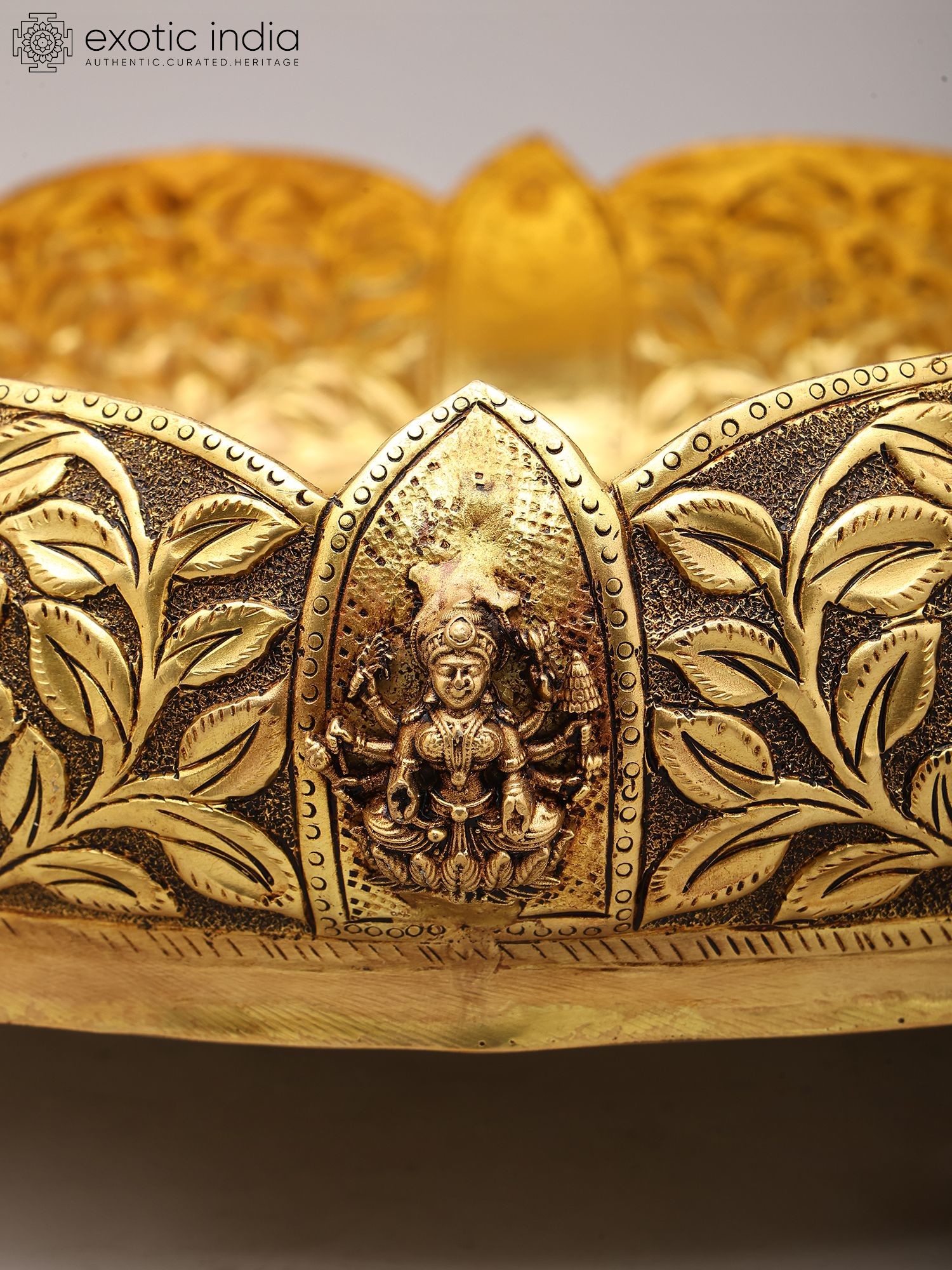 Adorned with intricate floral carvings and auspicious motifs around the rim.