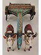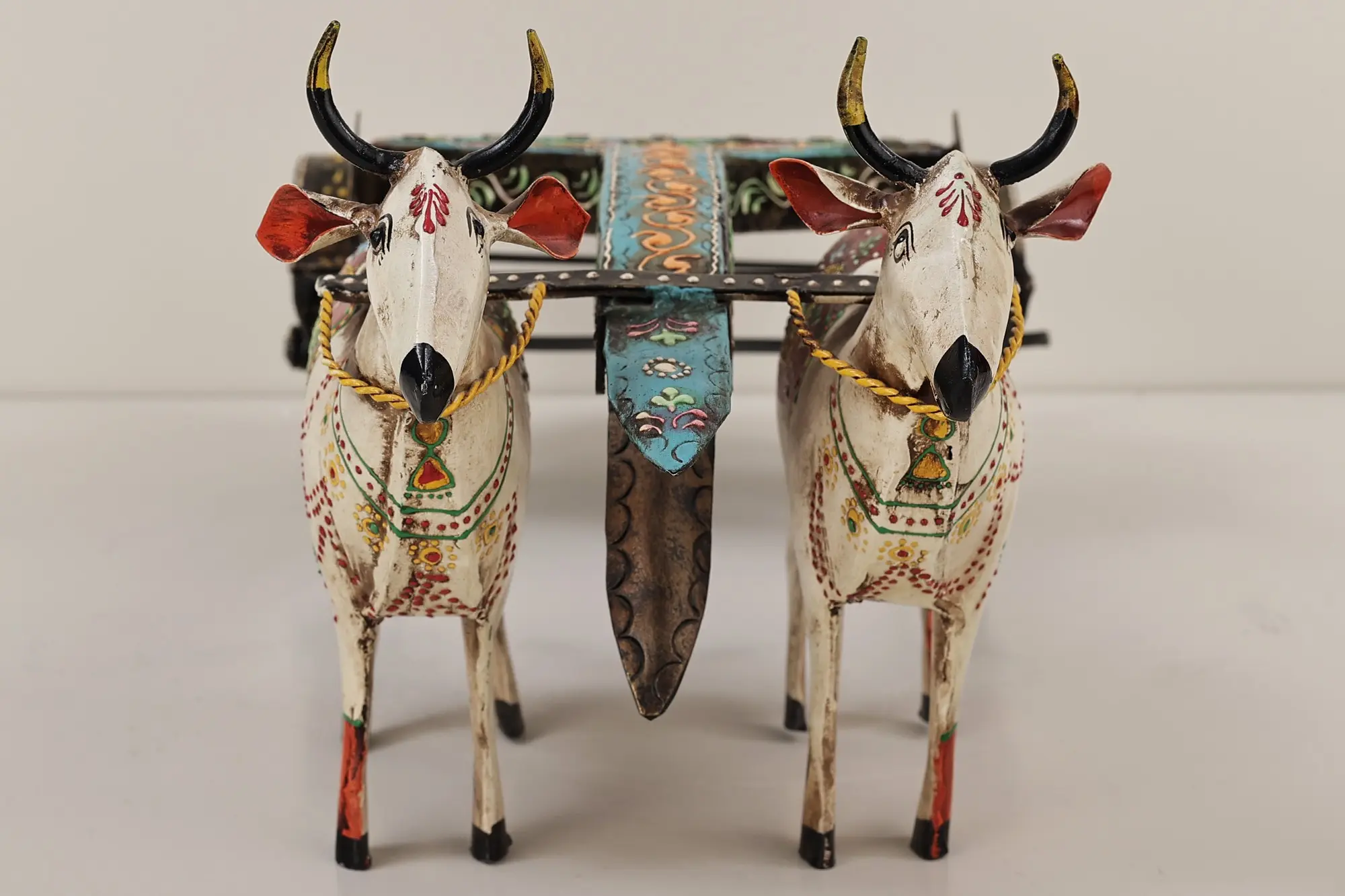 Every element of this decorative bullock cart speaks volumes about the skill and dedication of the artisans who created it. Fashioned from iron, the robust construction ensures lasting beauty. The intricate hand-painted designs are a visual feast, featuring an array of vibrant colors and patterns. The color palette and fine details truly bring this piece to life. Notice the elaborate embellishments that adorn both the cart and the bullocks, reflecting a deep appreciation for artistic expression.