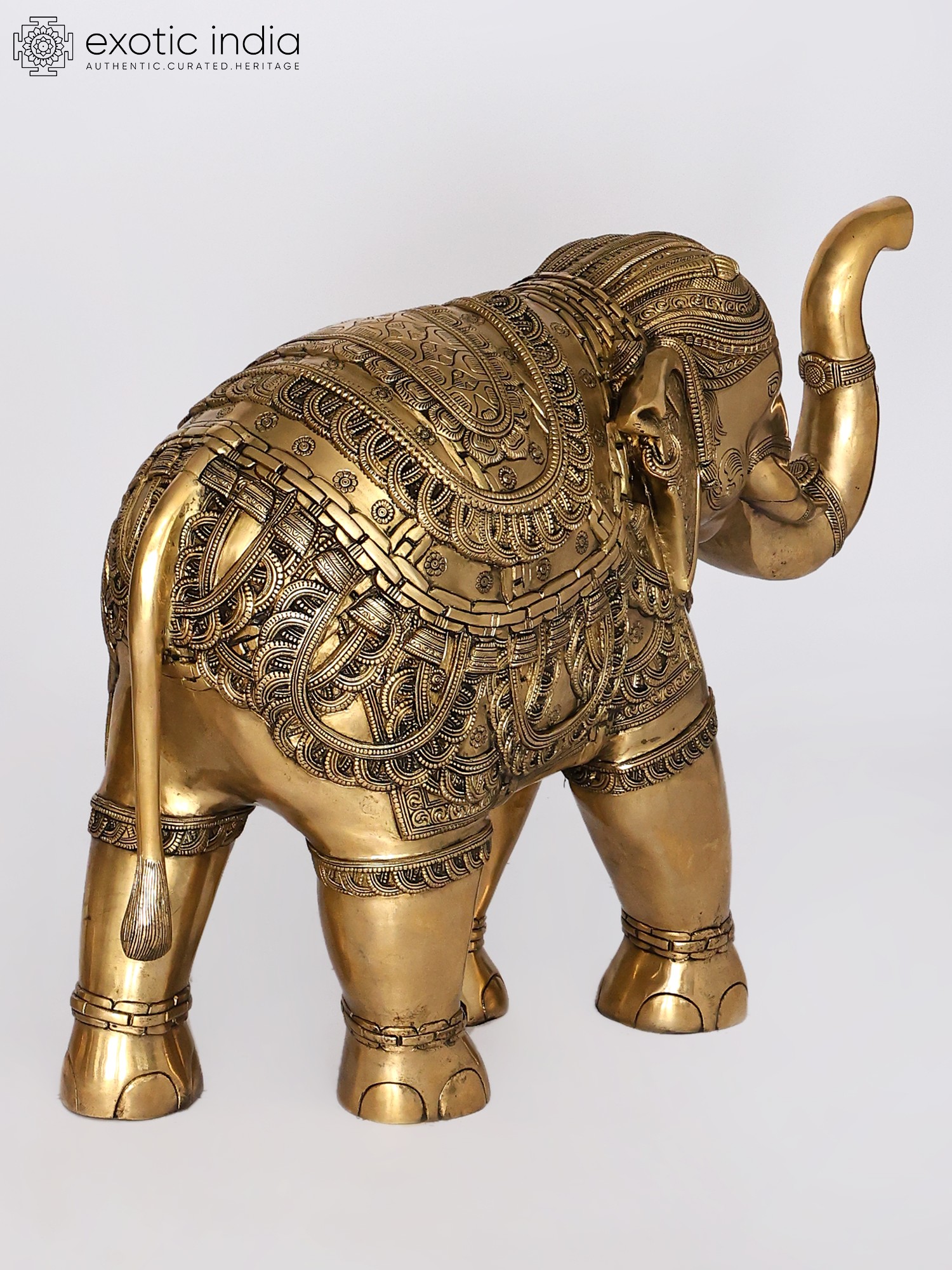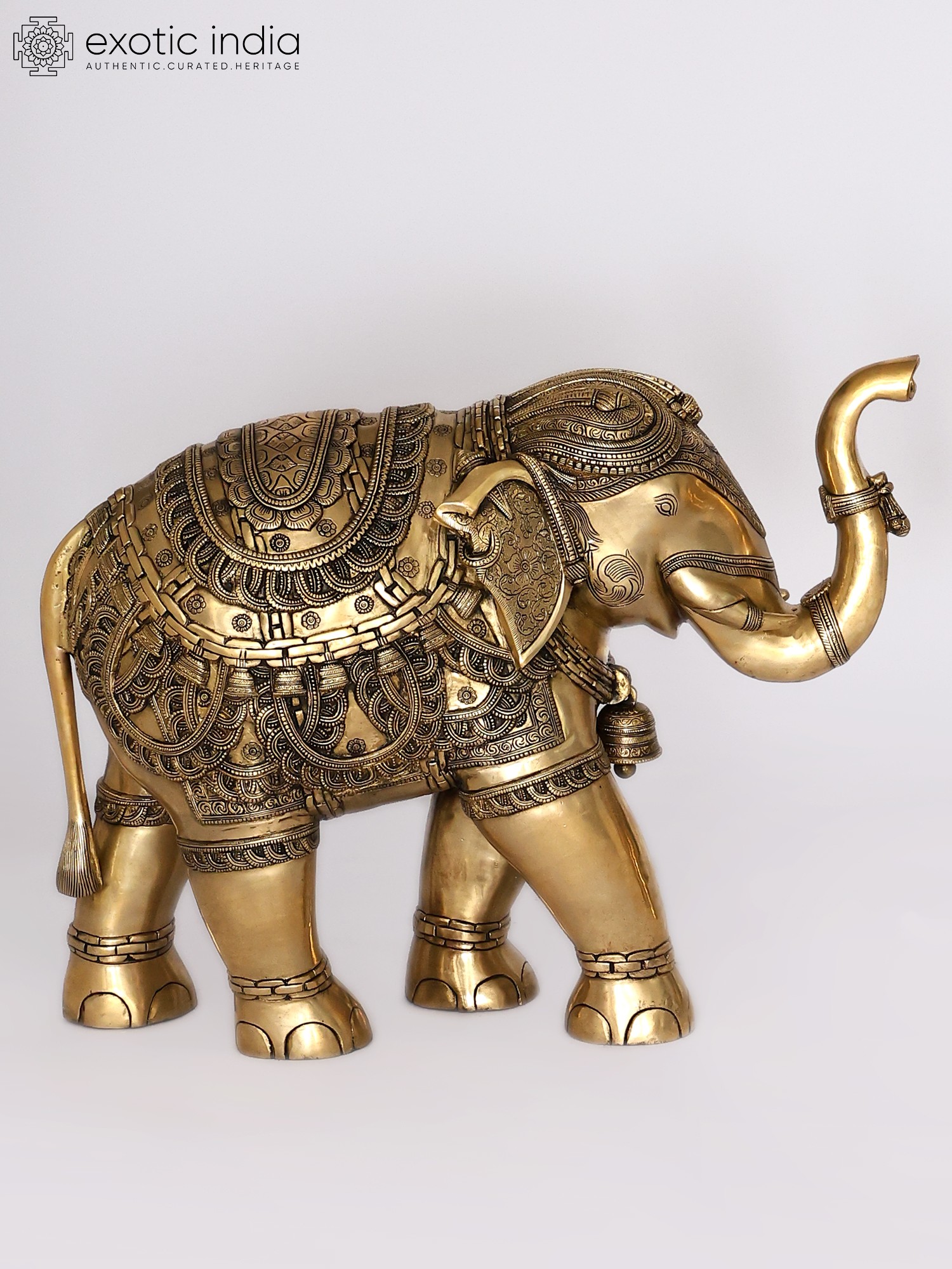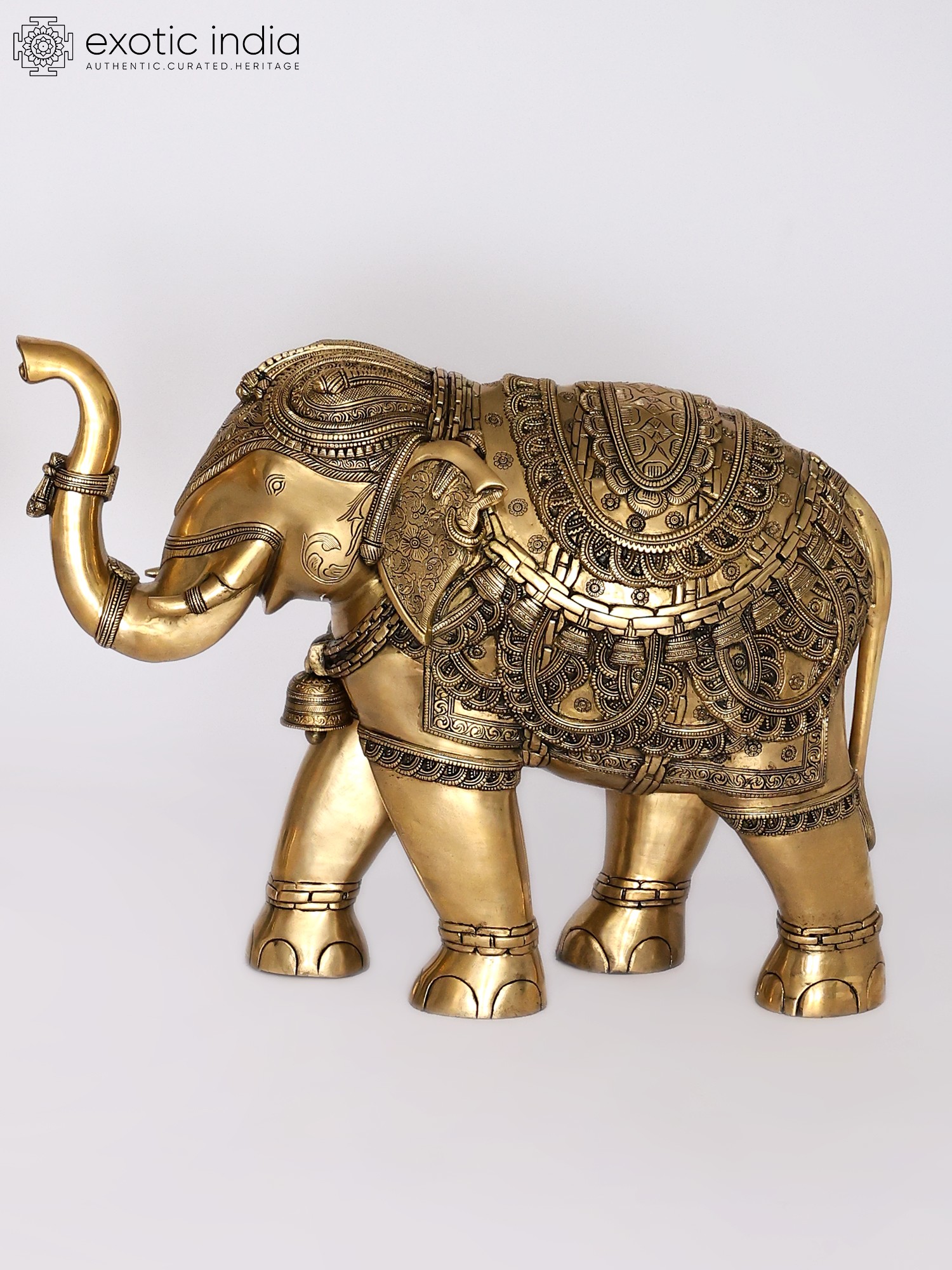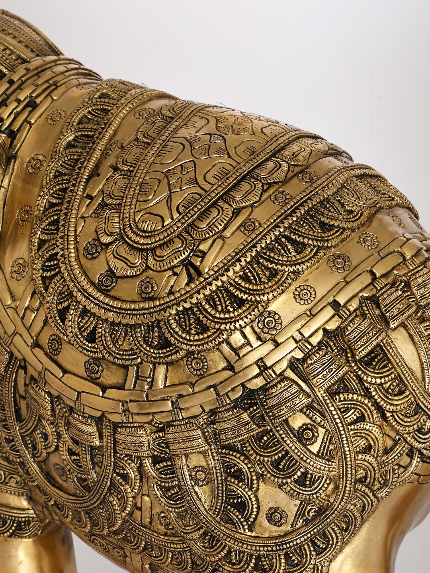 These excellent brass-pieces, representing a pair of elephants, exactly identical, depict on the one hand this great massive tradition of elephant related myths, legends and auspices, and on the other, two finest jewels, which a jeweler could carve only in gold like delicate metal. A divine composure and celestial calm define the faces of this mythical animal. Each of them has been saddled with Mughalia grandeur and taste. The adornment, consisting of various kinds of ornaments, the frills of bells in particular, is simply superb. Every motif and design has been carved with a jeweler's finess and finish. The ornamentation does not restrict to only head and back but extends to feet, trunk and tusk. The ears have on them large karna-phools, the ornaments with flower-like shape and the tusks, rings with multiple coils. The trunk has a gold frill towards its end and a beautiful ornament on its upper side. The head dress is unique in its splendour, lustre and details. Two oval loops flank on both sides towards the ears and an angular one, in the centre, descends down the trunk. The central one has superimposed on it a large rib type ornament, consisting of gold and beautiful details, and two banana-flower type motifs on side loops. A couple of chains suspend from their necks and terminate with a large bell below. The saddle is another most elaborate feature of their ornamentation. It covers almost the entire upper part and the hips of the animals. The ornamentation goes down the feet, which have been adorned with beautiful girdles around them.