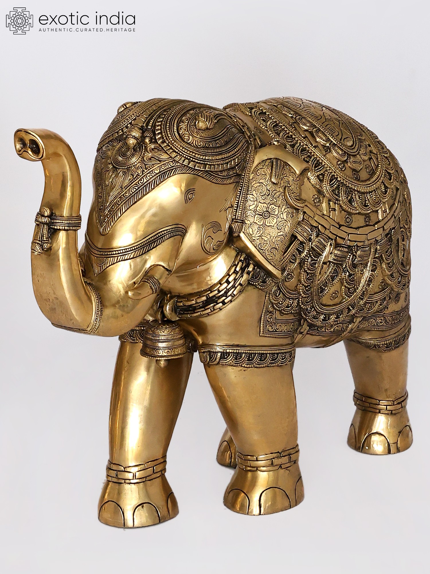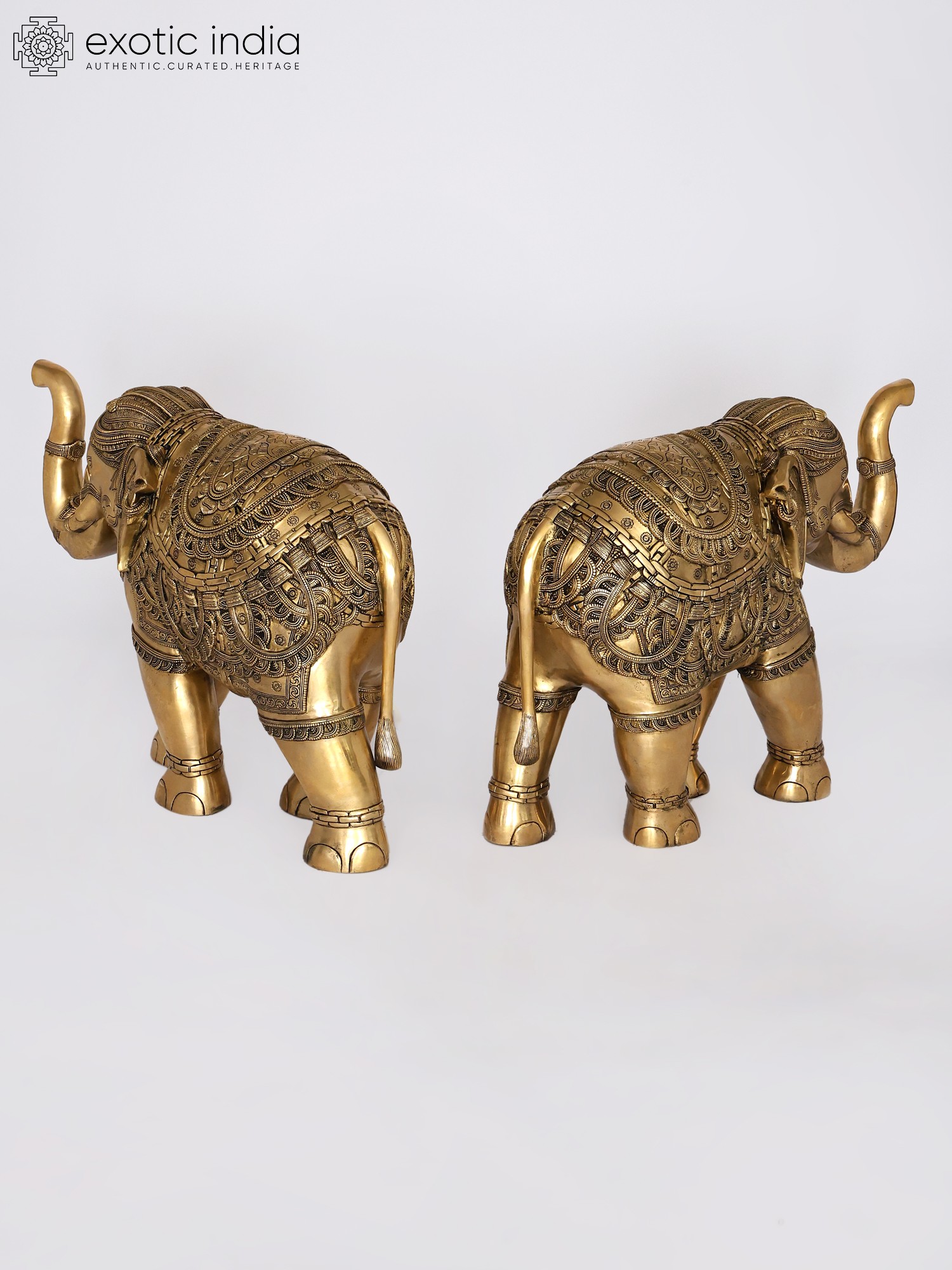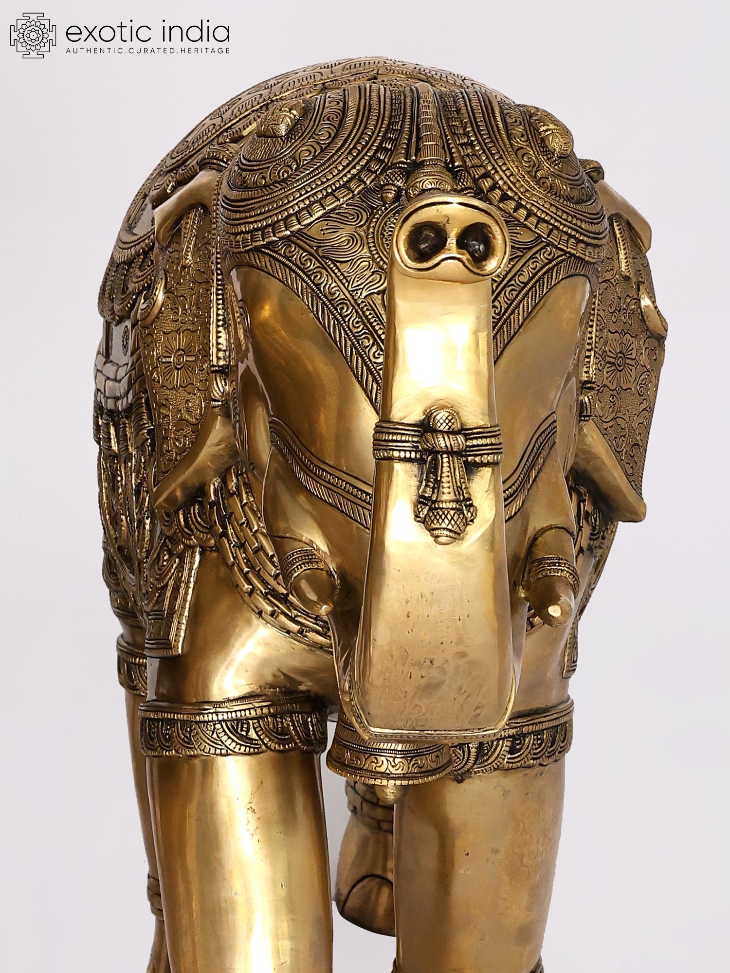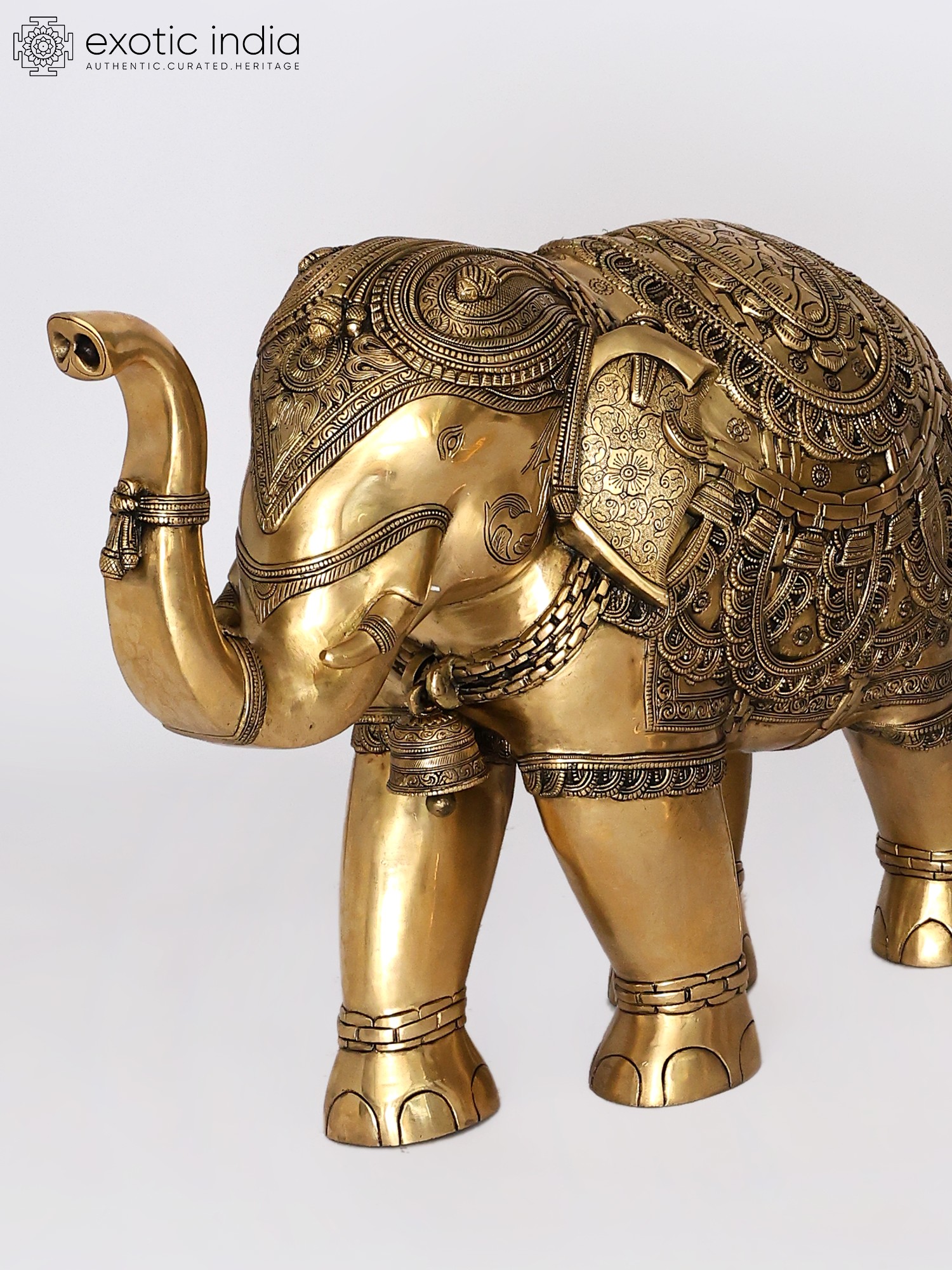 These excellent brass-pieces, representing a pair of elephants, exactly identical, depict on the one hand this great massive tradition of elephant related myths, legends and auspices, and on the other, two finest jewels, which a jeweler could carve only in gold like delicate metal. A divine composure and celestial calm define the faces of this mythical animal. Each of them has been saddled with Mughalia grandeur and taste. The adornment, consisting of various kinds of ornaments, the frills of bells in particular, is simply superb. Every motif and design has been carved with a jeweler's finess and finish. The ornamentation does not restrict to only head and back but extends to feet, trunk and tusk. The ears have on them large karna-phools, the ornaments with flower-like shape and the tusks, rings with multiple coils. The trunk has a gold frill towards its end and a beautiful ornament on its upper side. The head dress is unique in its splendour, lustre and details. Two oval loops flank on both sides towards the ears and an angular one, in the centre, descends down the trunk. The central one has superimposed on it a large rib type ornament, consisting of gold and beautiful details, and two banana-flower type motifs on side loops. A couple of chains suspend from their necks and terminate with a large bell below. The saddle is another most elaborate feature of their ornamentation. It covers almost the entire upper part and the hips of the animals. The ornamentation goes down the feet, which have been adorned with beautiful girdles around them.