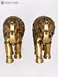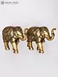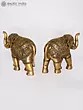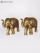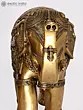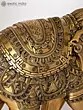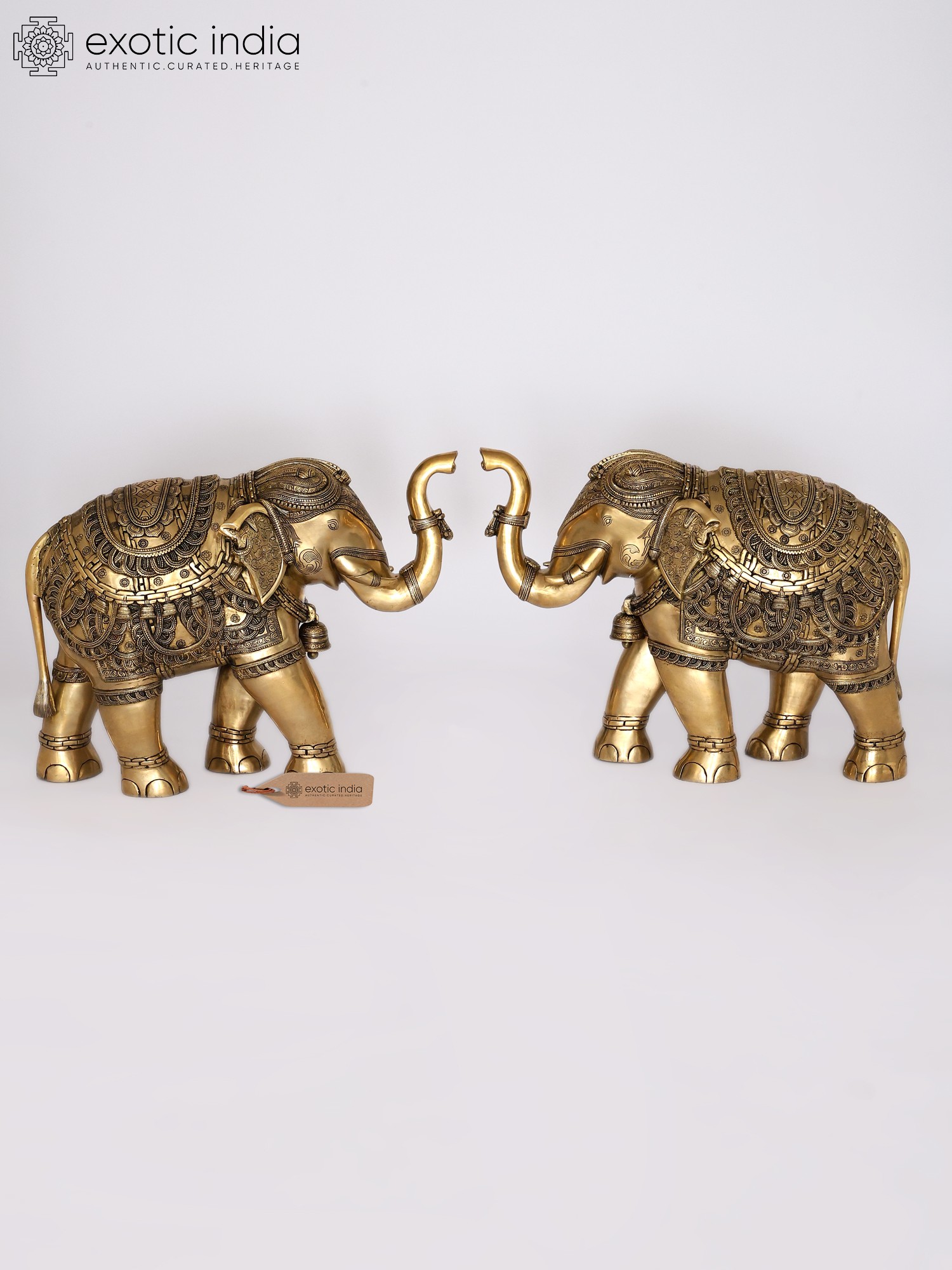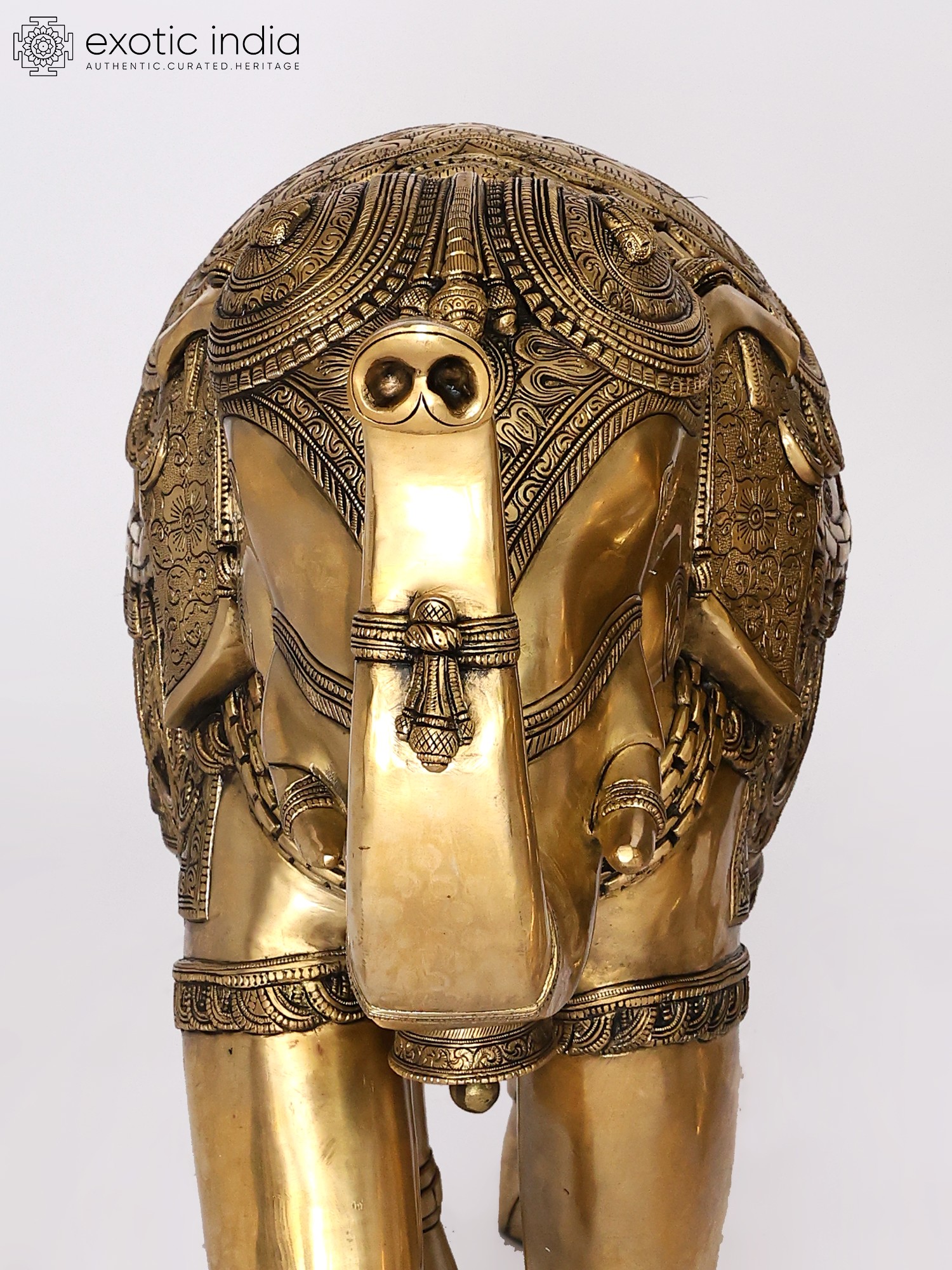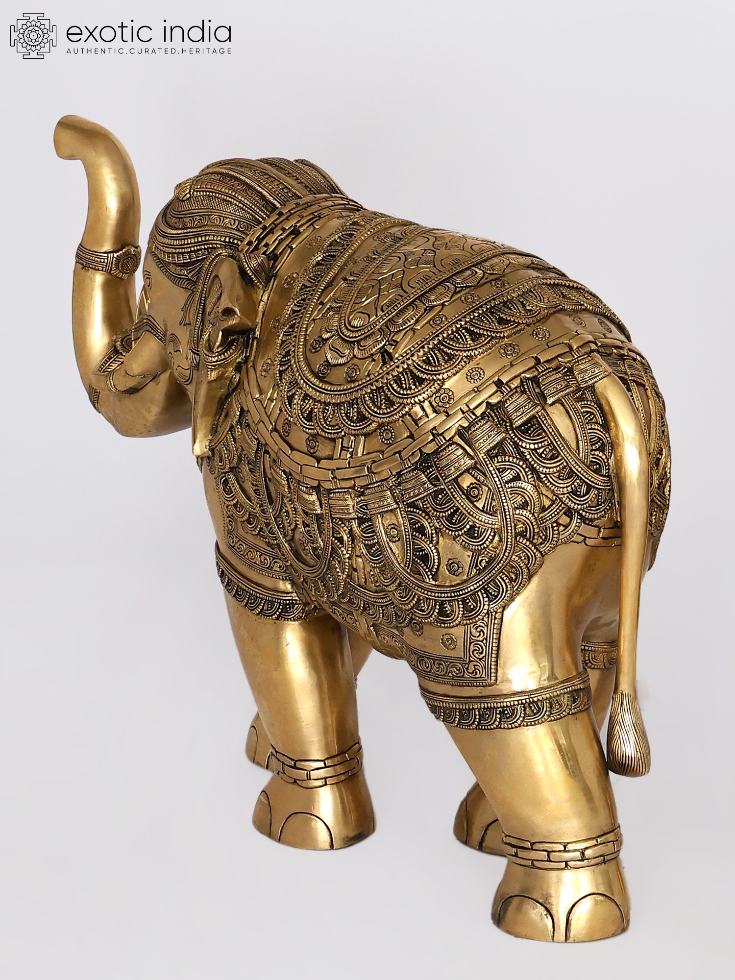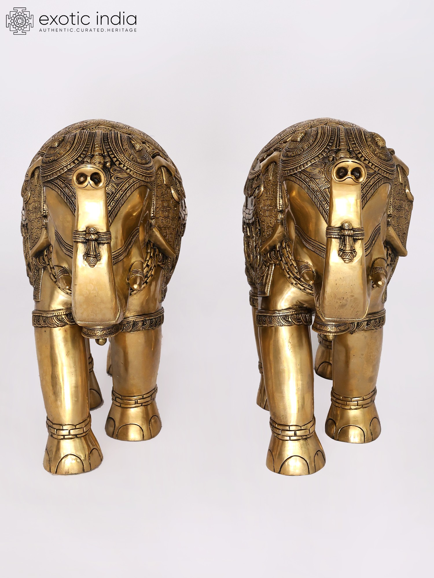 These excellent brass-pieces, representing a pair of elephants, exactly identical, depict on the one hand this great massive tradition of elephant related myths, legends and auspices, and on the other, two finest jewels, which a jeweler could carve only in gold like delicate metal. A divine composure and celestial calm define the faces of this mythical animal. Each of them has been saddled with Mughalia grandeur and taste. The adornment, consisting of various kinds of ornaments, the frills of bells in particular, is simply superb. Every motif and design has been carved with a jeweler's finess and finish. The ornamentation does not restrict to only head and back but extends to feet, trunk and tusk. The ears have on them large karna-phools, the ornaments with flower-like shape and the tusks, rings with multiple coils. The trunk has a gold frill towards its end and a beautiful ornament on its upper side. The head dress is unique in its splendour, lustre and details. Two oval loops flank on both sides towards the ears and an angular one, in the centre, descends down the trunk. The central one has superimposed on it a large rib type ornament, consisting of gold and beautiful details, and two banana-flower type motifs on side loops. A couple of chains suspend from their necks and terminate with a large bell below. The saddle is another most elaborate feature of their ornamentation. It covers almost the entire upper part and the hips of the animals. The ornamentation goes down the feet, which have been adorned with beautiful girdles around them.