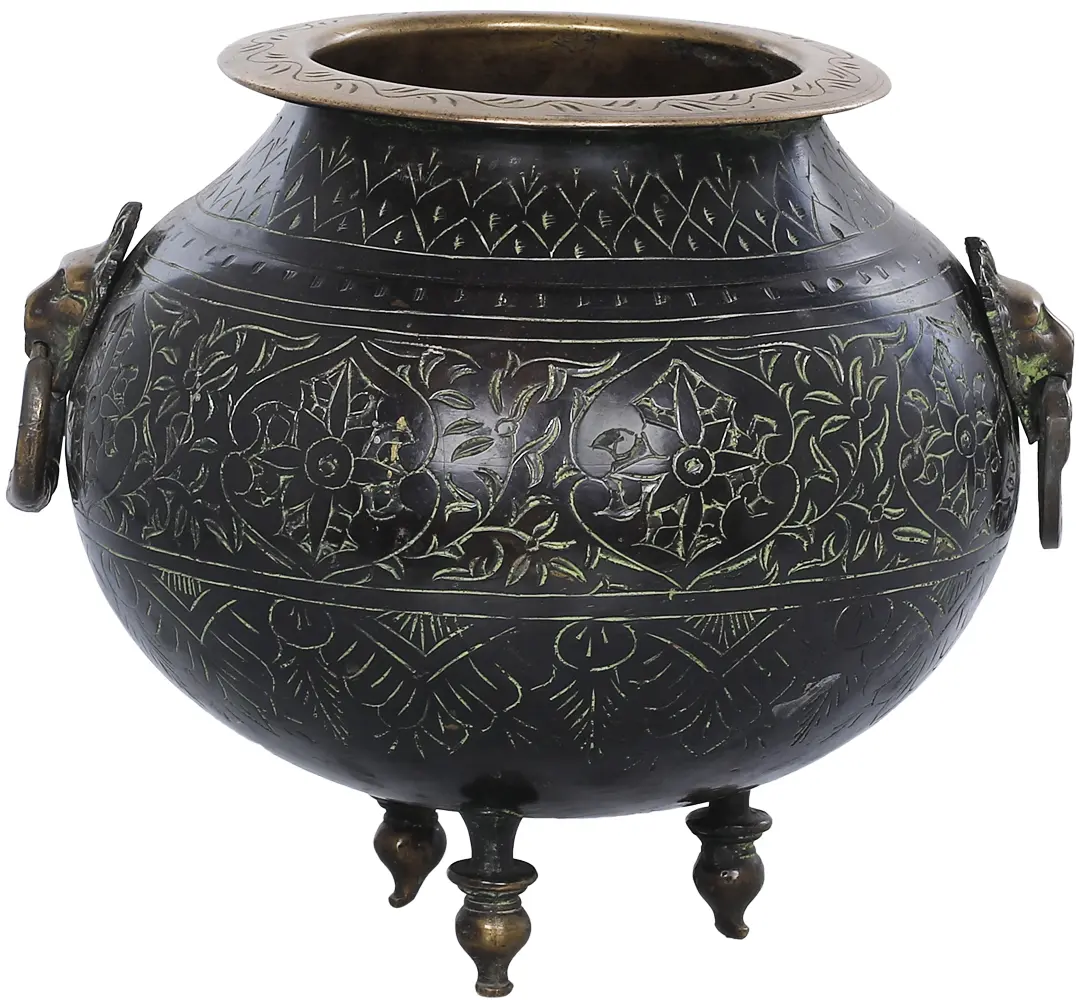 The true beauty of this object lies in the meticulous attention to detail. Notice the delicate patterns etched across the surface, reminiscent of ancient artistry. These patterns create a visual tapestry that is both captivating and sophisticated. The handles, crafted in the likeness of majestic lion heads, exude strength and nobility. Each handle is complete with a striking ring, adding a touch of classical grandeur. This level of artistry elevates this object from a simple decorative piece to a work of art.