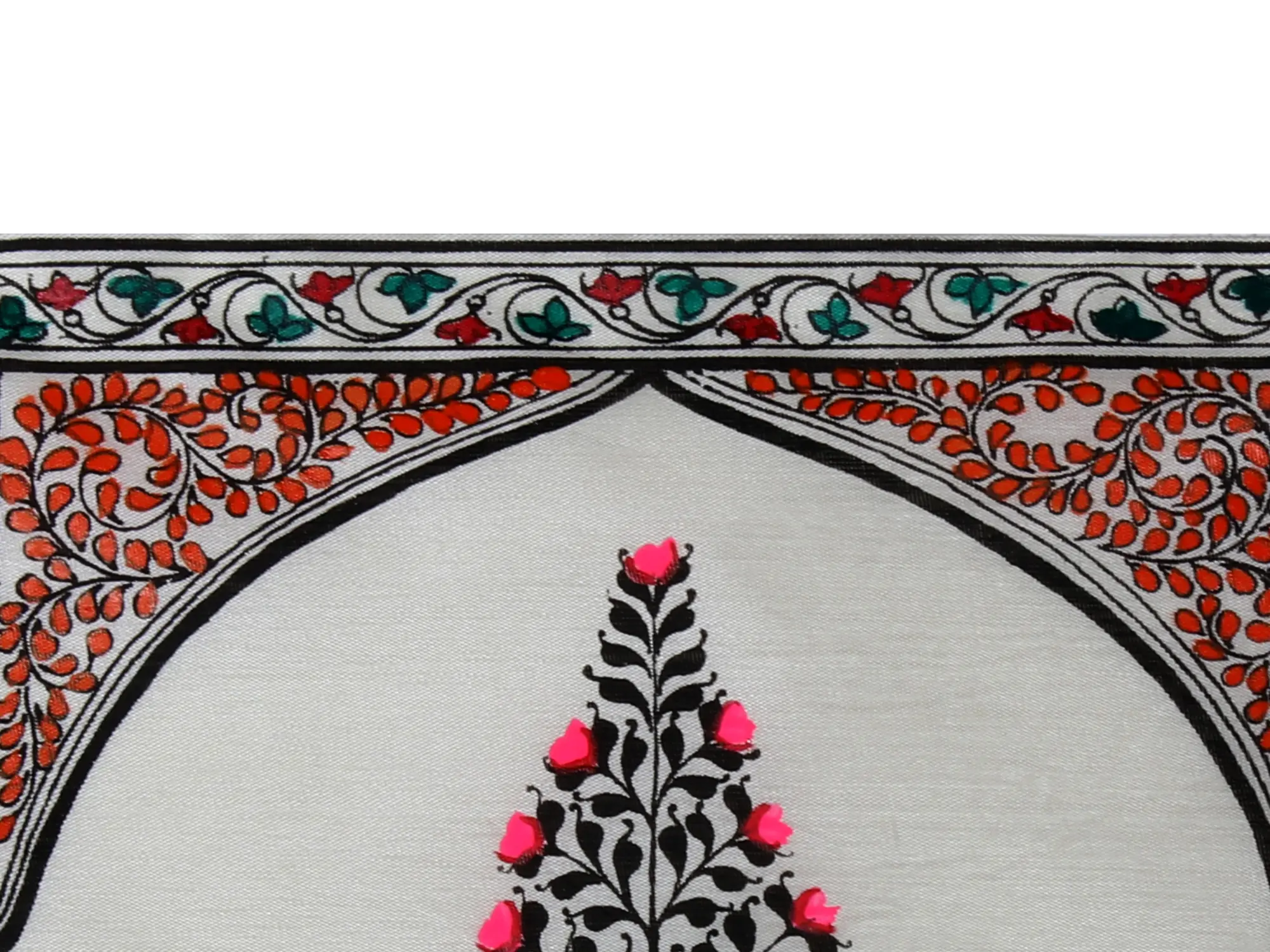 What truly sets this painting apart is the lively accent of fuchsia pink buds or blossoms scattered throughout the tree's canopy. These vibrant touches of color bring the artwork to life, suggesting the perpetual cycle of nature and the promise of bloom. The contrast between the deep black foliage and the bright pink accents is visually arresting, drawing the eye and creating a dynamic focal point for any room. The artistry extends beyond the central tree, with a beautifully detailed border framing the composition. This border features intricate floral and vine patterns, incorporating a palette of deep reds, forest greens, and subtle earthy tones, all meticulously outlined in black, adding depth and a sense of regal elegance.