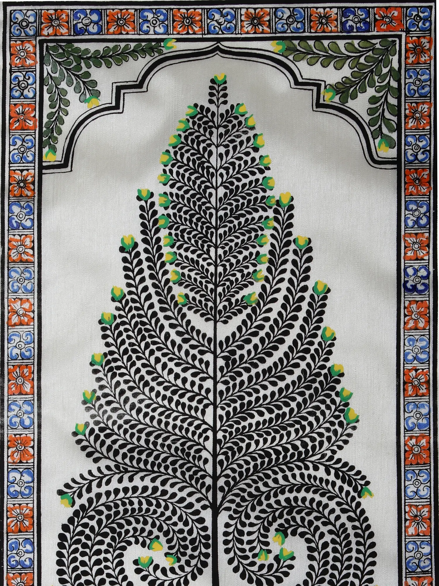 The artistry extends beyond the central tree to the intricate borders that frame the composition. A detailed, repeating pattern of floral motifs in warm oranges, deep blues, and earthy tones creates a captivating visual rhythm. These borders are not merely decorative; they add depth and a sense of completeness to the artwork, drawing the viewer's eye across the entire piece. The subtle arch at the top of the painting further enhances its aesthetic appeal, suggesting a sense of sacredness or a gateway to a serene natural world.