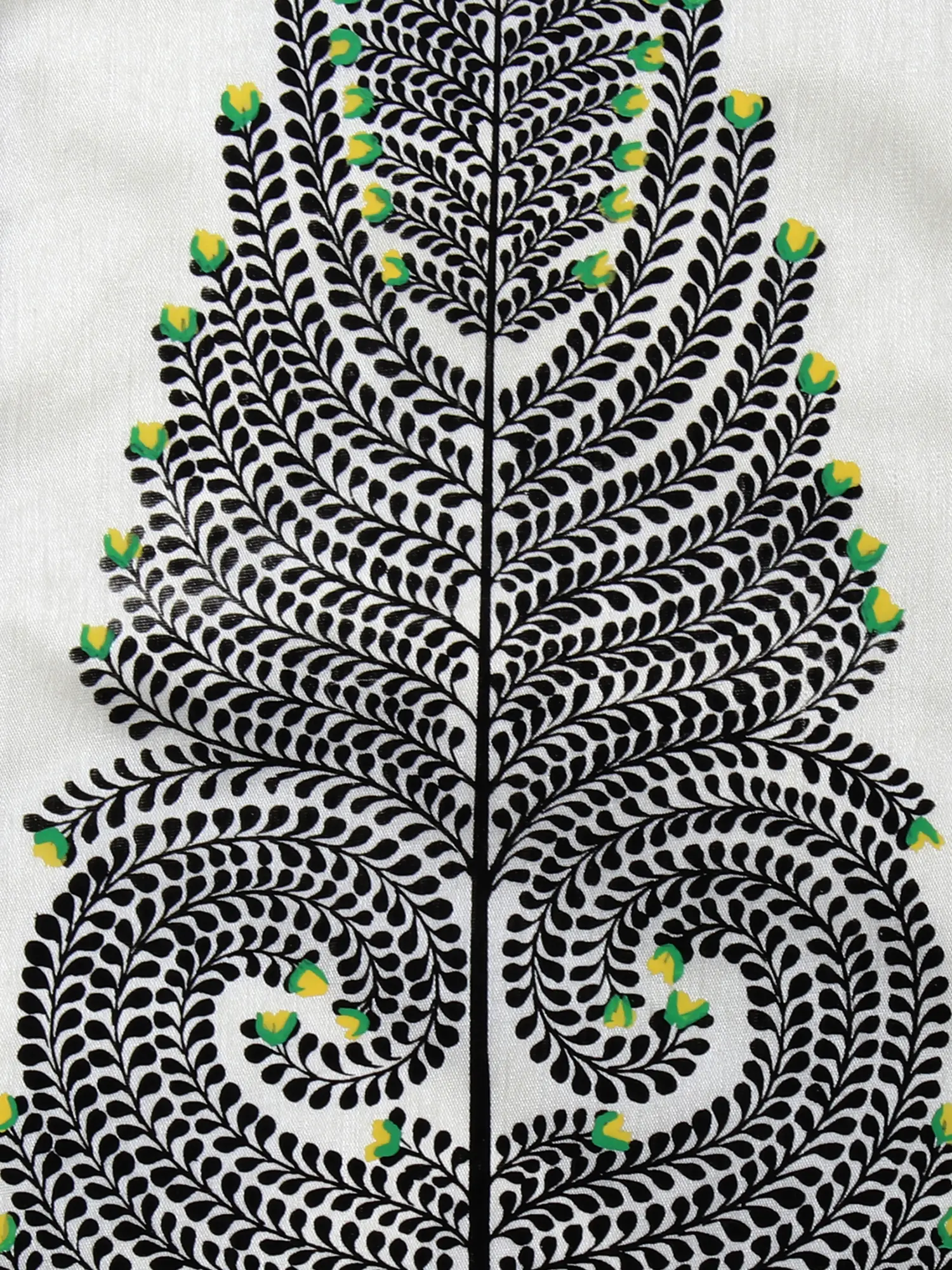 This exquisite piece is a testament to the rich artistic heritage of India, specifically originating from the vibrant state of Orissa. Crafted using the traditional Paata painting technique, this artwork brings the timeless beauty of nature into your living space. The central motif is a meticulously rendered tree, its branches reaching upwards and outwards, adorned with delicate leaves and subtle hints of green buds, evoking a sense of growth and vitality. The deep black of the leaves and branches contrasts beautifully with the creamy, neutral background, making the imagery pop with understated elegance.