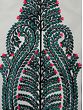 At the heart of this painting lies a stylized tree, a universal symbol of life, growth, and prosperity. The deep emerald green leaves are rendered with a delicate, almost calligraphic precision, creating a lush and full canopy. These verdant leaves are punctuated by vibrant pops of fuchsia pink, evoking the imagery of blossoms or fruits, adding a lively contrast to the predominantly green palette. The trunk and branches are depicted in a strong, central black, grounding the composition and providing a striking backdrop for the abundant foliage. The overall design is harmonious and balanced, drawing the viewer's eye upwards through the ascending branches.