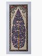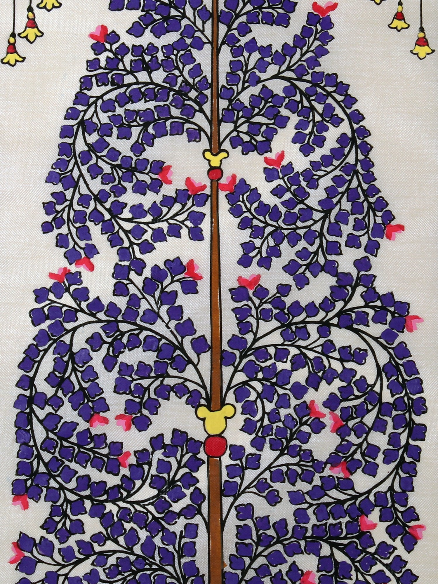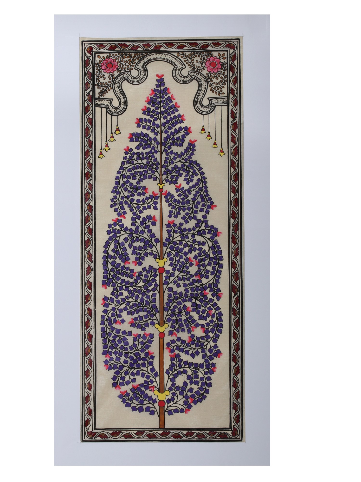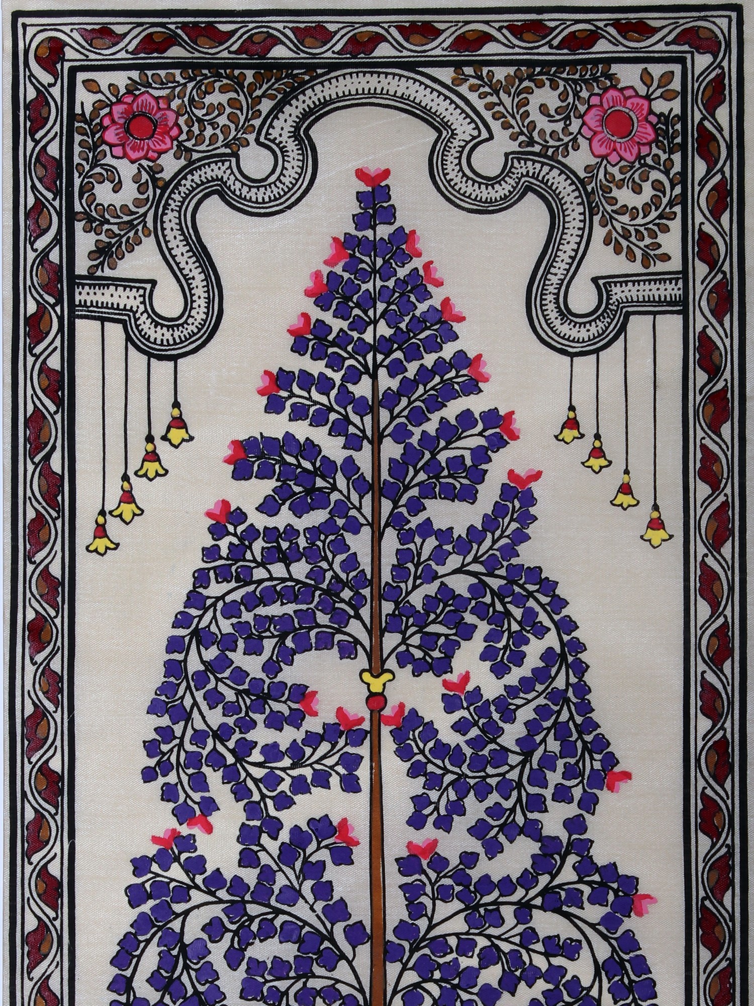 The background of the painting is a soft, creamy hue, providing a serene canvas that allows the intricate details of the tree to truly stand out. A decorative border frames the artwork, adding a layer of visual sophistication. This border features a complex interplay of patterns, with alternating bands of deep maroon and black, interspersed with an elegantly scrolling vine motif. At the very top of the painting, a classical arch-like design is incorporated, adorned with a single, striking pink flower, further enhancing the artistic depth. Suspended from this arch are small, bell-shaped ornaments in bright yellow, each outlined in black, adding a whimsical touch and a playful sense of movement.