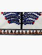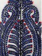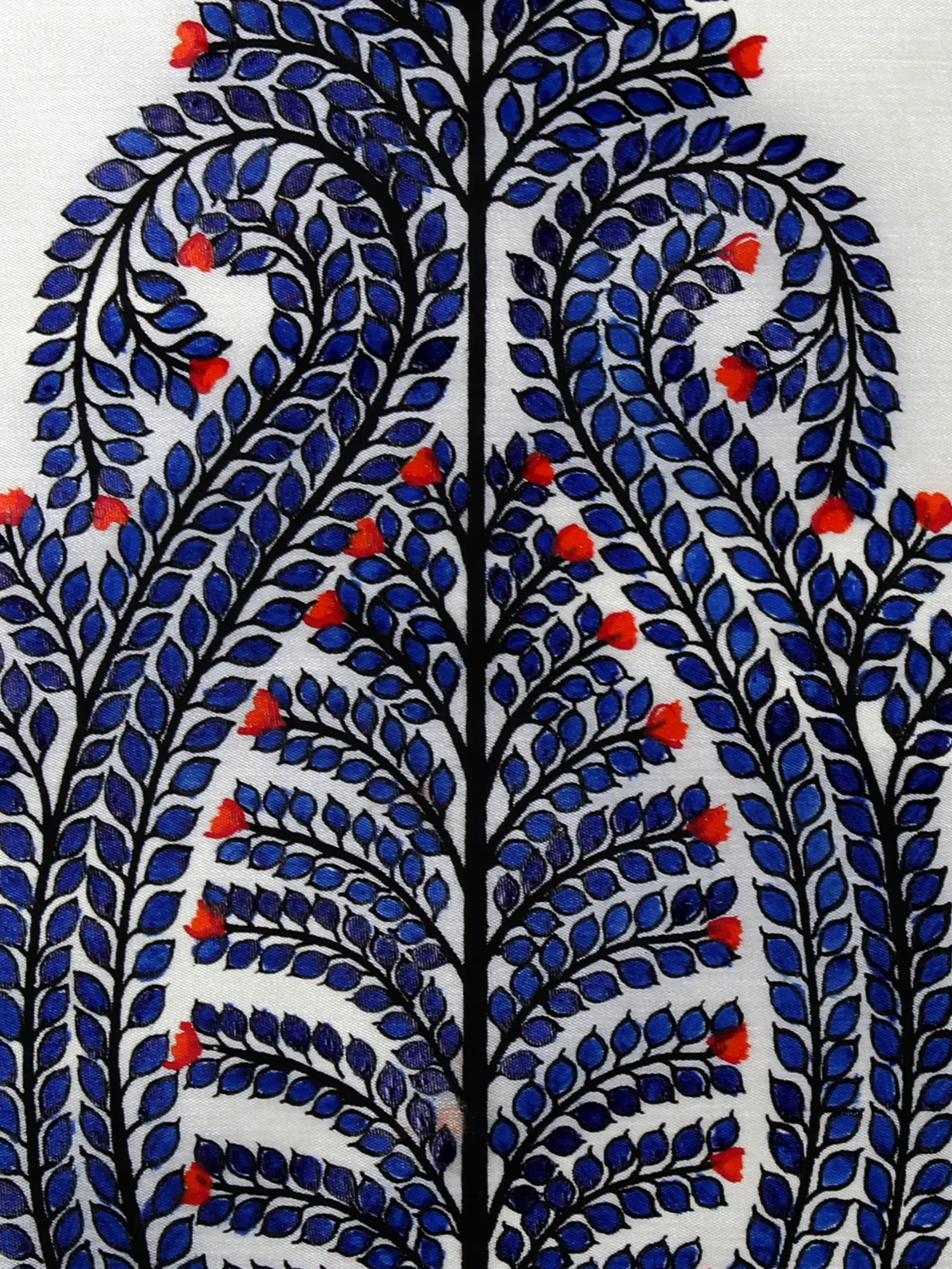 At the heart of this artwork lies a majestic tree, rendered in a striking palette of deep blues and vibrant reds. The tree's branches are adorned with countless stylized blue leaves, each one meticulously painted to convey a sense of lushness and vitality. Nestled amongst the foliage are small, fiery red blossoms, adding pops of intense color and creating a visual rhythm that draws the eye across the canvas. The deep blue of the leaves suggests tranquility and depth, while the bright red accents evoke energy and passion. The overall composition is balanced and harmonious, creating a visually arresting focal point for any room. The background is kept elegantly simple, allowing the intricate details of the tree to take center stage.