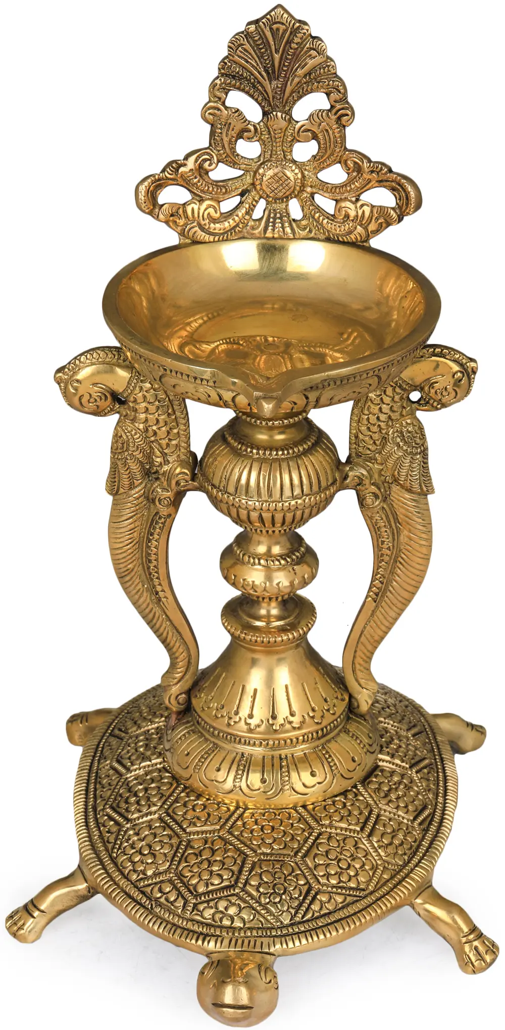 This unique brass Vastu lamp is made in three parts by an expert craftsman. The base is a beautifully carved turtle having a snake-like mouth, eyes, nostrils, legs, and a small tail. Second, the three-domed- pillars, standing over the tortoise with eye-catching engraving, two attractive parrots, one each on both sides are hung. And then, the third part is an attractive one-wick lit plate to keep oil crowned with a geometric curtain. It is a very delightful tall lamp that will enhance the decor of your pooja room.