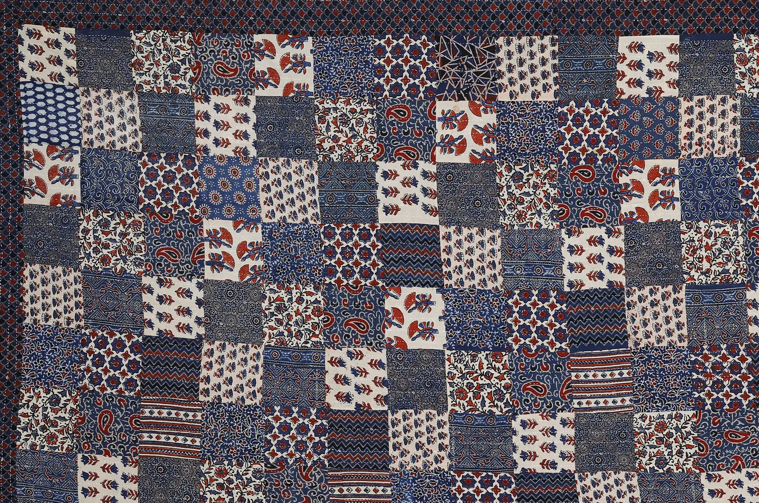 Design-Blue Printed Reversible Bedspread from Jaipur with Patchwork and Kantha Stitch Embroidery