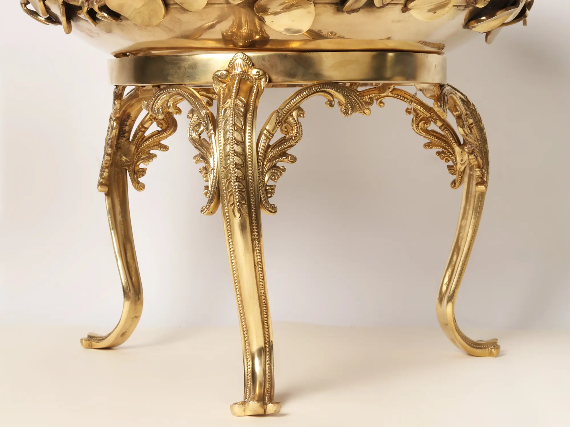 This exquisite Urli, perched on a brass pedestal with ornate legs, transforms into a stunning exhibition of artistry and elegance. The stand itself has finely constructed legs with decorations that provide a touch of richness to the whole. The body of the Urli is ornamented with a chain of Plumeria leaves that have been painstakingly plastered onto the surface. The Plumeria leaves add a one-of-a-kind and ethereal beauty to the Urli, producing a beautiful visual effect. The ornate legs of the brass stand and the Plumeria leaves on the Urli's body make a beautiful composition that blends workmanship and nature-inspired beauty in a genuinely stunning way.