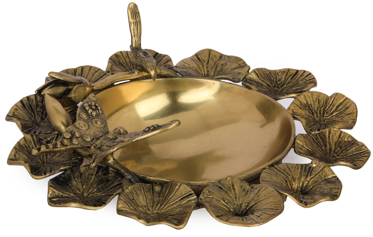 This brass Urli with a simple main body combines symbolic elegance with simplicity. The main body of the Urli features a simple and modest design that highlights the inherent beauty of brass. Exquisite lotus leaves bloom gracefully atop the Urli's peak, symbolizing purity and enlightenment. A lovely lotus blossom blooms among the lotus leaves, symbolizing beauty and spiritual enlightenment. A gorgeous butterfly quietly perches on the lotus, symbolizing metamorphosis and freedom while also giving a whimsical touch. With its basic design, decorated with lotus leaves, a blossoming lotus, and a delicate butterfly, this lovely brass Urli ensemble exudes a serene and appealing presence, inviting spectators to experience the harmonious marriage of nature and art.