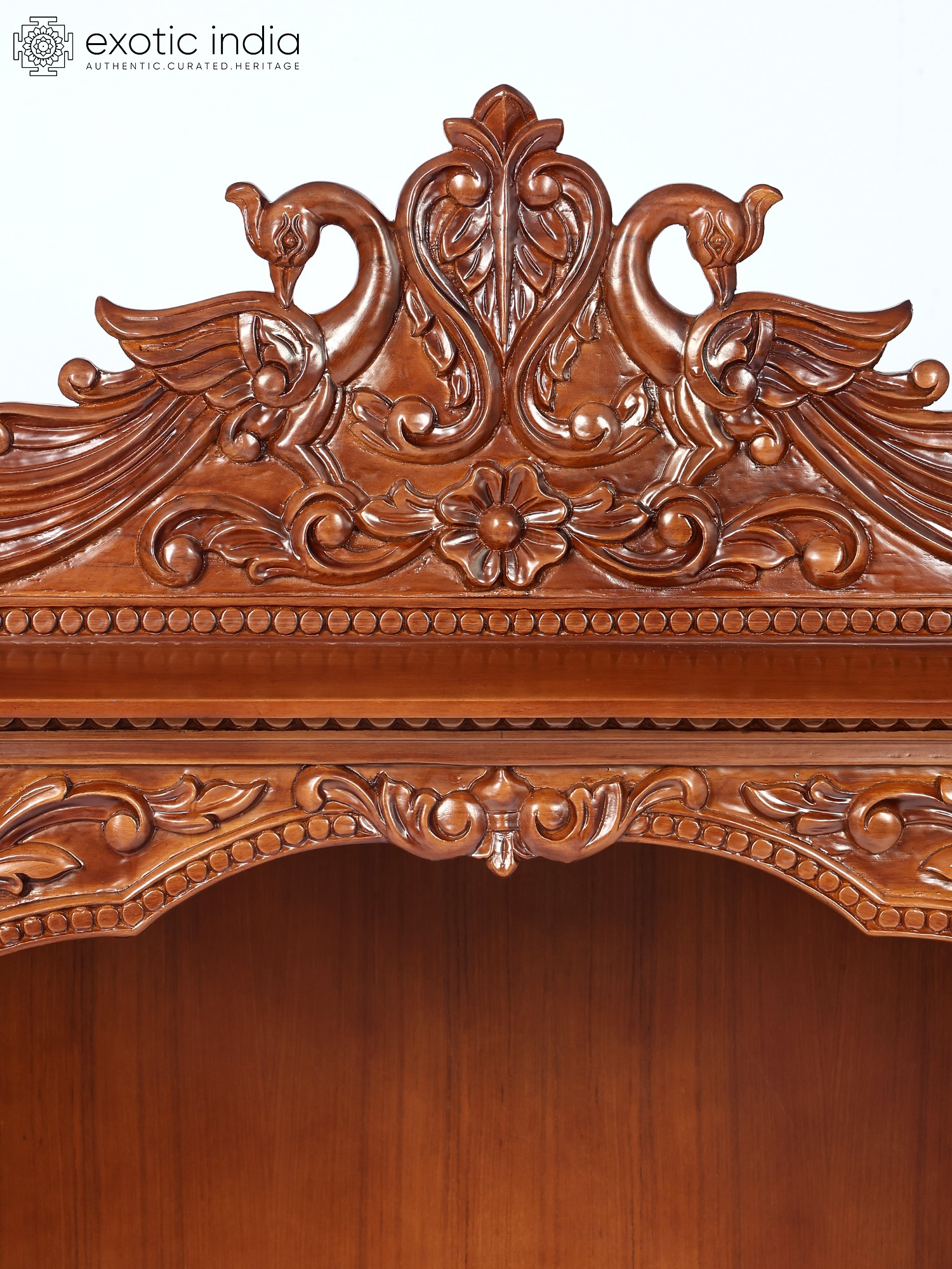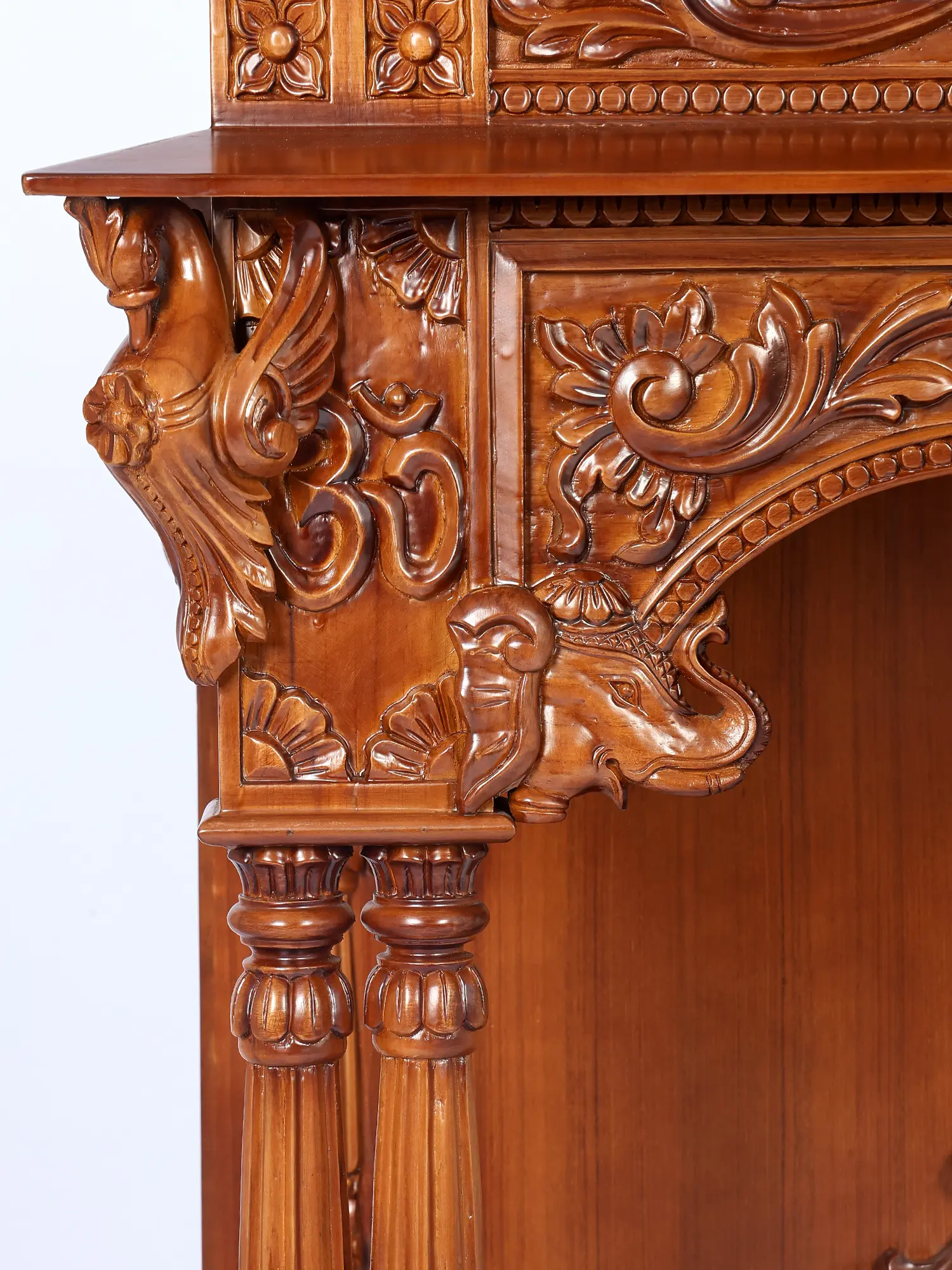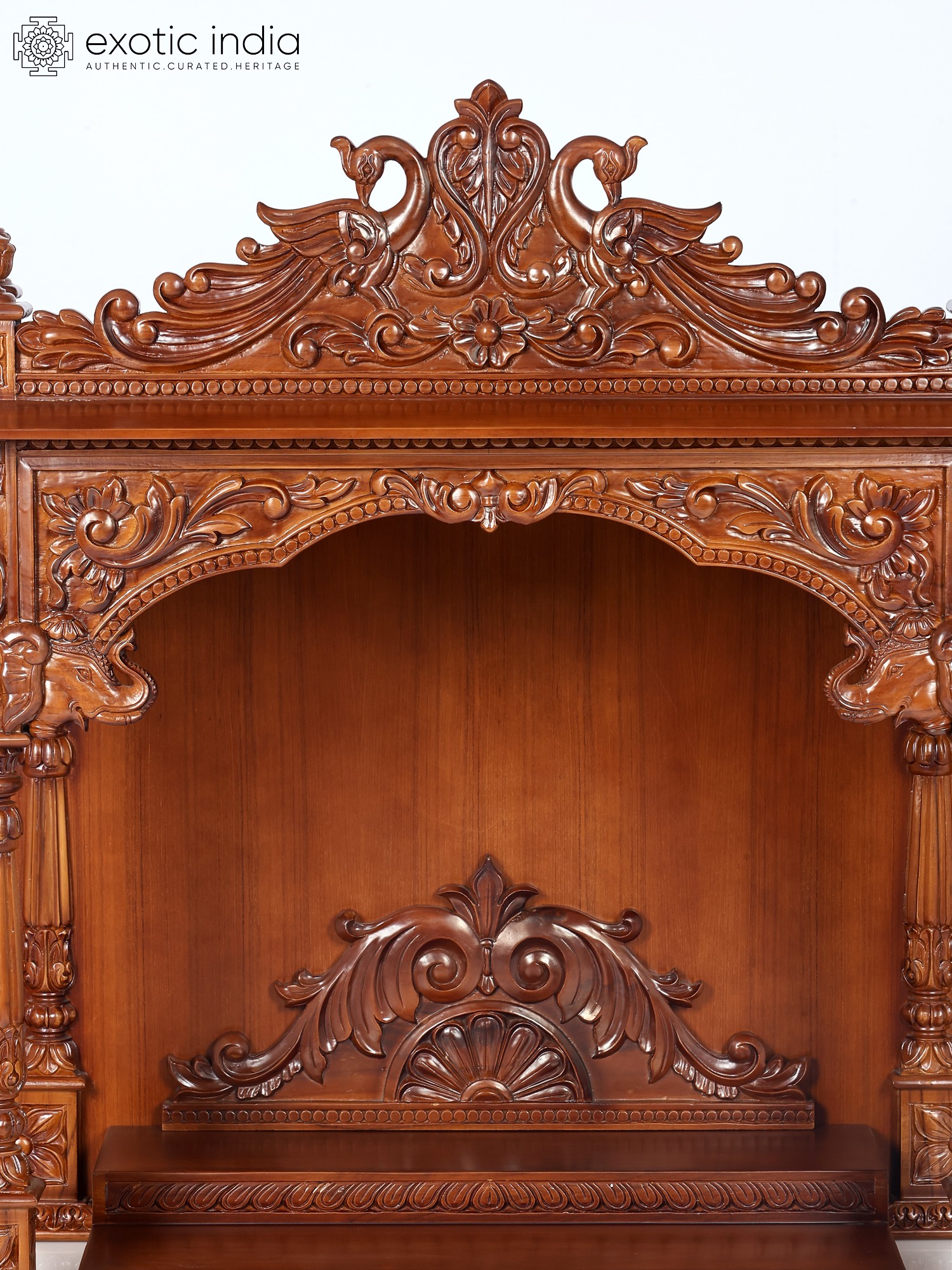 You'll appreciate the grand stature of this piece, standing at an impressive 45 inches tall, commanding attention without overwhelming your space. The generous width and depth, measuring 36 inches by 18.5 inches respectively, provide ample room for your cherished deities and devotional items. The ornate carvings, featuring motifs of nature and auspicious symbols, flow seamlessly across its surfaces, creating a visual symphony of artistry.
