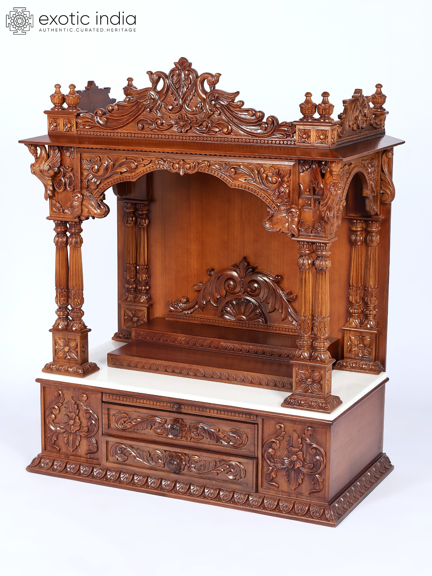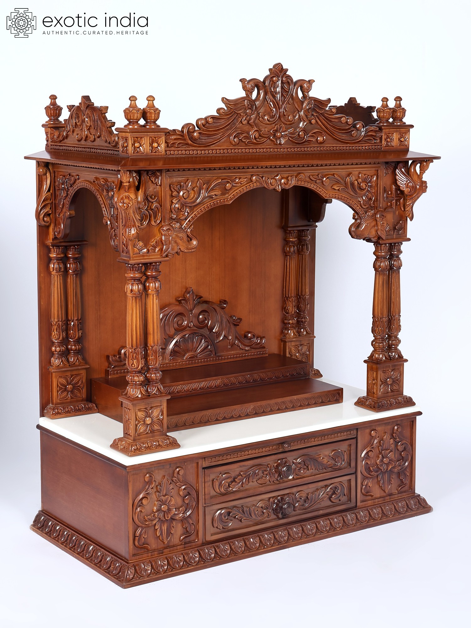 Designer Wooden Puja Mandir - 54 Inch with Marble Top & Storage