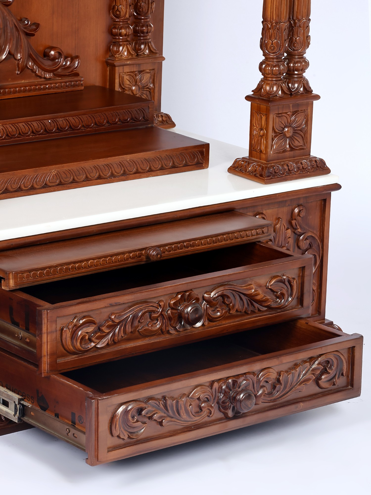Equipped with double drawers for organized storage of puja accessories and essentials.