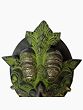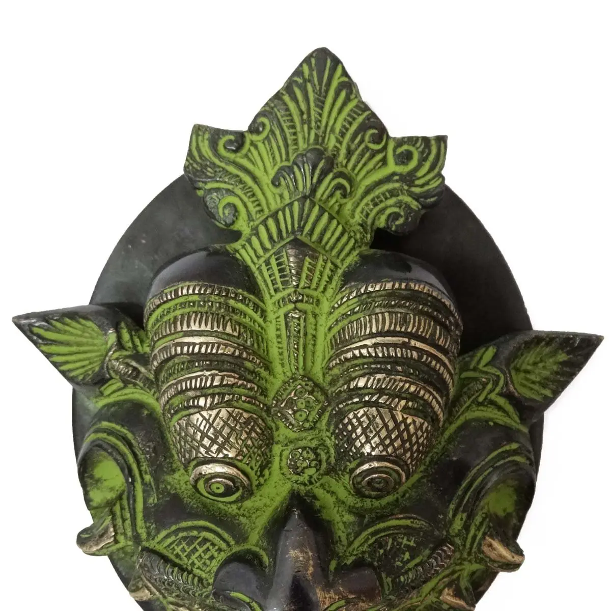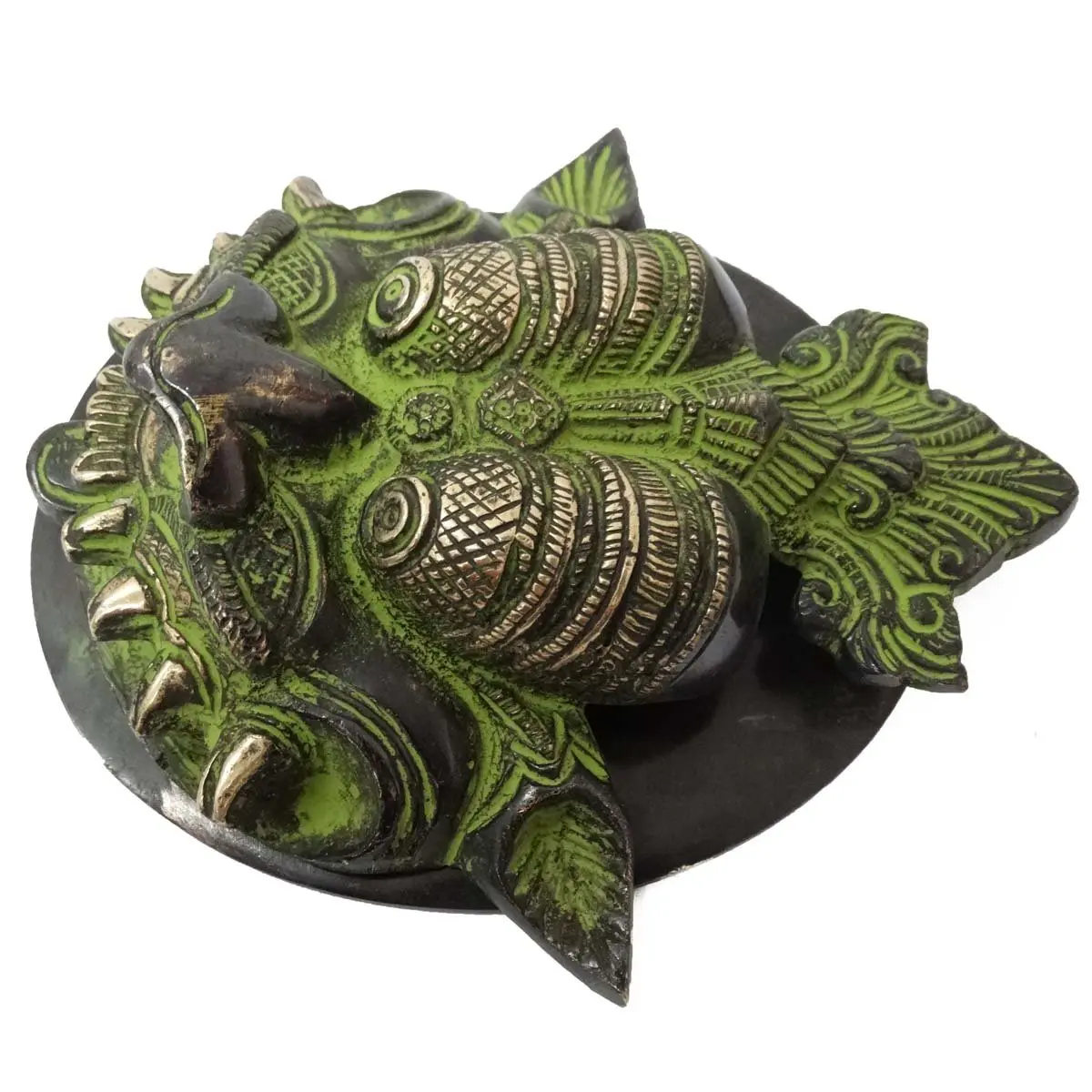 The surface showcases a captivating combination of textures and finishes. Note the meticulous craftsmanship evident in every curve and contour, from the stylized brow to the menacing teeth. The interplay of light and shadow across the brass surface accentuates the depth of the design, creating a dynamic visual experience. The distressed, aged patina adds character and an antique feel, making it seem as though it has guarded doorways for centuries. The detailed metal work adds character and charm. It is an interesting piece of art.