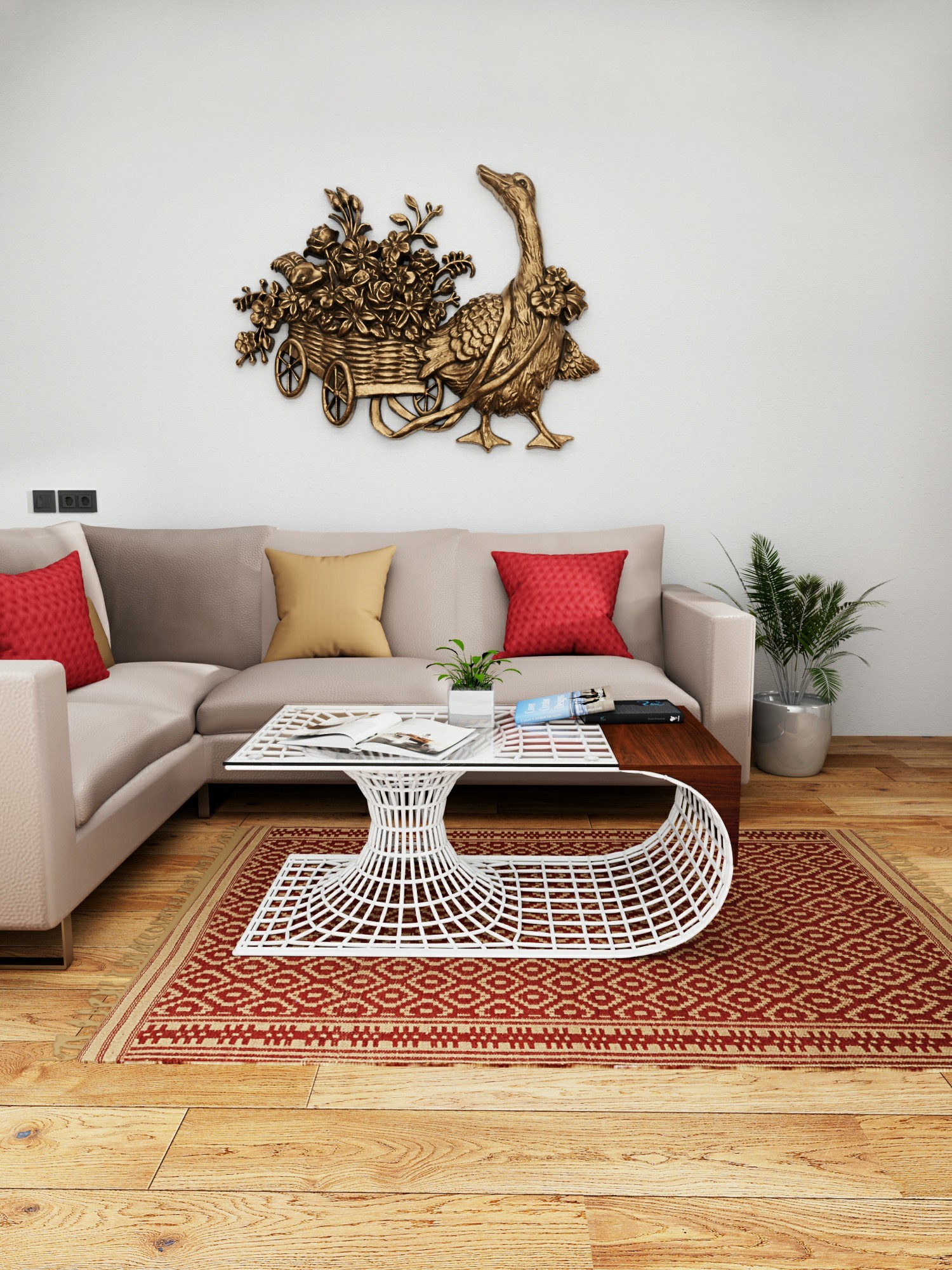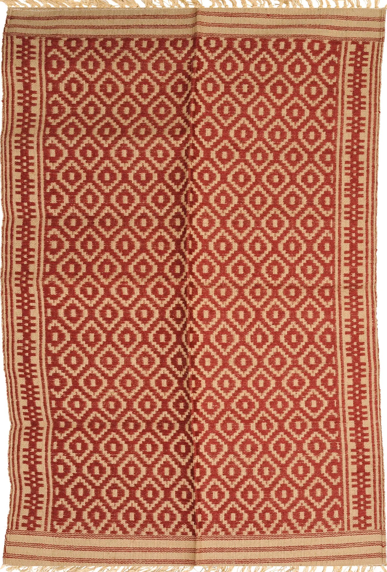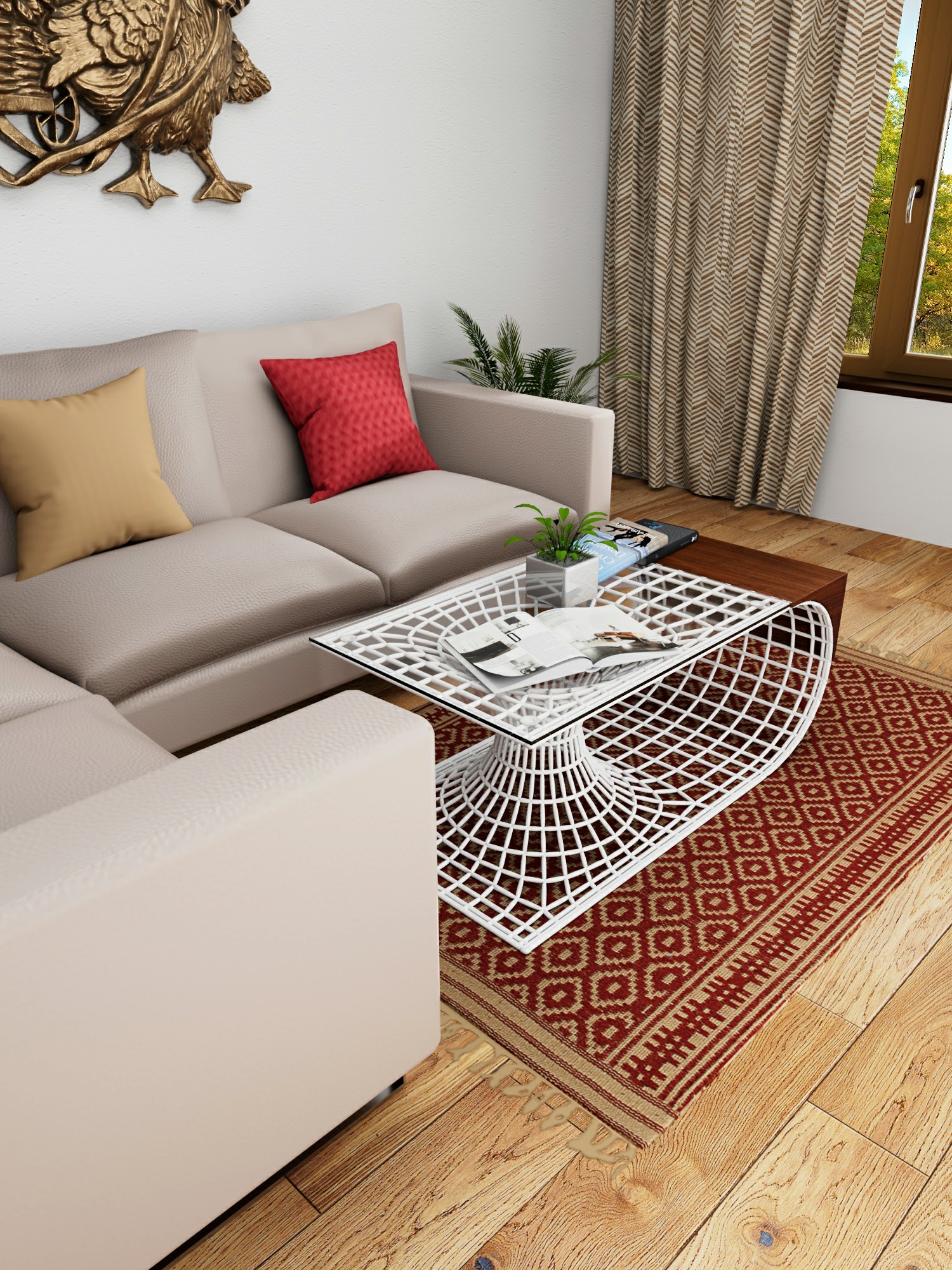 This one-of-a-kind dhurrie from the Exotic India collection comes in a variety of pastels, each of which will charm you over the other. Fashioned from the strongest, most durable variety of jute, the backdrop is of a characteristic pale brown colour. The striped and patterned edges, as well as the diamond-shaped booties across the fabric, have been woven in Telangana by hand.