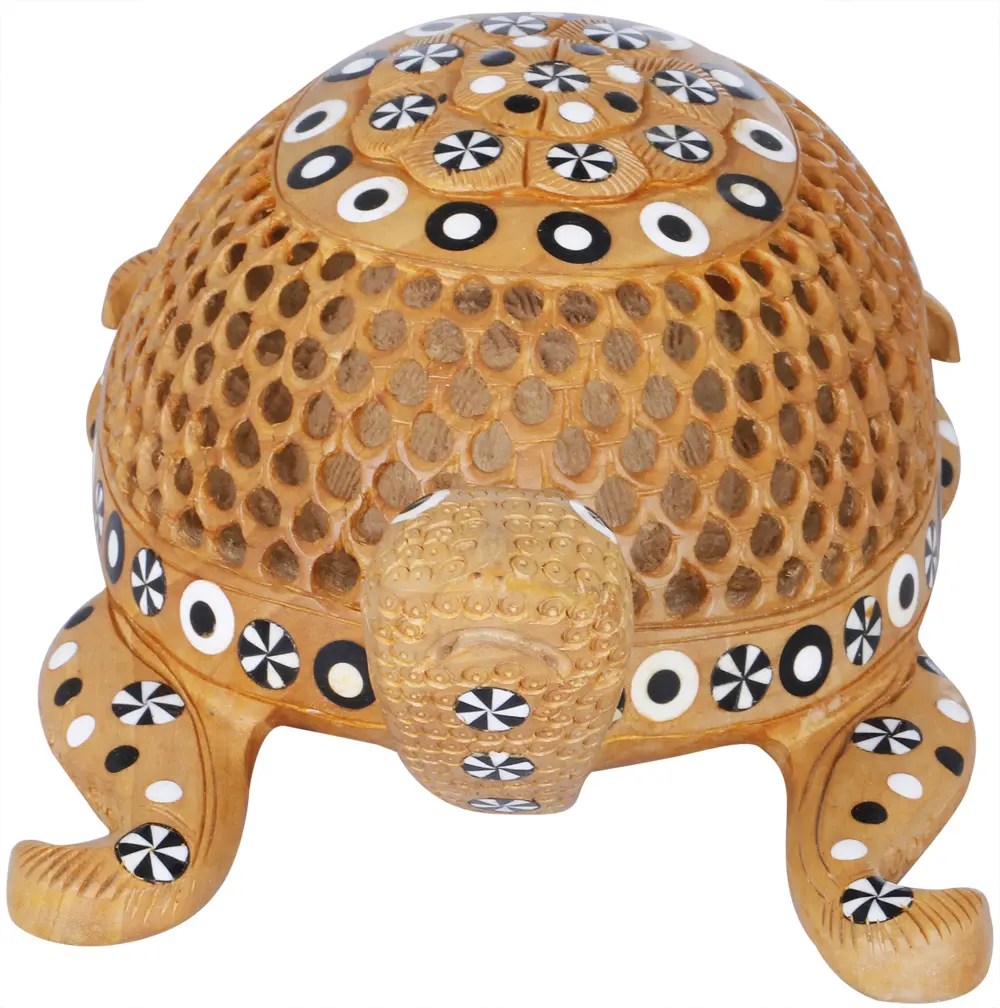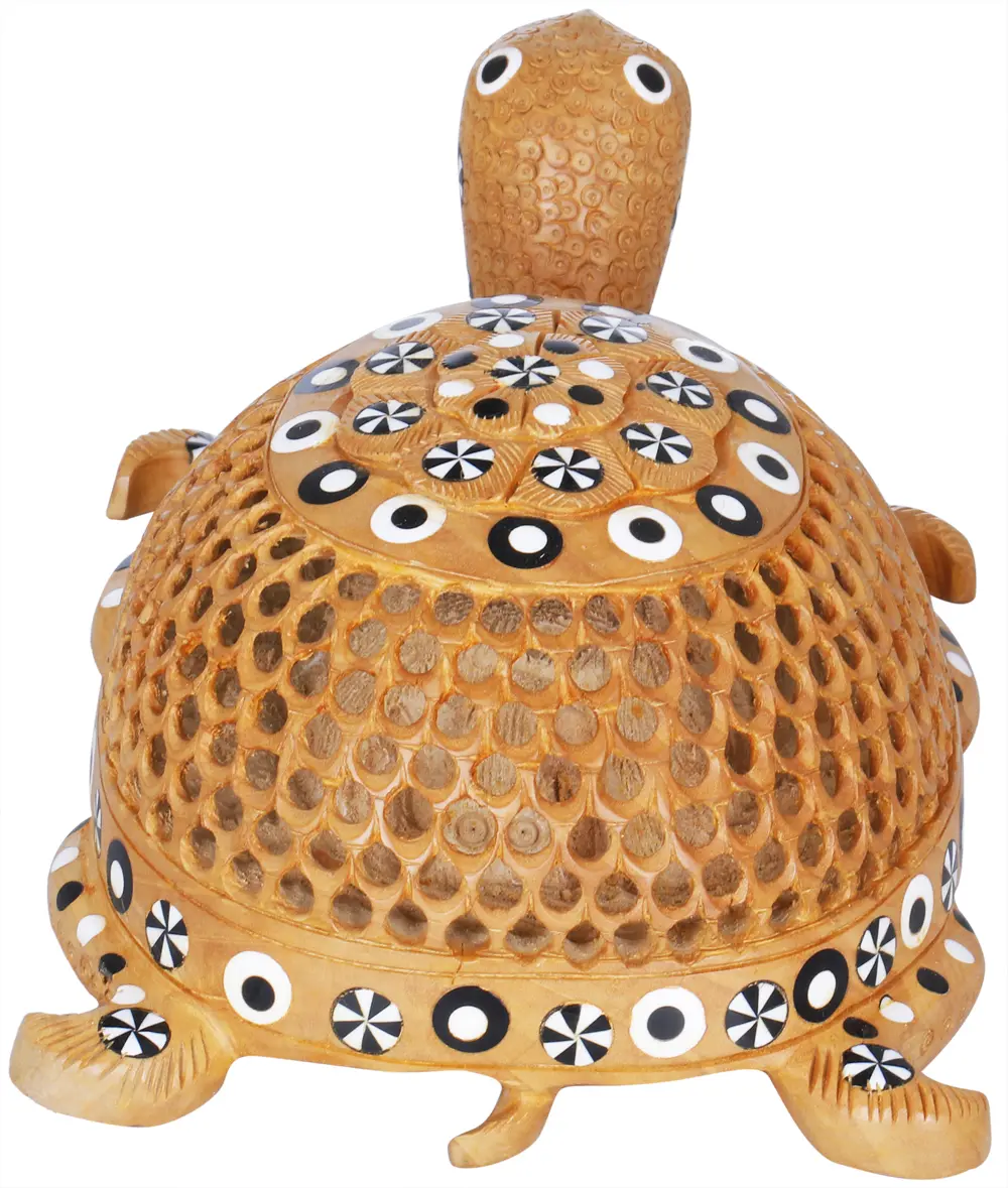 The intricate black and white flower- stars patterns and fine, symmetrical textures- print- engraving, highlighted and emphasized over the robust, round –dome-shaped shell of this charming wooden Vastu tortoise. The smiling Tortoise positioned on its club-like two forelegs and 'elephantine' hind legs. Additionally, the eyes, nose, elongated thick neck, and the natural color and grain of the wood have added warmth and depth, further enhancing its beauty, and creating a unique and visually striking artifice. The vastu tortoise engraved in wood could be a wonderful addition to your space, inviting positive effects.